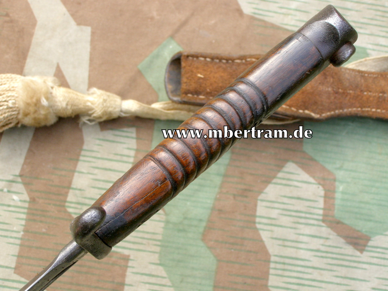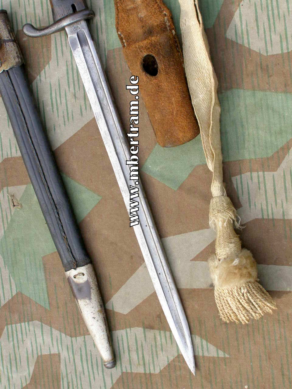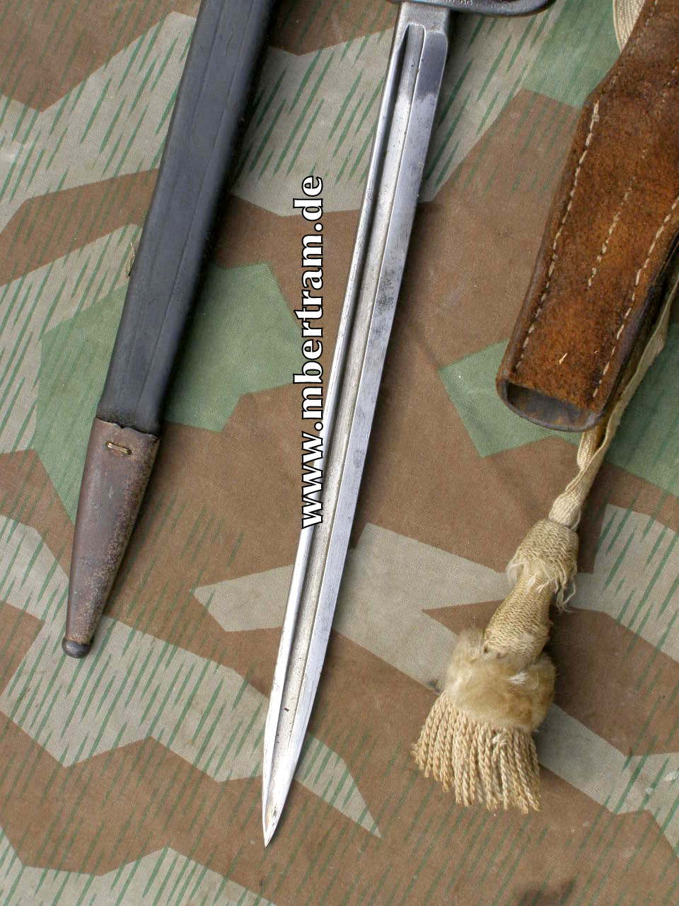 alter Art mit einteiliger Griffschale, DEUTSCHES Kaiserreich, mit Herstellermarke. Gut erhaltene Holzgriffschale. Griff mit minimalen Flugrostnärbchen. Größtenteils blanke Klinge mit 2 Abnahmestempeln und Zahl 02 für 1902 auf Rücken- gekürzte Version- . Schöner Zustand. Bajonettdrücker klappt. Mit Leder Scheide, mit Eisenbeschlägen. Eigentumsstück- Scheidenbeschläge vernickelt. 2 Klammern fehlen in Scheidenbeschlägen, sitzen aber gut fest, mit nur leichten wackeln. Klingenlänge ca. 29cm. Waffenlänge ca. 42,3cm. Brauner, Rauhlederkoppelschuh, auf Rückseite schwach Stemplung 1912 zu erkennen. weißer Troddel/ Leibkompanie. Parierstange gestempelt mit Regimentsstempel: "2.G.G.R.6.88". - Kaiser Franz Garde Grenadier Landwehr Rgt. 2. Bataillon ( Kassel ) . 6 Kompanie.- Waffe Nr. 88