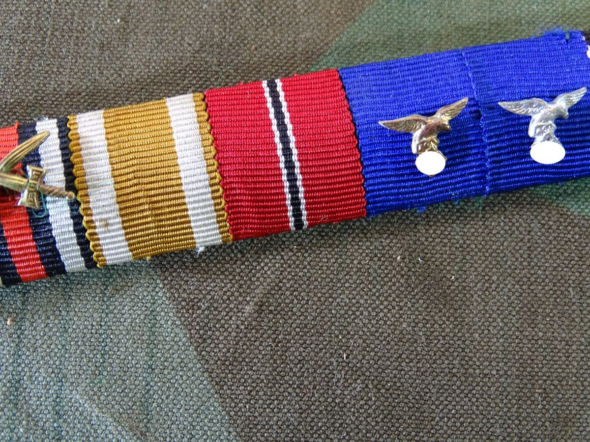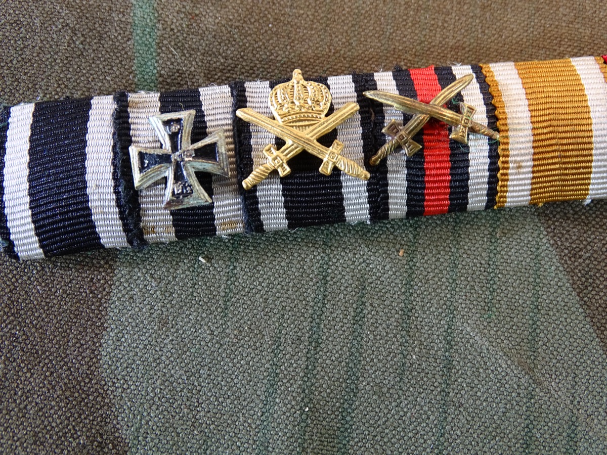 Sehr seltene, sehr lange Bandspange mit folgenden Auszeichnungen: Eisernes Kreuz 1. und 2. Klasse 1914, Hausorden von Hohenzollern- Ritterkreuz mit Schwertern, Ehrenkreuz f. Frontkämpfer mit Schwertern 1914-18 ,Schutzwall Ehrenzeichen, Ostmedaille, Luftwaffen Dienst Auszeichnung Silber und Gold, Medaille Oktober 1938, Zoll Grenzschutz Ehrenzeichen.