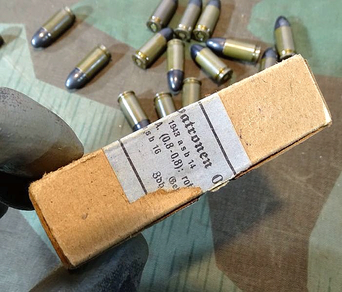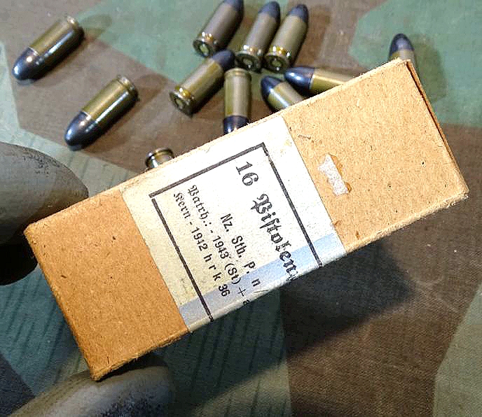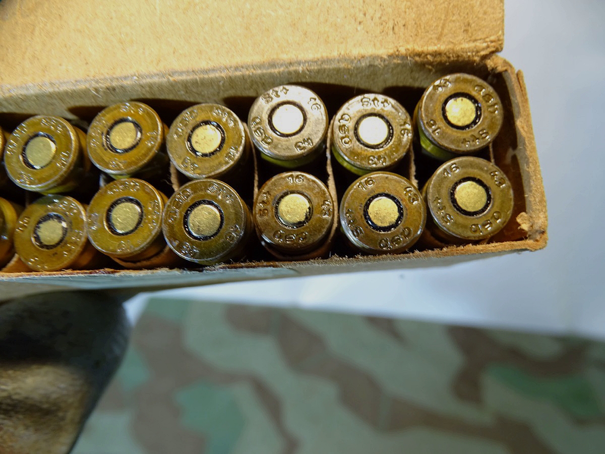 Produktinformationen "16 Deko Pistolen Patronen 08, alle ( nrgl.) asb 1943 gestempelt, mit Originalschachtel, 2. Weltkrieg, "