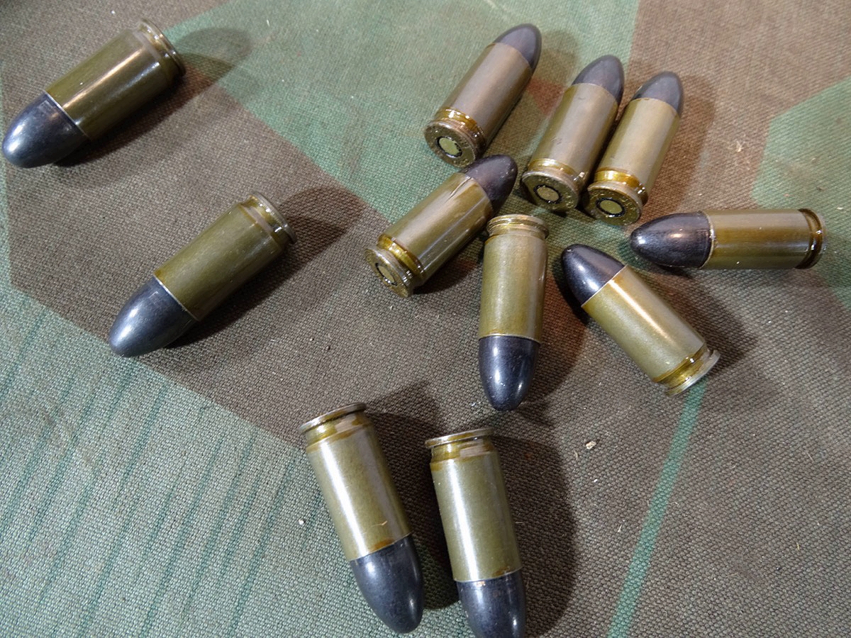 16 Deko Pistolen Patronen 08, alle ( nrgl.) asb 1943 gestempelt, mit Originalschachtel, 2. Weltkrieg,