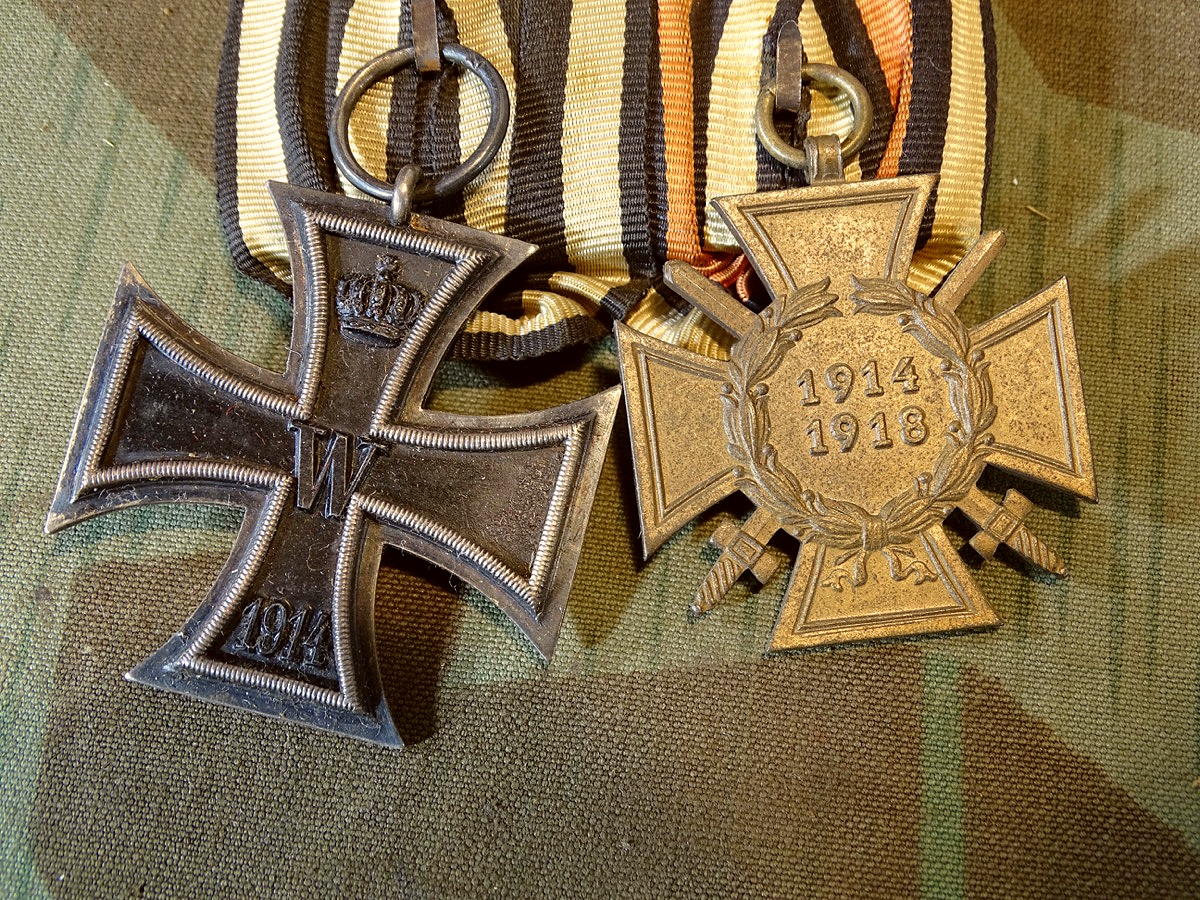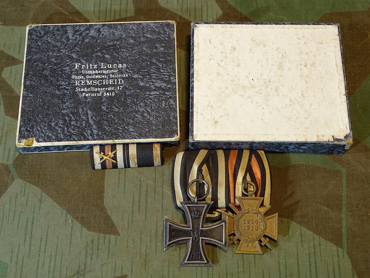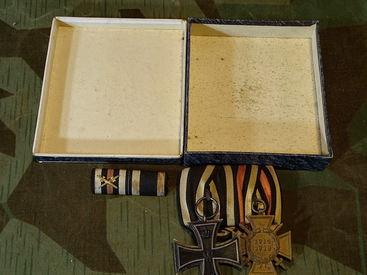 2er Ordensspange: Eisernes Kreuz 2. Klasse 1914- Hst.: Z , Ehrenkreuz f. Frontkämpfer u Bandspange in altem Etui.