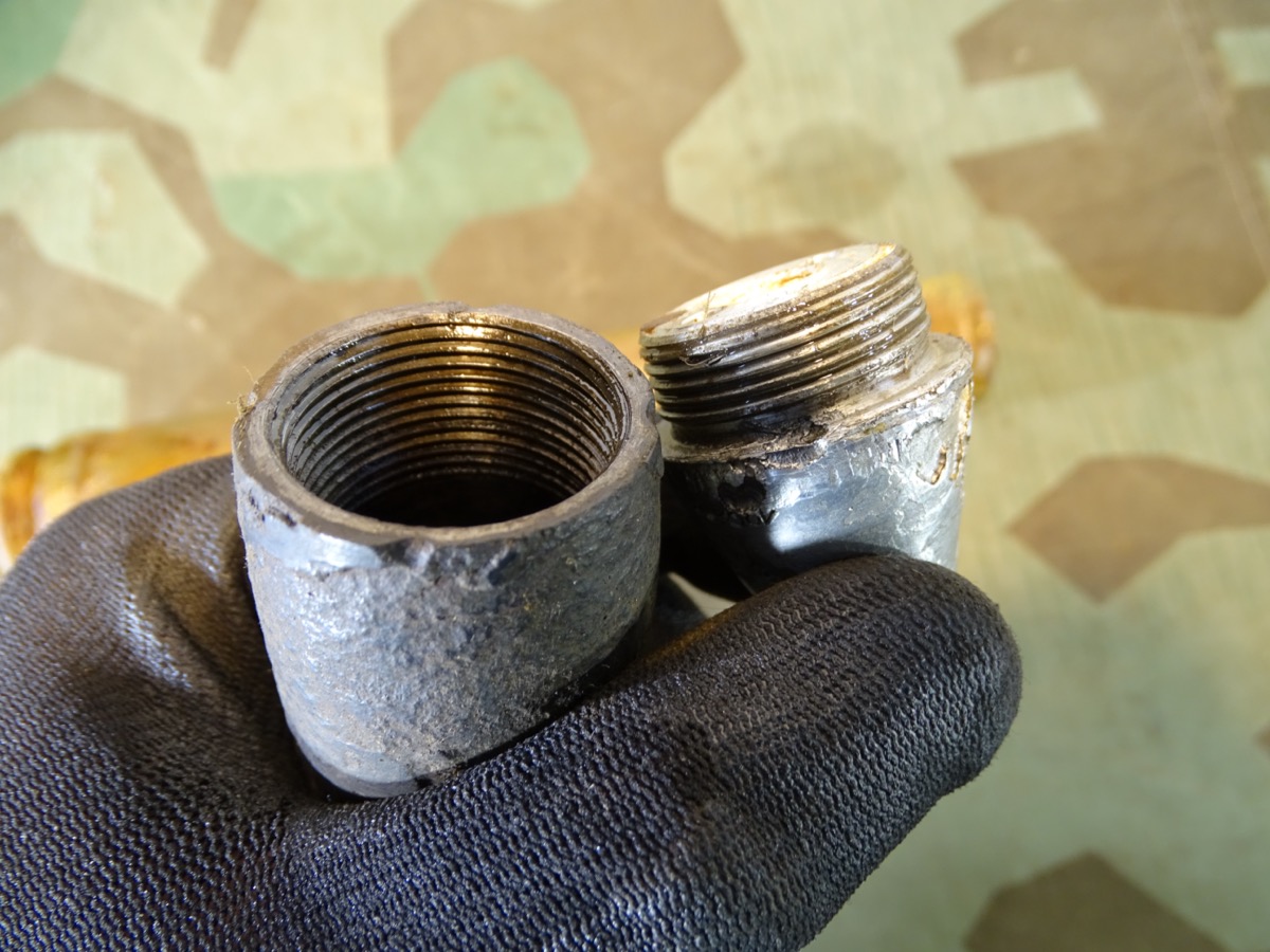 Stahlhülse mit mehreren kleinen Löchern, vom Vorbesitzer gegen Korrosion mit Zaponlack überzogen.
