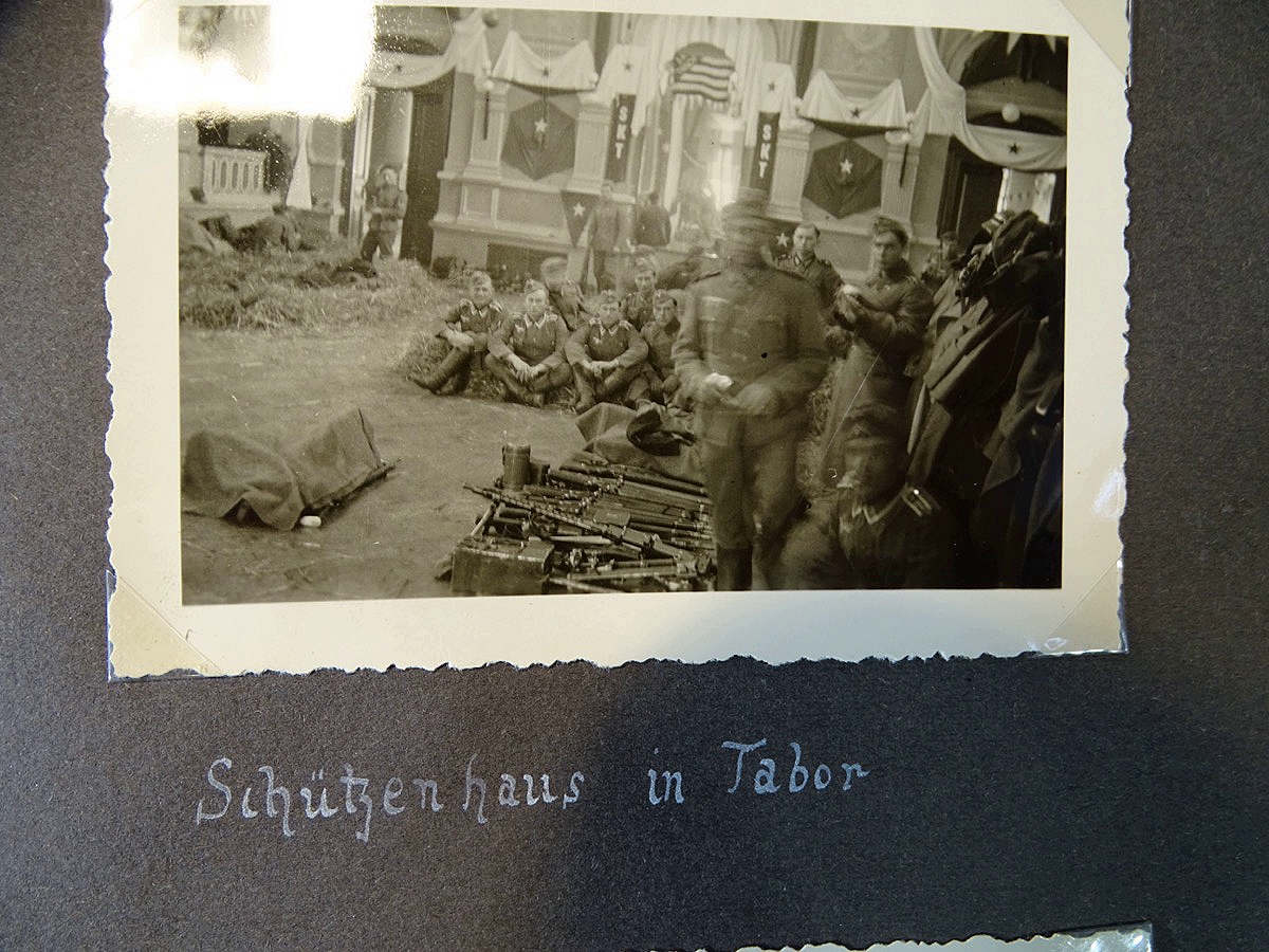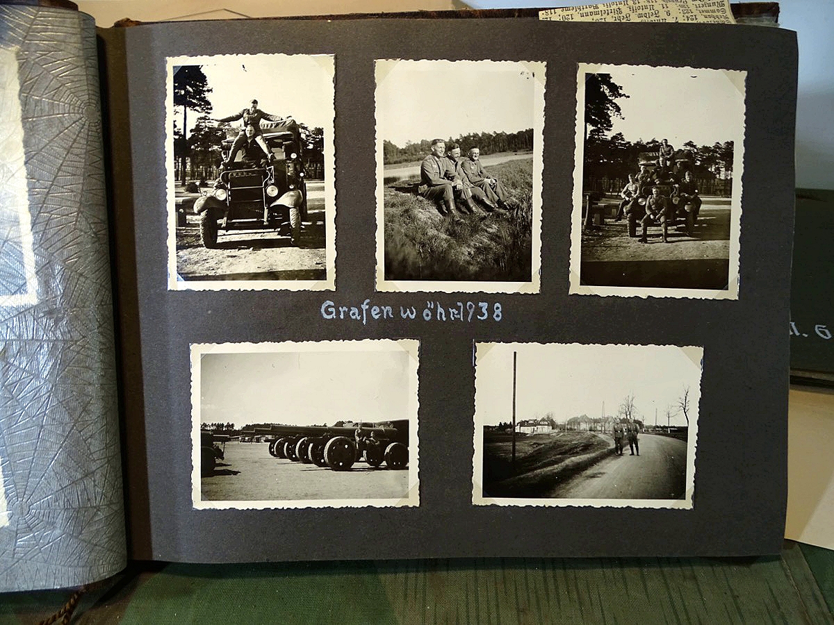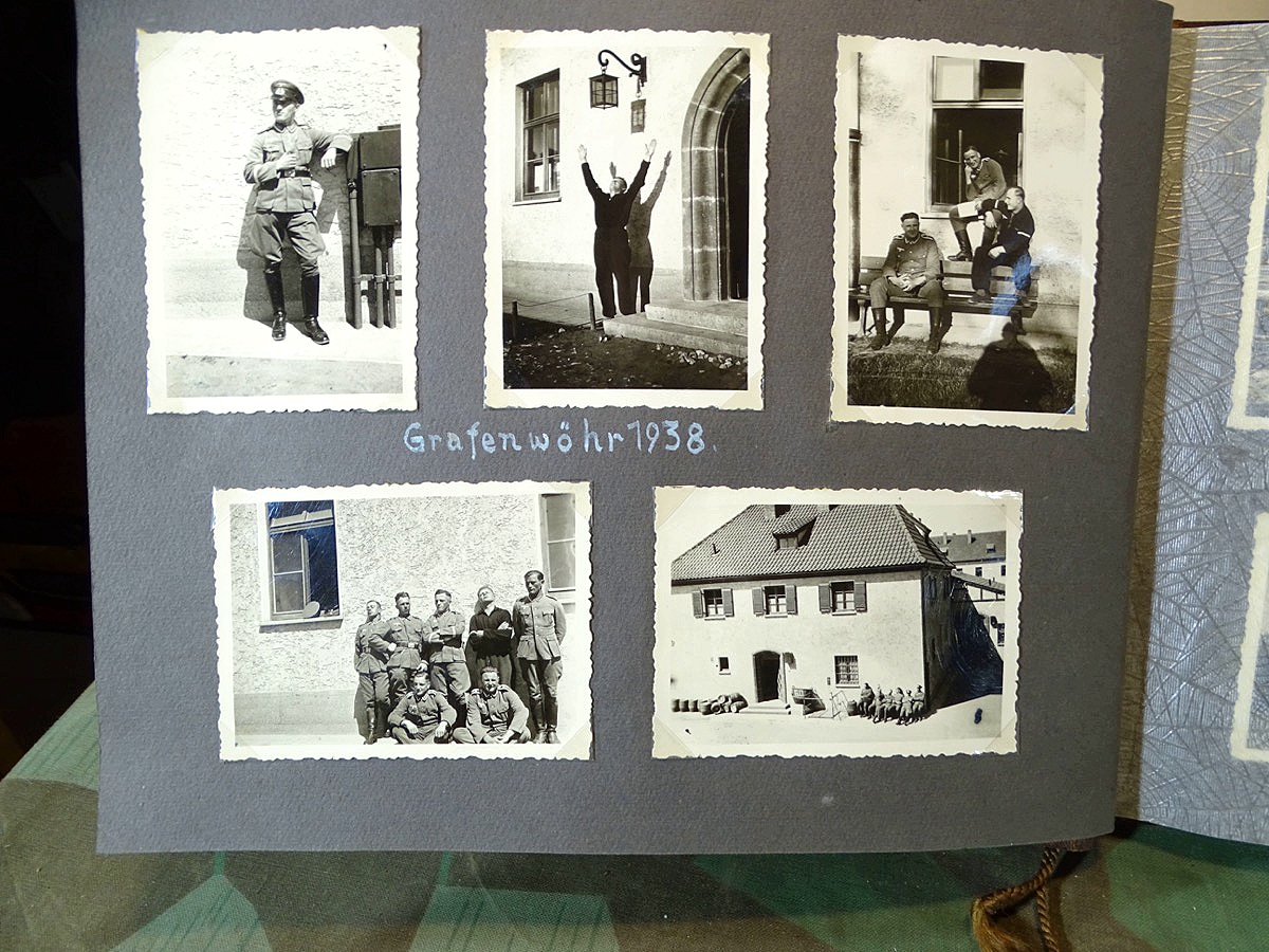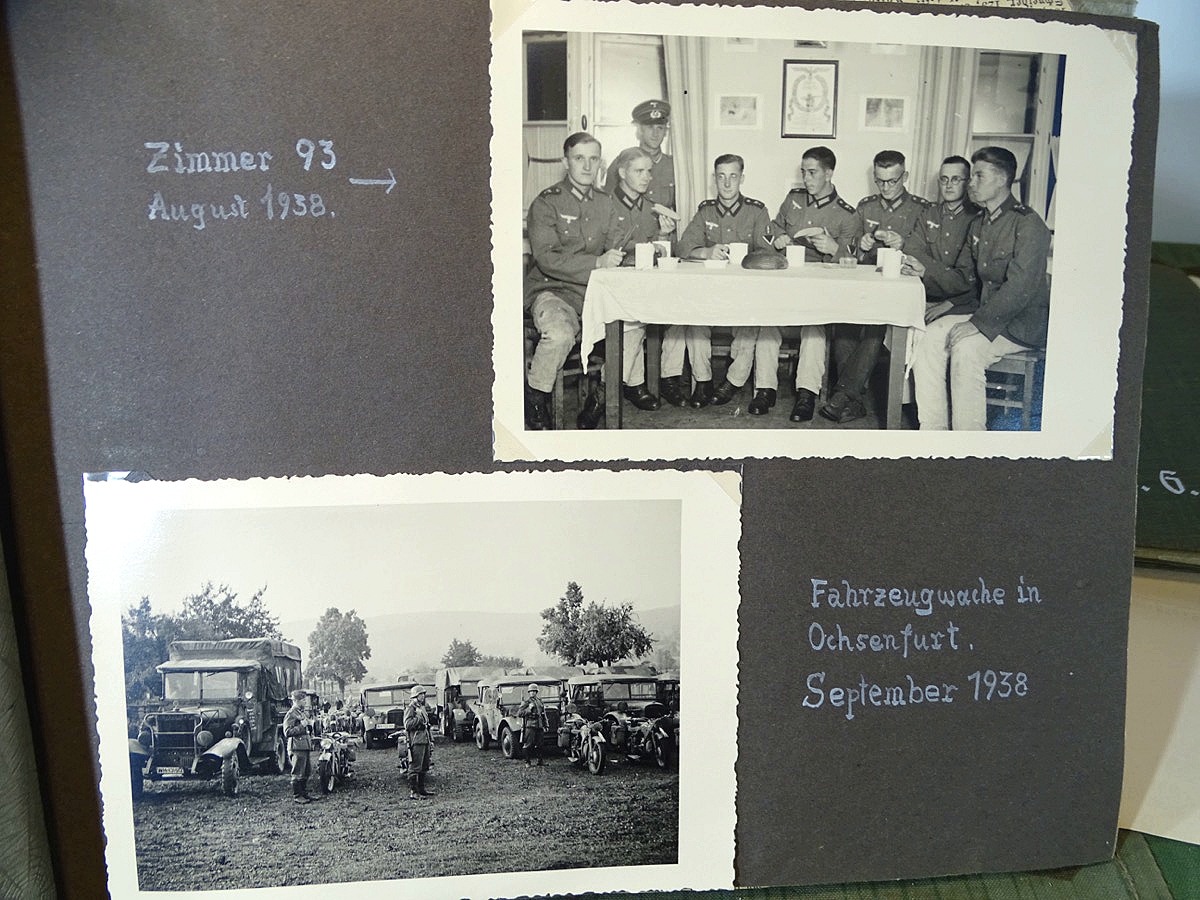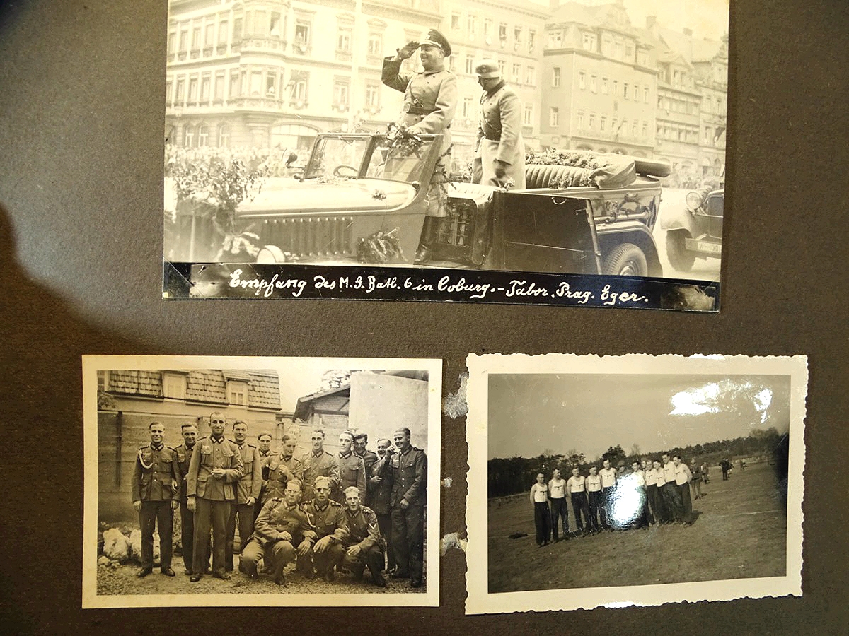 3. Album in braun, Coburg 1938, ca. 130 Fotos, Grafenwöhr 1938, 2 Feldzug Sept.- Okt. 38 , Sudetenland, viele postkartengroße Bilder, Viele Fotos mit sichtbarer Schulterkalppe mit MG, mehrere Zeitungsauschnitte dazu. Feldzug März / April 1939, Böhmen, Mähren, Prag. Tabor, Ilgau ,