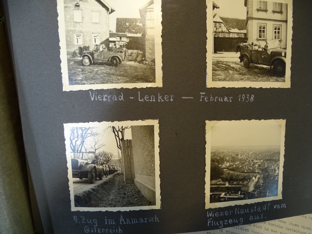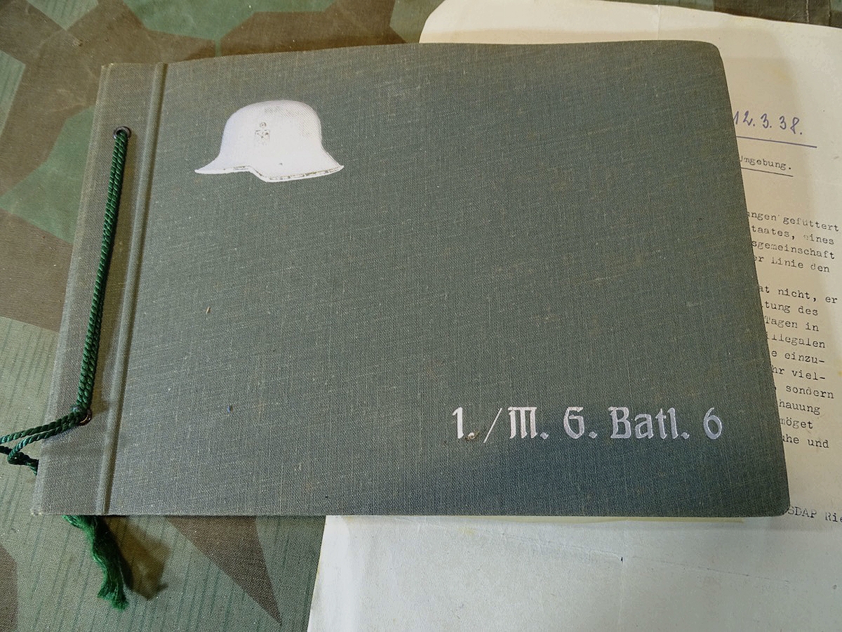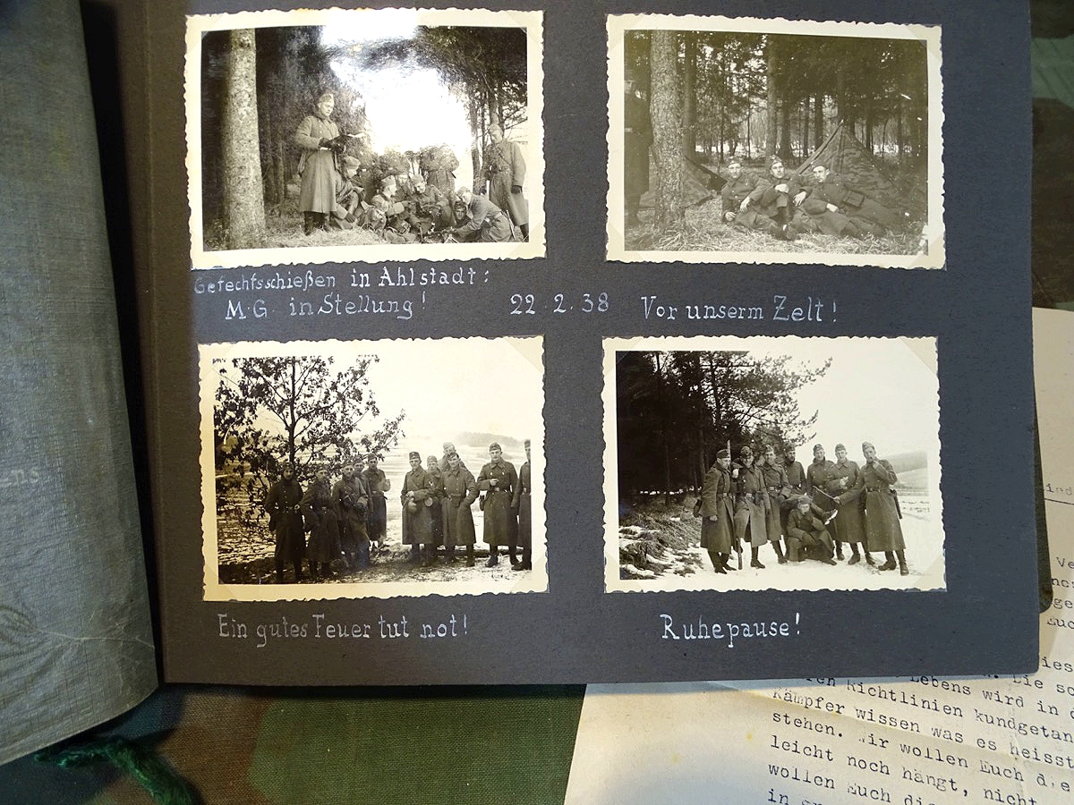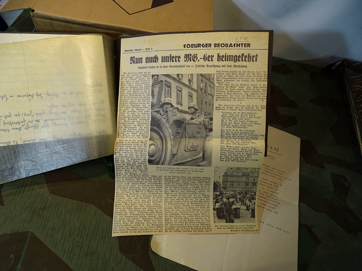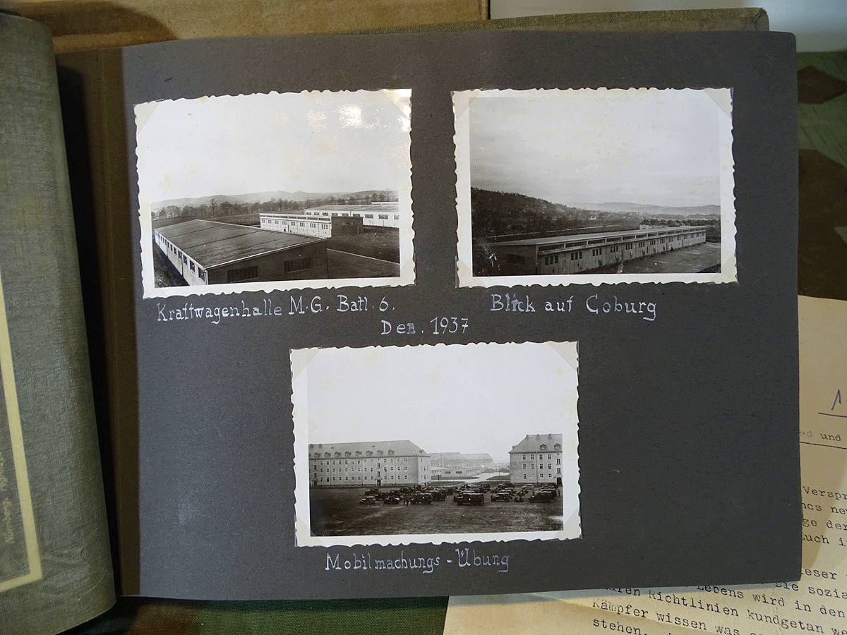 1. ) Grünes Album mit erhabenem WH Helm und tiefgeprägter Schrift: 1.MG Btl. 6 Weihnachten 1937, alle Bilder sauber und leserlich beschriftet. 1 Seite mit Glückwunschkarte des Hauptmanns u Kp. Chefs zur Weihnacht 1937, 2 Seite mit aufgeklammertem Miniatur Schirmmützen Mützeneichenlaub und Schulterklappen Auflagen "MG". 3 Ansichtskarten der Hindenburgkaserne Coburg, Foto des Kp. Chefs Hauptmann König u Btl. Kdr. Oberstleutnant Adelhoch, Bilder von Motorrad Artistik zugunsten des WHW 1937. Standortlazarett Nürnberg Fürth u seligen Andenkenhaus. 2 eingeklebte Militär Fahrkarten, Gefechtsstrassen Ahlstadt Feb. 1938, März 38 Einmarsch Österreich Wien. Blatt mit Tagebuch des Österreich Feldzuges. Zeitungsauschnitte 1.4.38 über Heimkehr 1.MG Btl. 6., April -Mai 1938 Truppenübungsplatz Grafenwöhr, Schöne Fotos von Kradschützen und 6 Rad Geländewagen im Einssatz.