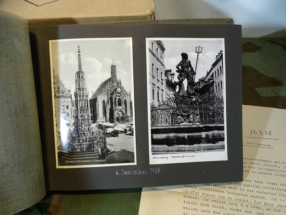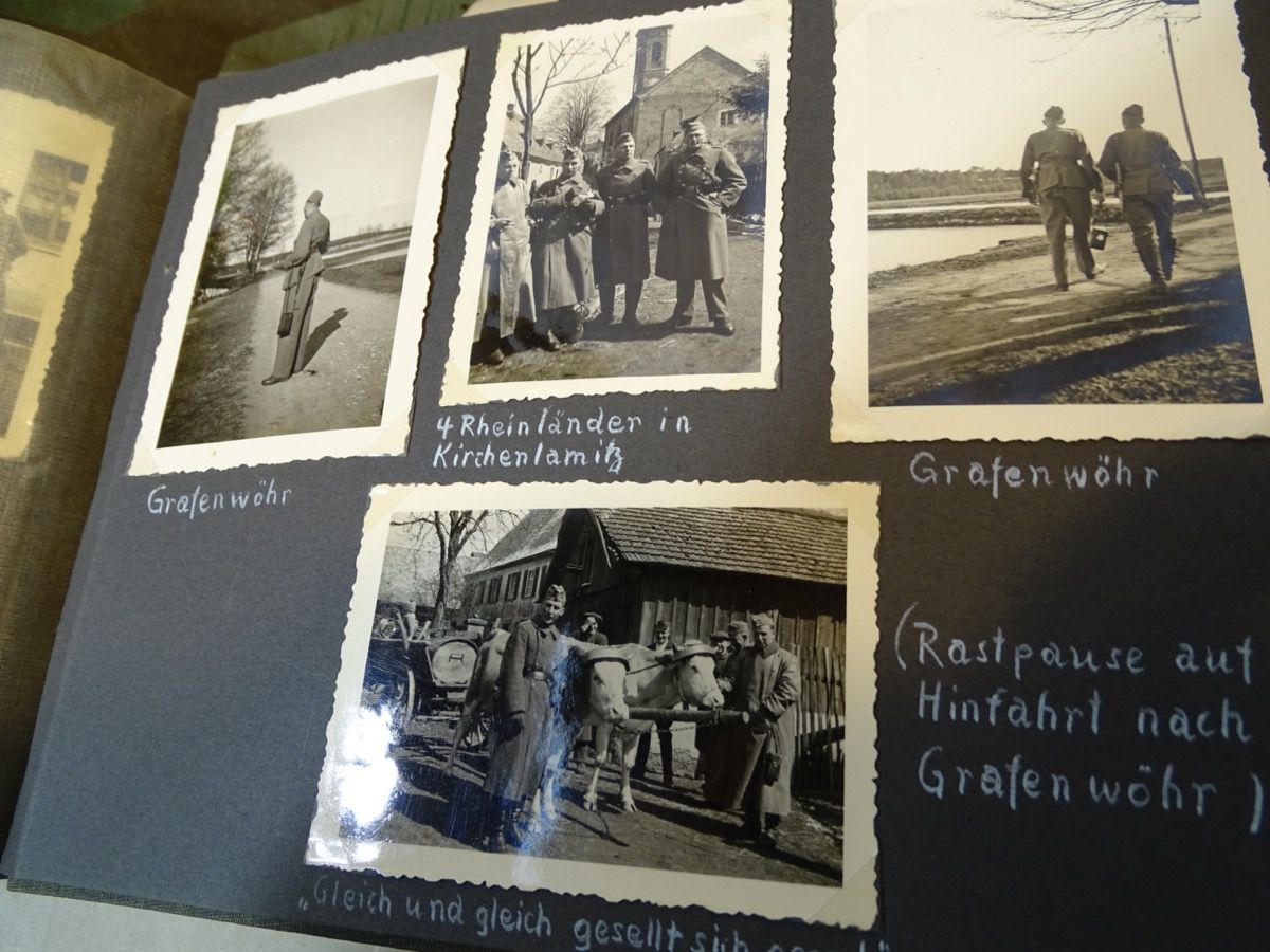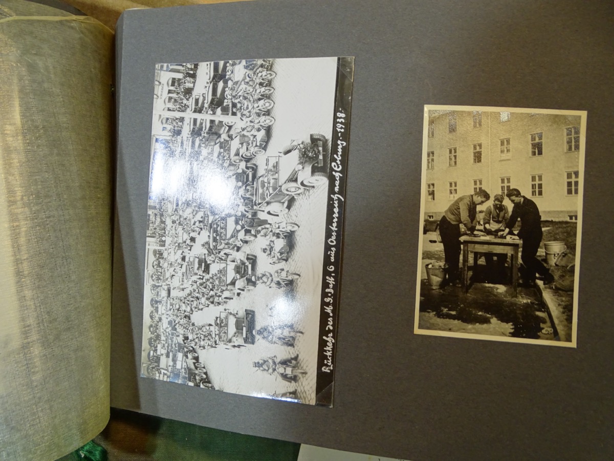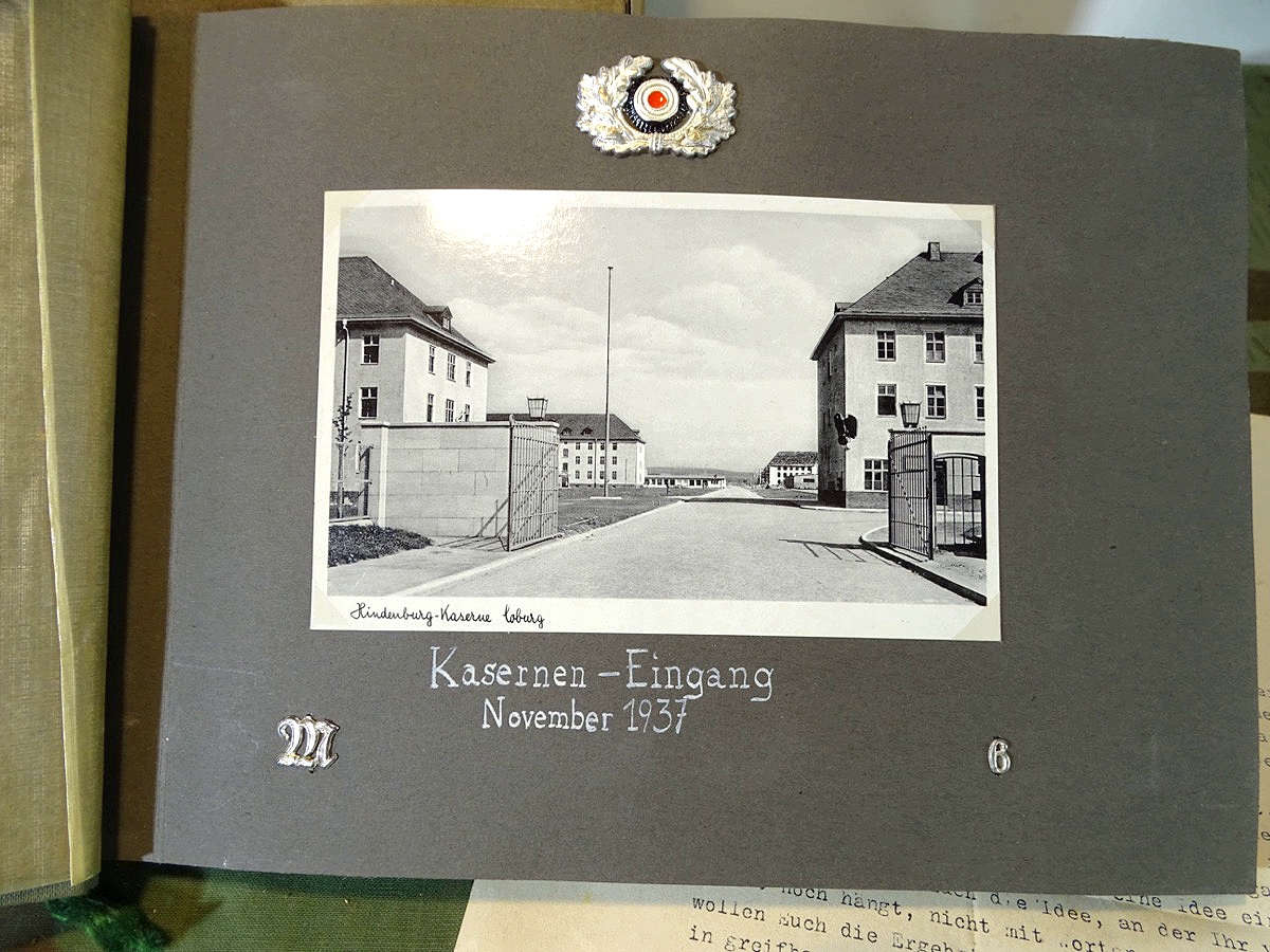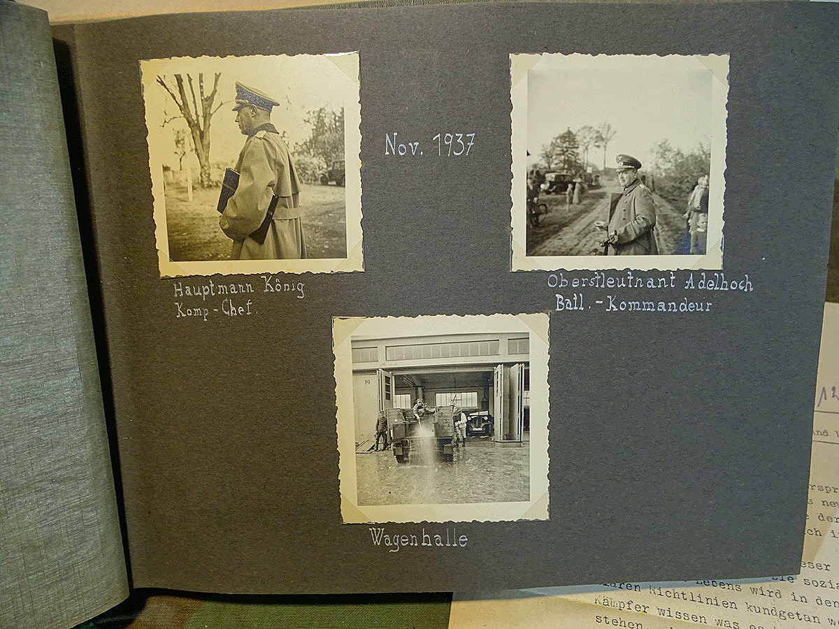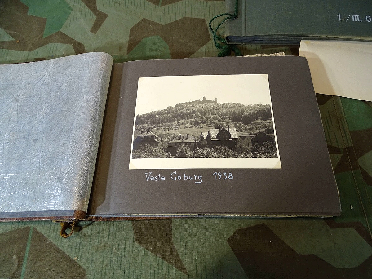 1. ) Grünes Album mit erhabenem WH Helm und tiefgeprägter Schrift: 1.MG Btl. 6 Weihnachten 1937, alle Bilder sauber und leserlich beschriftet. 1 Seite mit Glückwunschkarte des Hauptmanns u Kp. Chefs zur Weihnacht 1937, 2 Seite mit aufgeklammertem Miniatur Schirmmützen Mützeneichenlaub und Schulterklappen Auflagen "MG". 3 Ansichtskarten der Hindenburgkaserne Coburg, Foto des Kp. Chefs Hauptmann König u Btl. Kdr. Oberstleutnant Adelhoch, Bilder von Motorrad Artistik zugunsten des WHW 1937. Standortlazarett Nürnberg Fürth u seligen Andenkenhaus. 2 eingeklebte Militär Fahrkarten, Gefechtsstrassen Ahlstadt Feb. 1938, März 38 Einmarsch Österreich Wien. Blatt mit Tagebuch des Österreich Feldzuges. Zeitungsauschnitte 1.4.38 über Heimkehr 1.MG Btl. 6., April -Mai 1938 Truppenübungsplatz Grafenwöhr, Schöne Fotos von Kradschützen und 6 Rad Geländewagen im Einssatz.