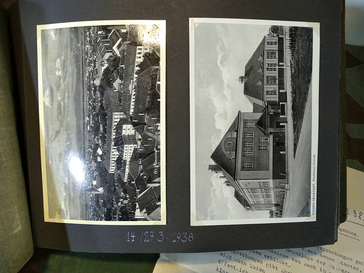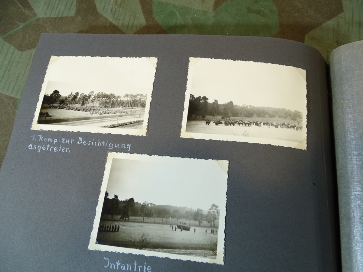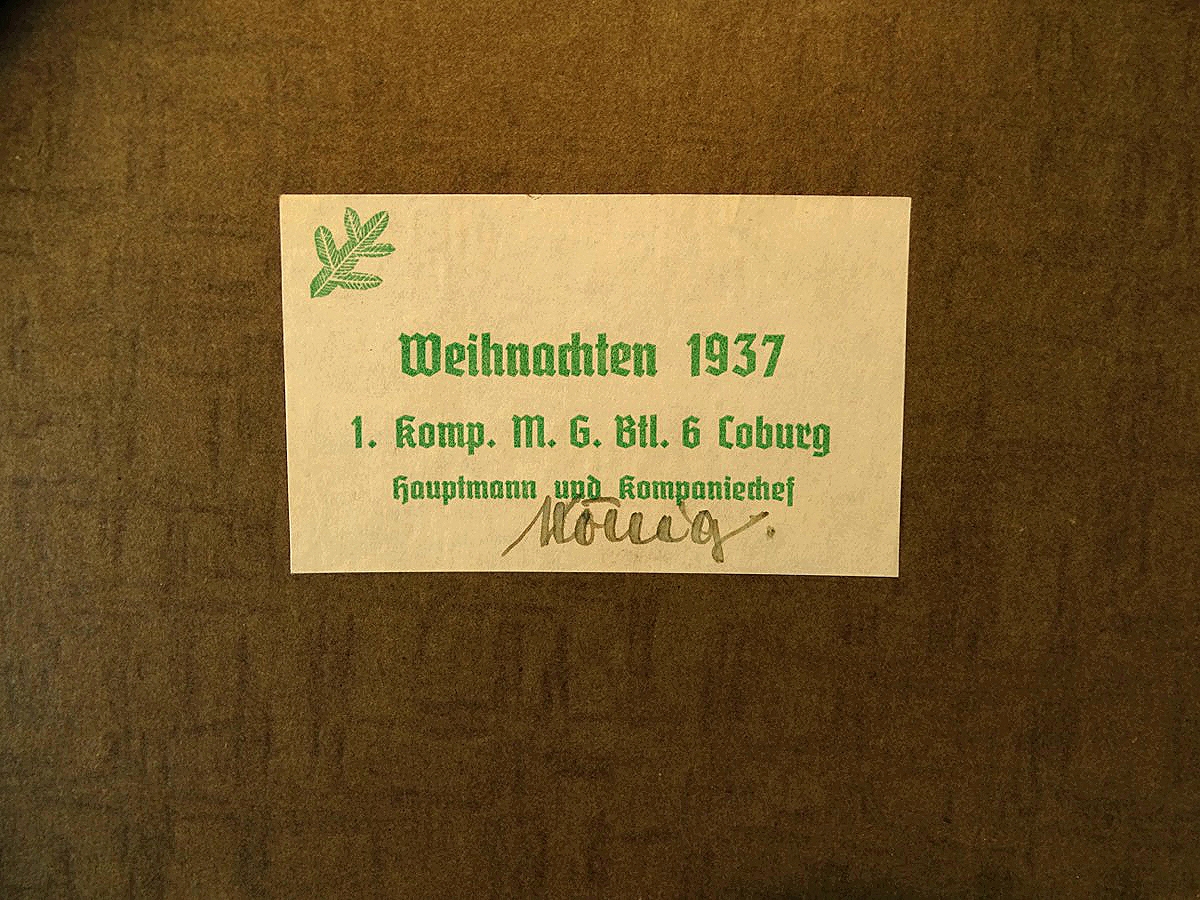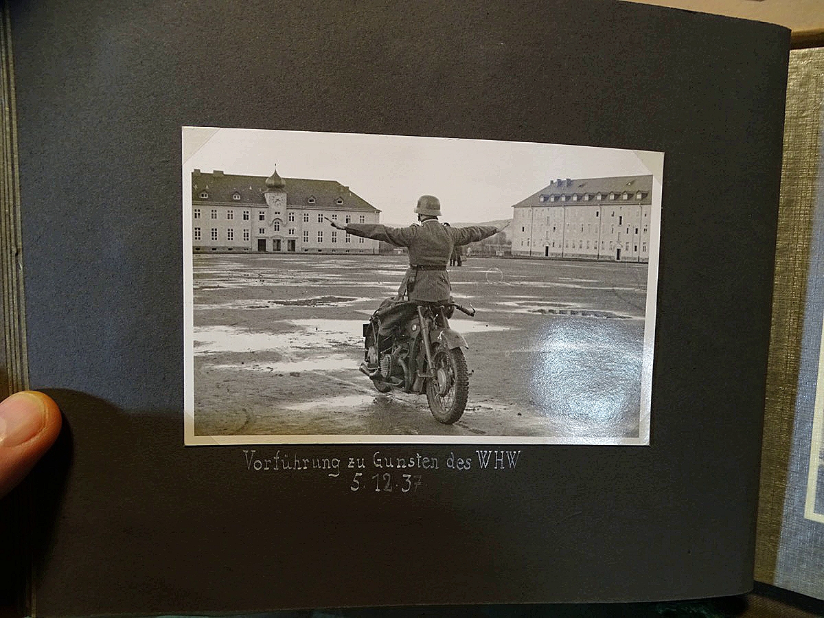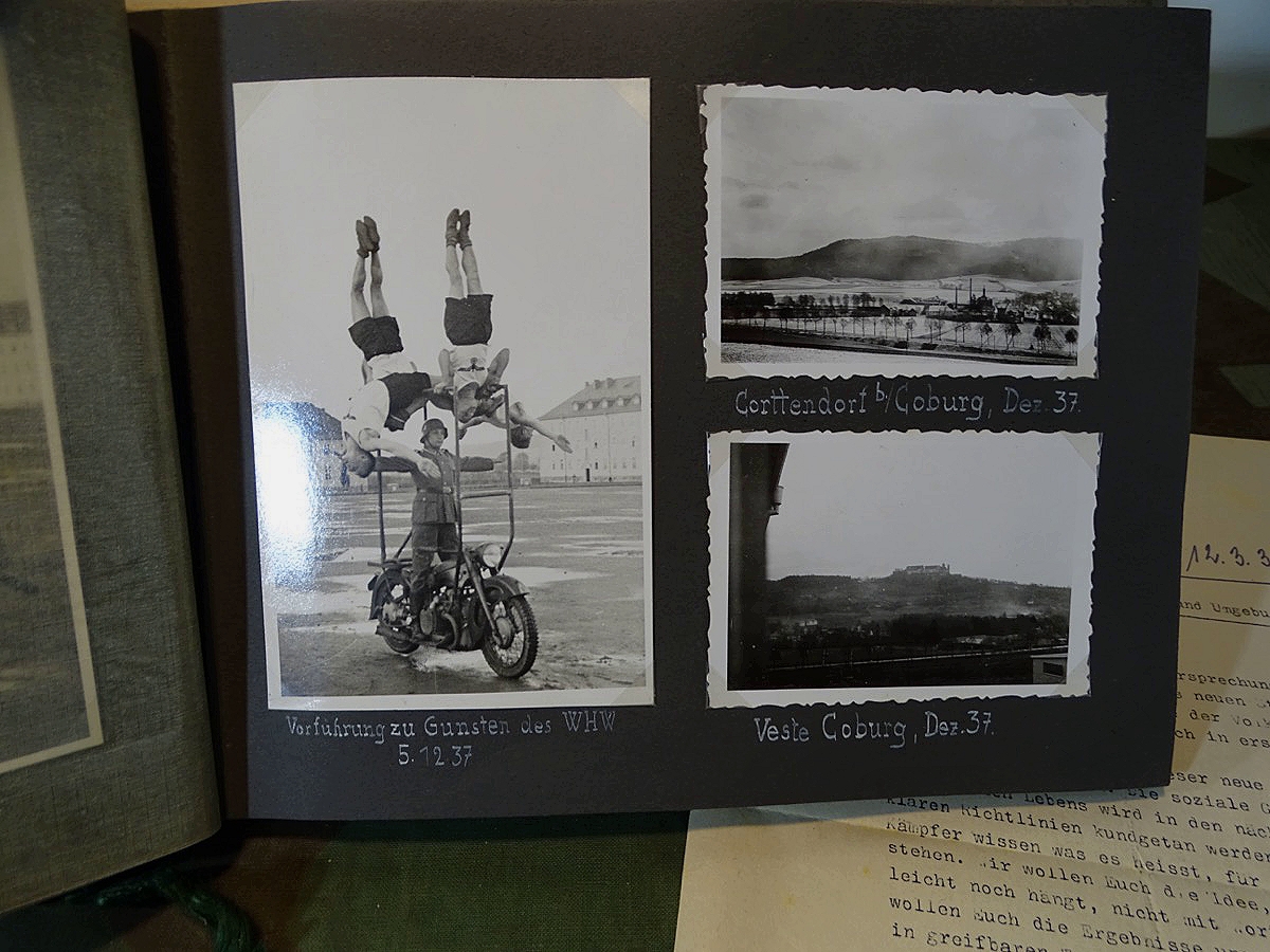 1. ) Grünes Album mit erhabenem WH Helm und tiefgeprägter Schrift: 1.MG Btl. 6 Weihnachten 1937, alle Bilder sauber und leserlich beschriftet. 1 Seite mit Glückwunschkarte des Hauptmanns u Kp. Chefs zur Weihnacht 1937, 2 Seite mit aufgeklammertem Miniatur Schirmmützen Mützeneichenlaub und Schulterklappen Auflagen "MG". 3 Ansichtskarten der Hindenburgkaserne Coburg, Foto des Kp. Chefs Hauptmann König u Btl. Kdr. Oberstleutnant Adelhoch, Bilder von Motorrad Artistik zugunsten des WHW 1937. Standortlazarett Nürnberg Fürth u seligen Andenkenhaus. 2 eingeklebte Militär Fahrkarten, Gefechtsstrassen Ahlstadt Feb. 1938, März 38 Einmarsch Österreich Wien. Blatt mit Tagebuch des Österreich Feldzuges. Zeitungsauschnitte 1.4.38 über Heimkehr 1.MG Btl. 6., April -Mai 1938 Truppenübungsplatz Grafenwöhr, Schöne Fotos von Kradschützen und 6 Rad Geländewagen im Einssatz.