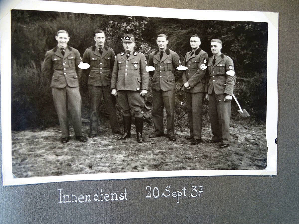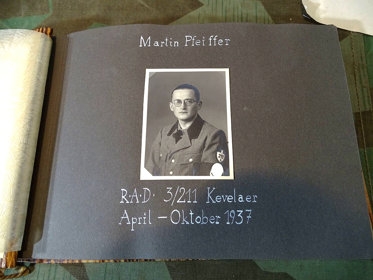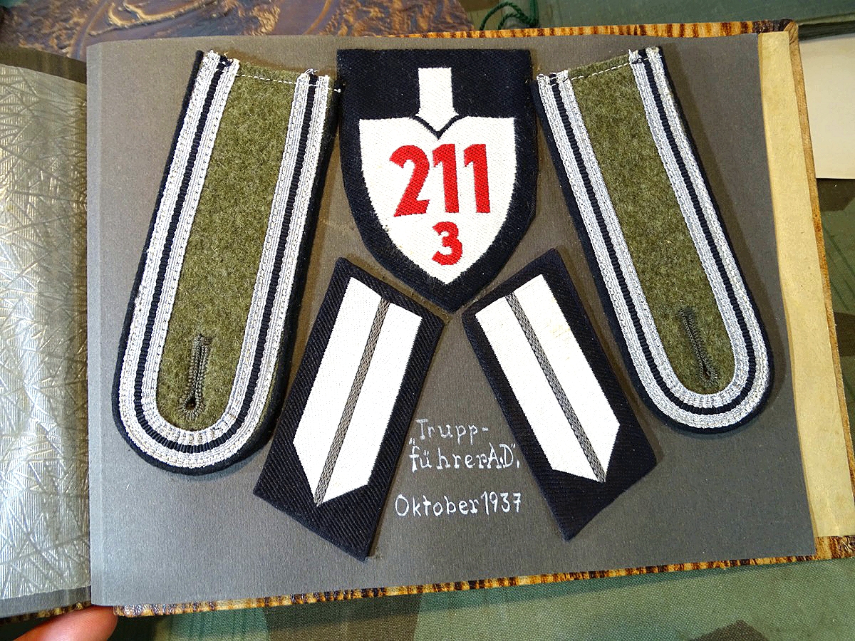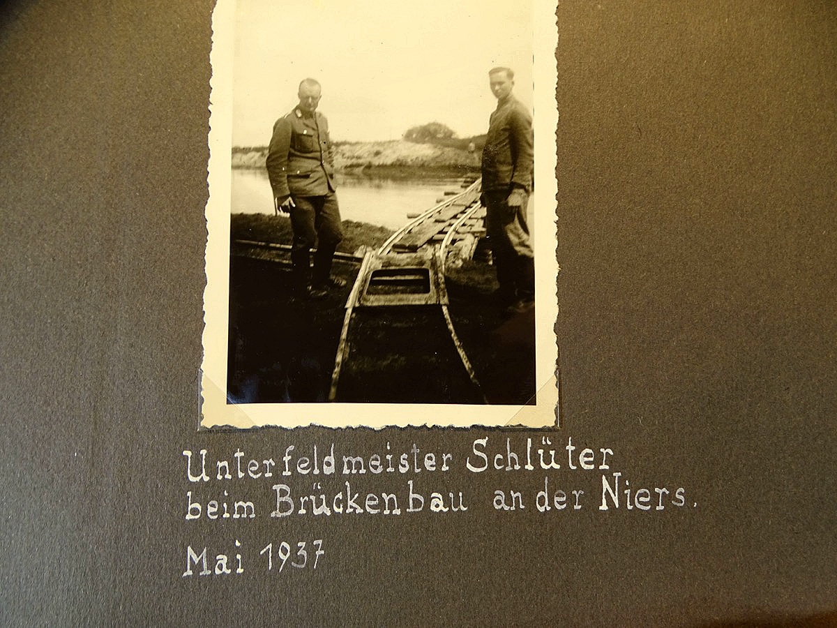 2. beiges Album: RAD Zeit, Abt. 3/211, April 1937, 42 Fotos, Letzte Seite mit vorsichtig eingenähten RAD Truppführer Schulterklappen, Kragenspiegeln, Ärmel Abt. Spaten, Zustand 1, Fotos Brückenbau an der Niers, / Kevelaer.