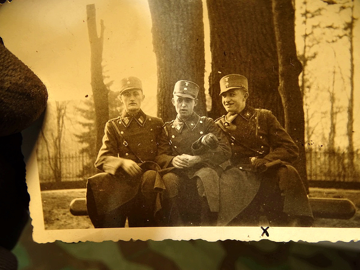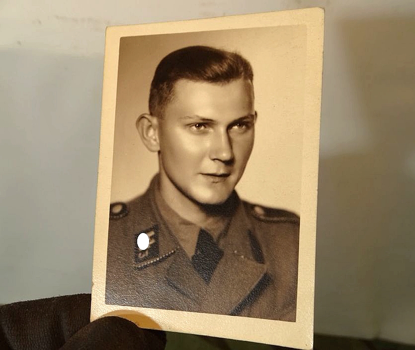 Auf dem Bild mit der feldgrauen Uniform mit Kragenspiegeln für einen SS-Sturmmann im SS-Regiment 3 "Der Führer" Heimatstandort Wien, um 1940. Das Foto mit Fotostudiostempel aus Prag. Sehr selten. Weiterhin 3 Fotos aus Nachlass des gleichen Mannes mit Angehörigen der allgemeinen SS.