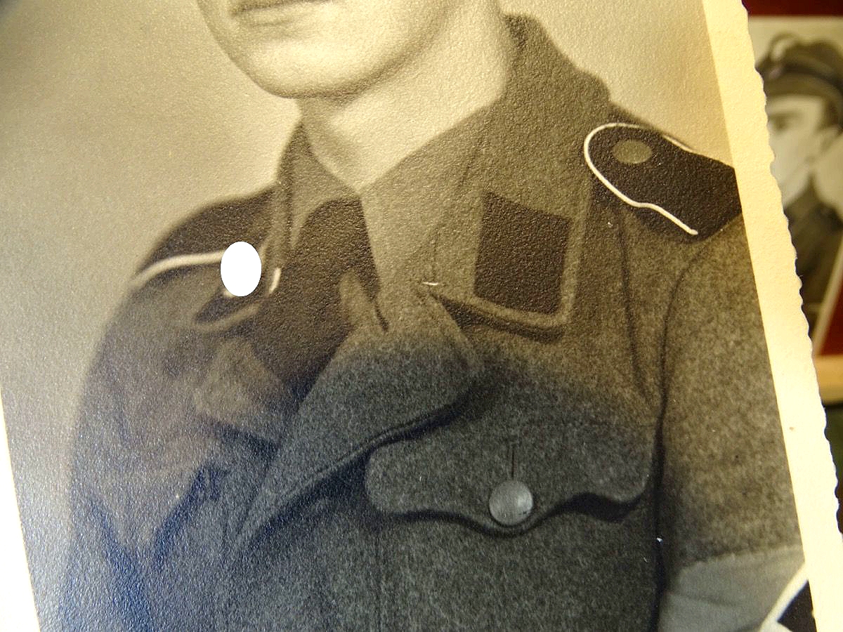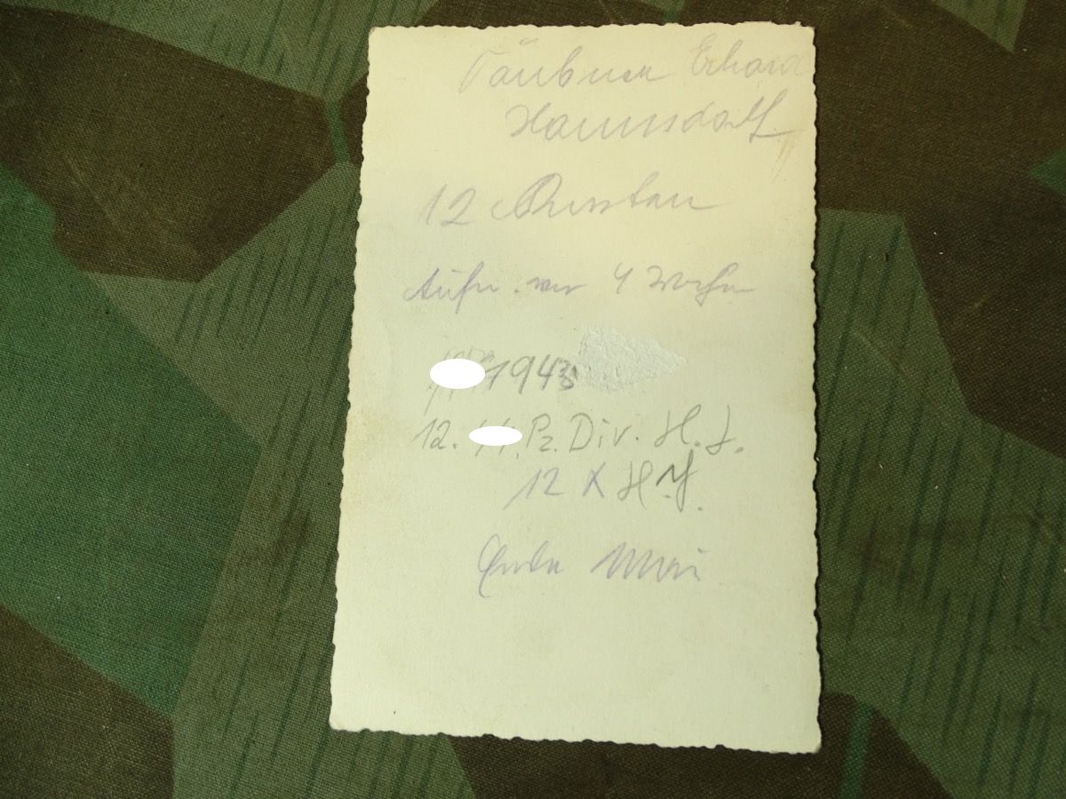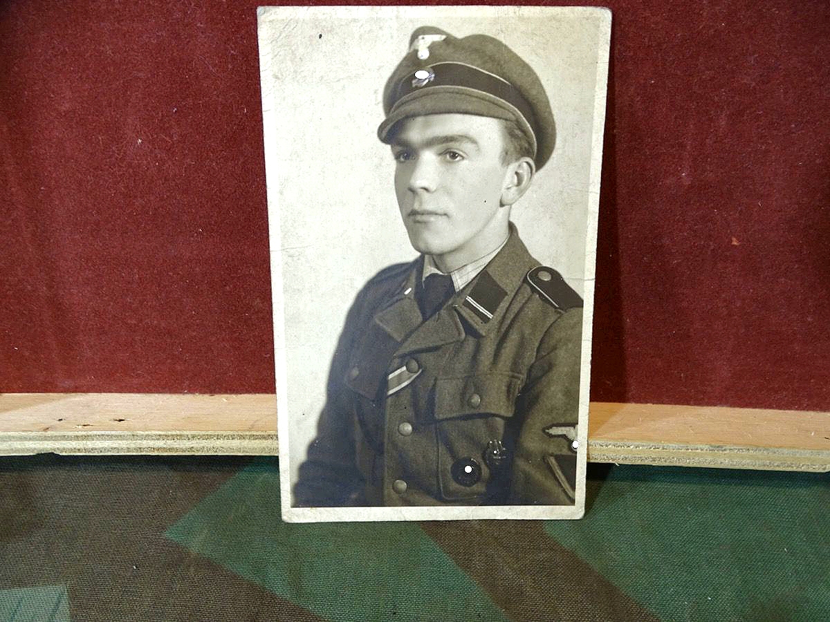 2. ) Ein weiteres sehr schönes Foto eines SS Sturmmannes der Panzerdivision Hitlerjungend und damit schon sehr selten. Der abgebildete Inhalt ist aber auch in mehreren Aspekten besonders: Foto auf der der einzeln fotografierte SS Mann, der auch auf dem Gruppenfoto ist, schon zum SS Sturmmann ( Gefreiter ) befördert wurde und wohl in kurzer Zeit schon viel erlebt hat. Betont " Cooles " Foto - Er trägt ein gestreiftes Privathemd mit Schlips zur Uniform und eine besondere Feldmütze in Form einer Schirmmütze mit Stoffschirm, die man eher von Offizieren kennt. Bei der SS dürfte sie eine privat beschaffte Feldmütze für Unterführer M 38 sein, also eigentlich für Unteroffiziere. Wir gehen davon aus, dass er sie sich für das Foto frecher Weise geliehen hat, da sie nicht seinem Rang entsprach. Es ist auf dem Foto nicht 100% zu erkennen, der Ärmeladler sieht aber auch wie eine gestickte Offiziersausführung aus, was auch gegen die Kleiderordnung wäre. ( Kann aber auch eine recht dicke, helle Ausführung des maschinengestickten Manschafts Adlers sein ) Weiterhin trägt er an der Brusttasche eine Kordel, entweder noch seine HJ Führerschnur oder eine Trillerpfeifen Schnur, was auch eher Feldwebel / Unteroffiziere tragen... Er hat bereits das EK 2 1939 und Verwundeten Abzeichen in schwarz und Panzerkampfabzeichen verleihen bekommen.