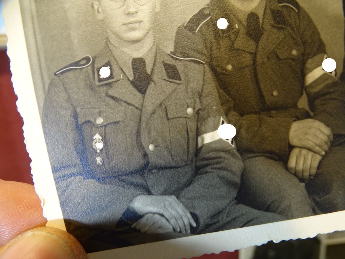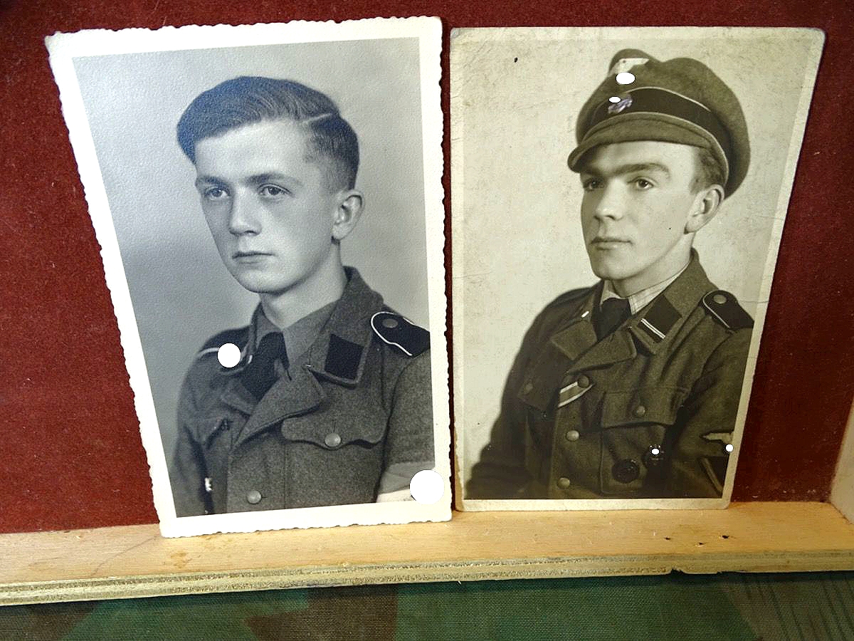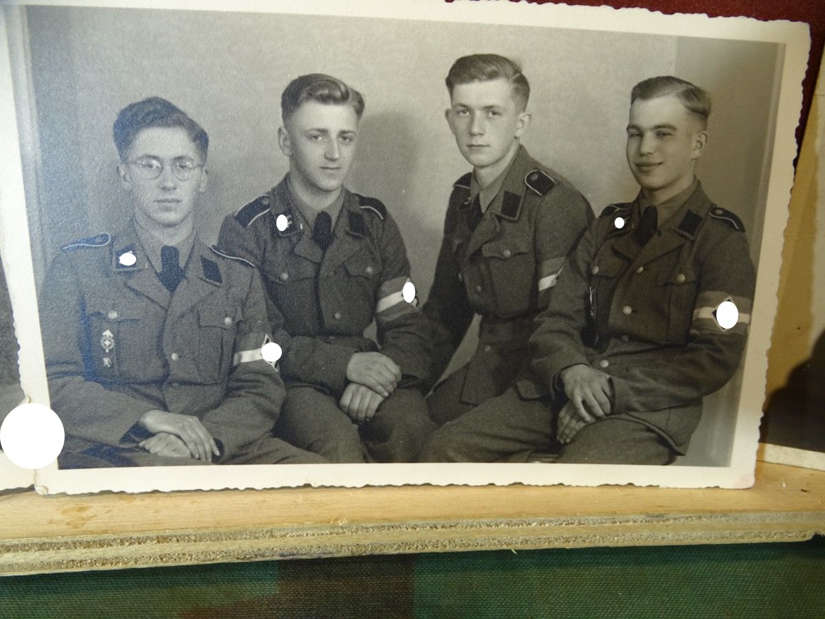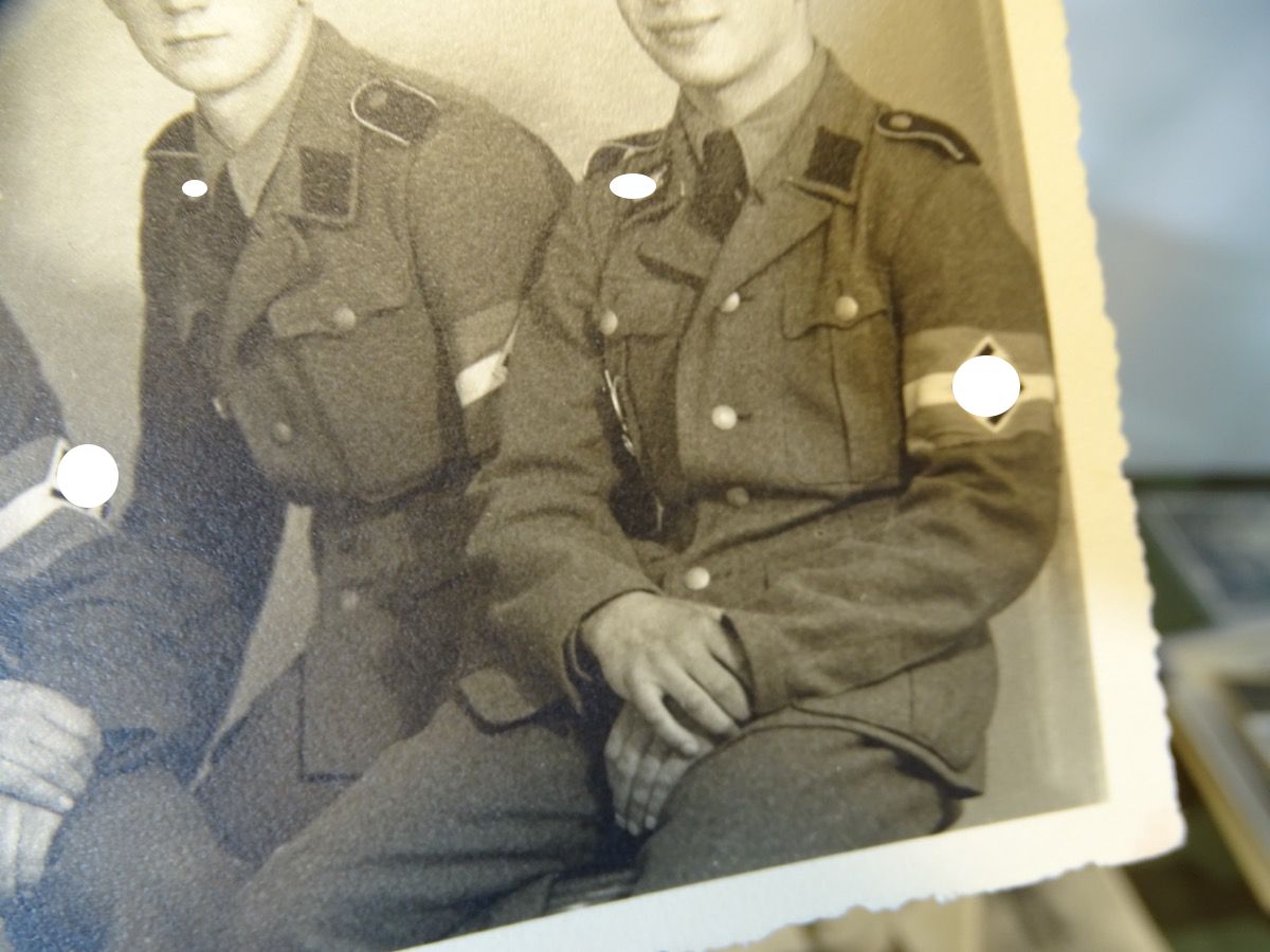 2. ) Ein weiteres sehr schönes Foto eines SS Sturmmannes der Panzerdivision Hitlerjungend und damit schon sehr selten. Der abgebildete Inhalt ist aber auch in mehreren Aspekten besonders: Foto auf der der einzeln fotografierte SS Mann, der auch auf dem Gruppenfoto ist, schon zum SS Sturmmann ( Gefreiter ) befördert wurde und wohl in kurzer Zeit schon viel erlebt hat. Betont " Cooles " Foto - Er trägt ein gestreiftes Privathemd mit Schlips zur Uniform und eine besondere Feldmütze in Form einer Schirmmütze mit Stoffschirm, die man eher von Offizieren kennt. Bei der SS dürfte sie eine privat beschaffte Feldmütze für Unterführer M 38 sein, also eigentlich für Unteroffiziere. Wir gehen davon aus, dass er sie sich für das Foto frecher Weise geliehen hat, da sie nicht seinem Rang entsprach. Es ist auf dem Foto nicht 100% zu erkennen, der Ärmeladler sieht aber auch wie eine gestickte Offiziersausführung aus, was auch gegen die Kleiderordnung wäre. ( Kann aber auch eine recht dicke, helle Ausführung des maschinengestickten Manschafts Adlers sein ) Weiterhin trägt er an der Brusttasche eine Kordel, entweder noch seine HJ Führerschnur oder eine Trillerpfeifen Schnur, was auch eher Feldwebel / Unteroffiziere tragen... Er hat bereits das EK 2 1939 und Verwundeten Abzeichen in schwarz und Panzerkampfabzeichen verleihen bekommen.