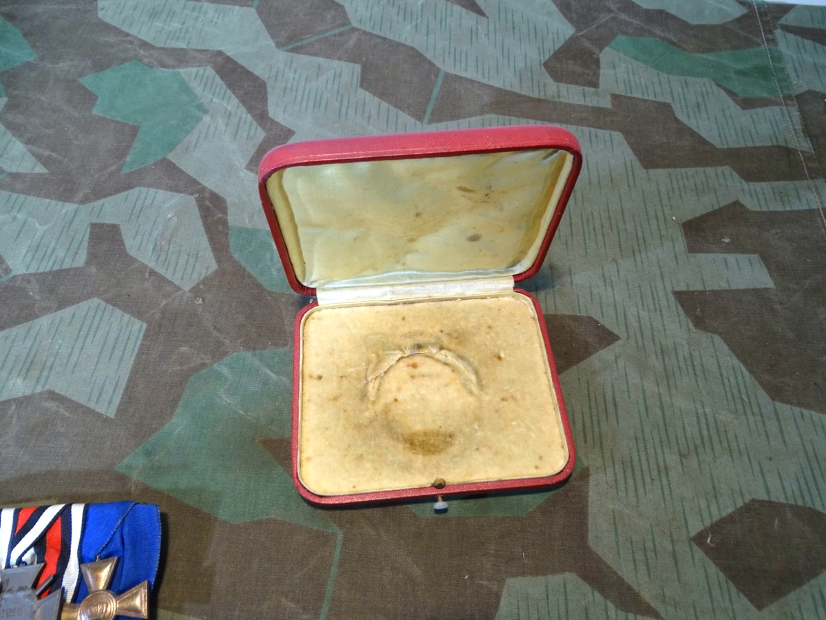 Eisernes Kreuz 2. Klasse 1914, Ehrenkreuz für Frontkämpfer 1914-18, preussische militär Dienstzeit Auszeichnung für 12 Jahre. In diesem alten Schmuckkästchen aus Nachlass des Trägers von der Familie angekauft, daher haben wir es dabei belassen. Dekorativ - ist aber keine werksmässige Ordensschatulle. Spange und 2 Orden recht gut erhalten, EK 2 mit deutlichen Tragespuren, wohl mal runter gefallen.