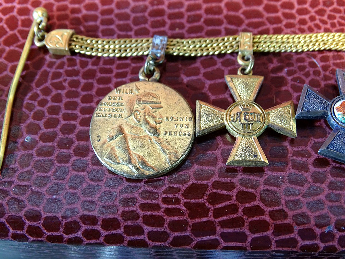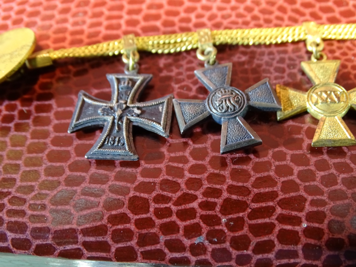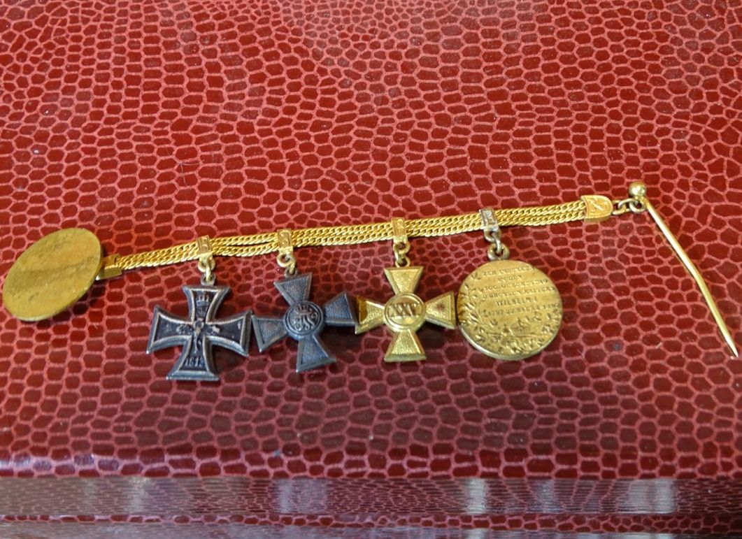 Produktinformationen "4er Miniaturen Frackkettchen EK 2 1914 roter Adler Orden, 25 J. DA, Centenaer Medaille, Godett"