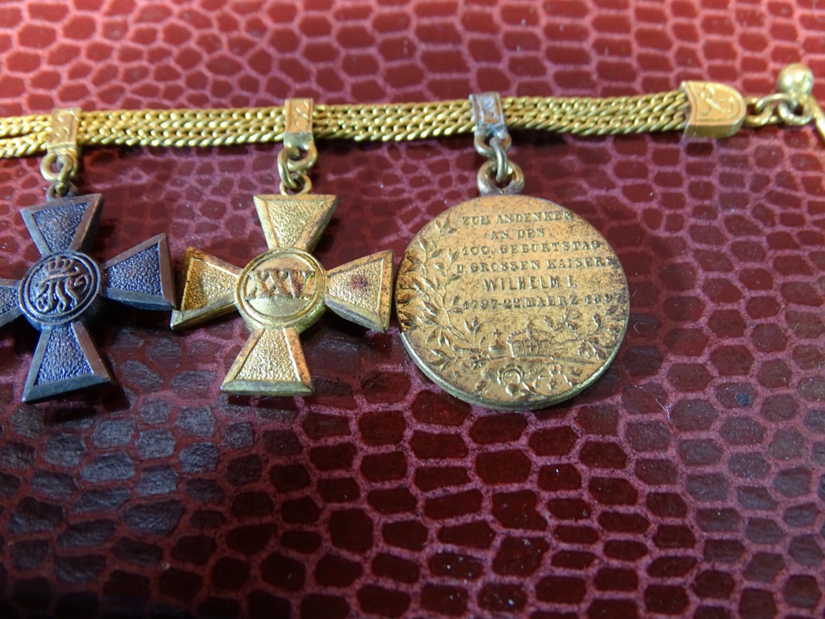 4er Miniaturen Frackkettchen EK 2 1914 roter Adler Orden, 25 J. DA, Centenaer Medaille, Godett