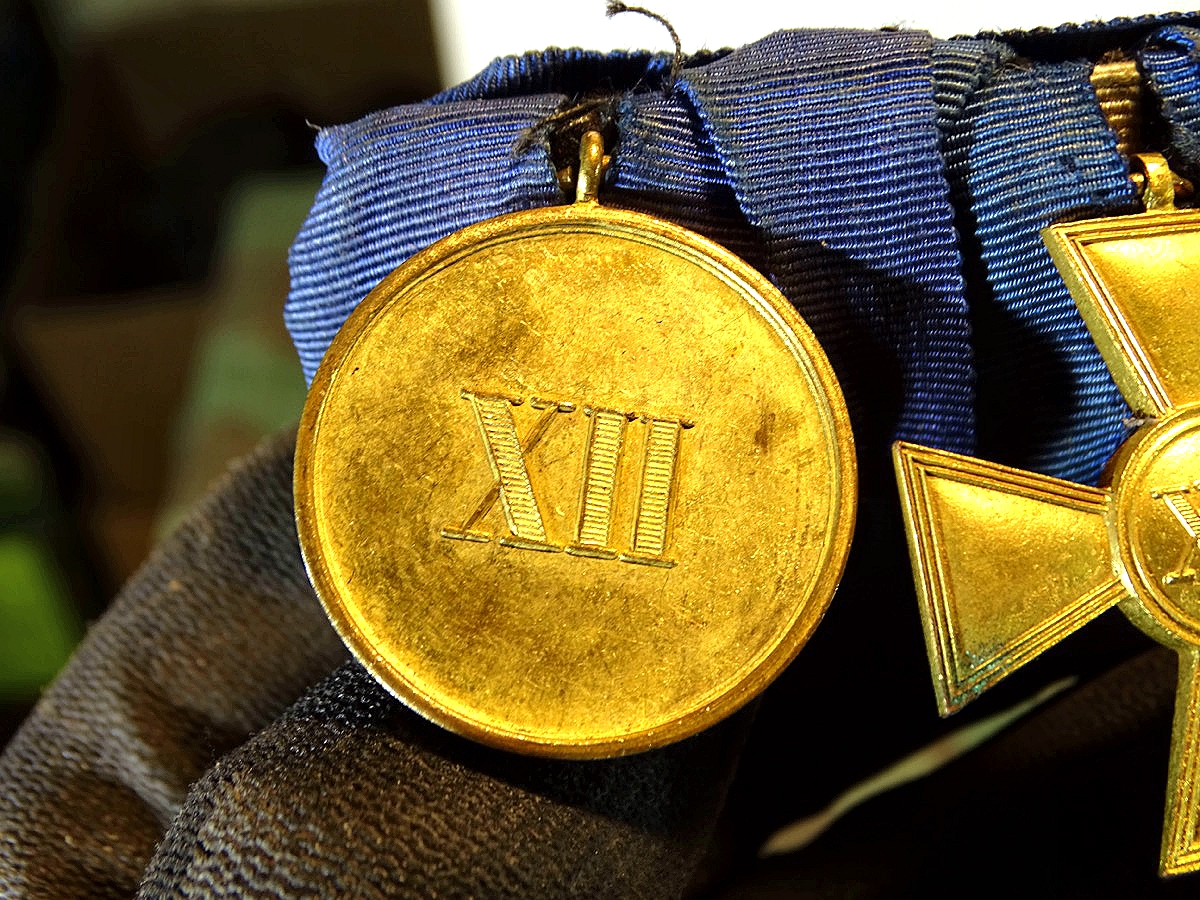 Spange auf Rückseite mit schwarzem Samt hinterlegt. Kernfarbe des EK 2 fast kpl. erhalten. Magnetisch. Der Rahmen mit feiner, gleichmässiger Patina. Ob es einen hereteller im Ring hat können wir nicht sagen, da dieser kpl. eingenäht ist. Es ist aber eine ungewöhnliche Prägung, die Zahlen sind sehr flach und filigran gehalten. Ehrenkreuz f. Frontkämpfer gut erhalten, mittiger Herstellerstempel : C.Th.D. Hersteller: Carl Theodor Dicke Lüdenscheid. Magnetisch. Preussische Dienstzeitauszeichnungen für 12 und 15 Jahre. Zustand siehe Foto.