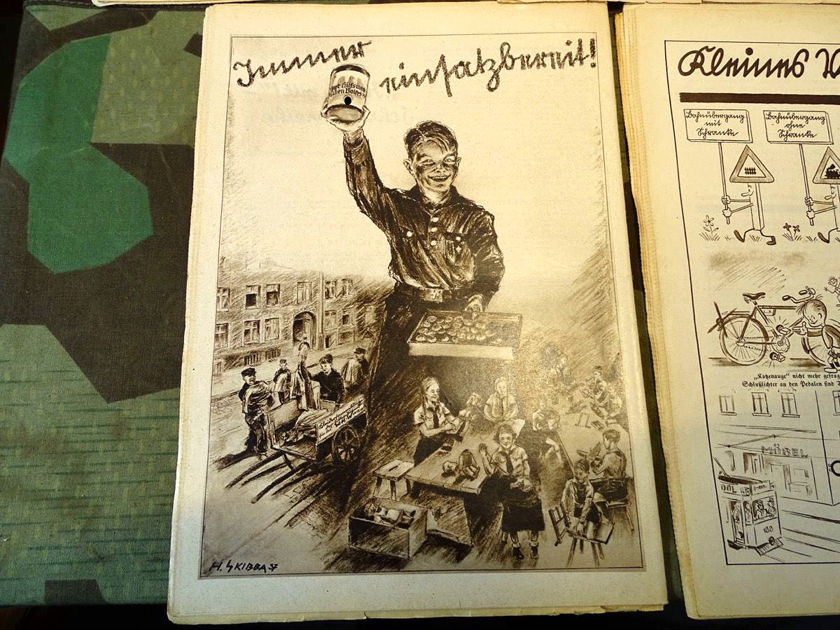 Hilf Mit" Illustrierte deutsche Schülerzeitung für die Jugend. Ausgaben Jan. Feb. März, April, Juni, Okt. Nov. Inhalt: alle Themen die die Jugend interessieren wie Schule, Unterhaltung, Witze, Bauanleitungen, Fliegerei, Helden, Rätsel. Illustriert und bebildert. Interessantes Dokument zur frühzeitigen propagandistischen Beeinflussung der deutschen Jugend in der NS Zeit. Zustand siehe Fotos. Nicht im Detail durchgesehen, keine Garantie auf Vollständigkeit.