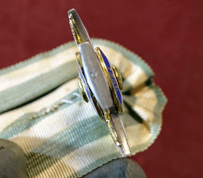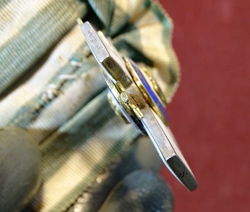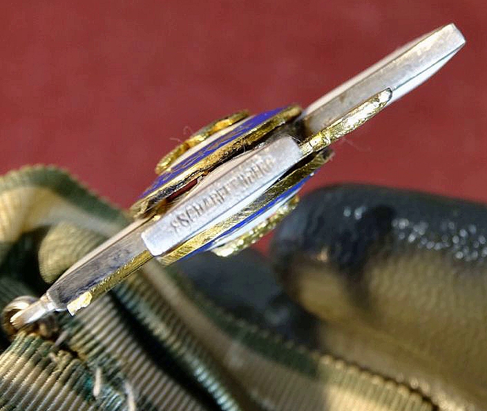 Silber, emailliert, Emaille sehr gut erhalten. Mittelemblem vergoldet. Unterer Kreuzarm mit S , seitliche Kreuzarme mit S. Scharfenberg und Dresden. Selten in dieser Erhaltung und mit Einzelspange zu finden.