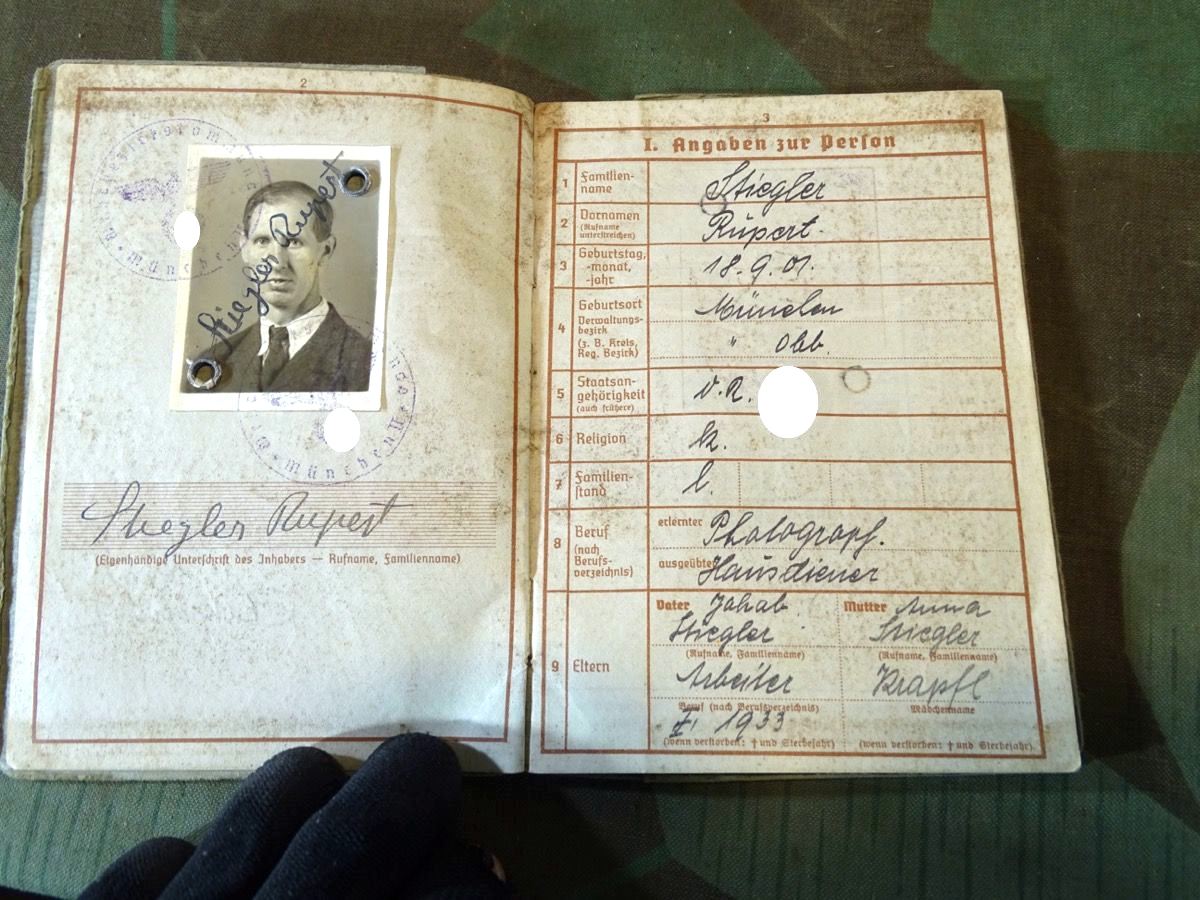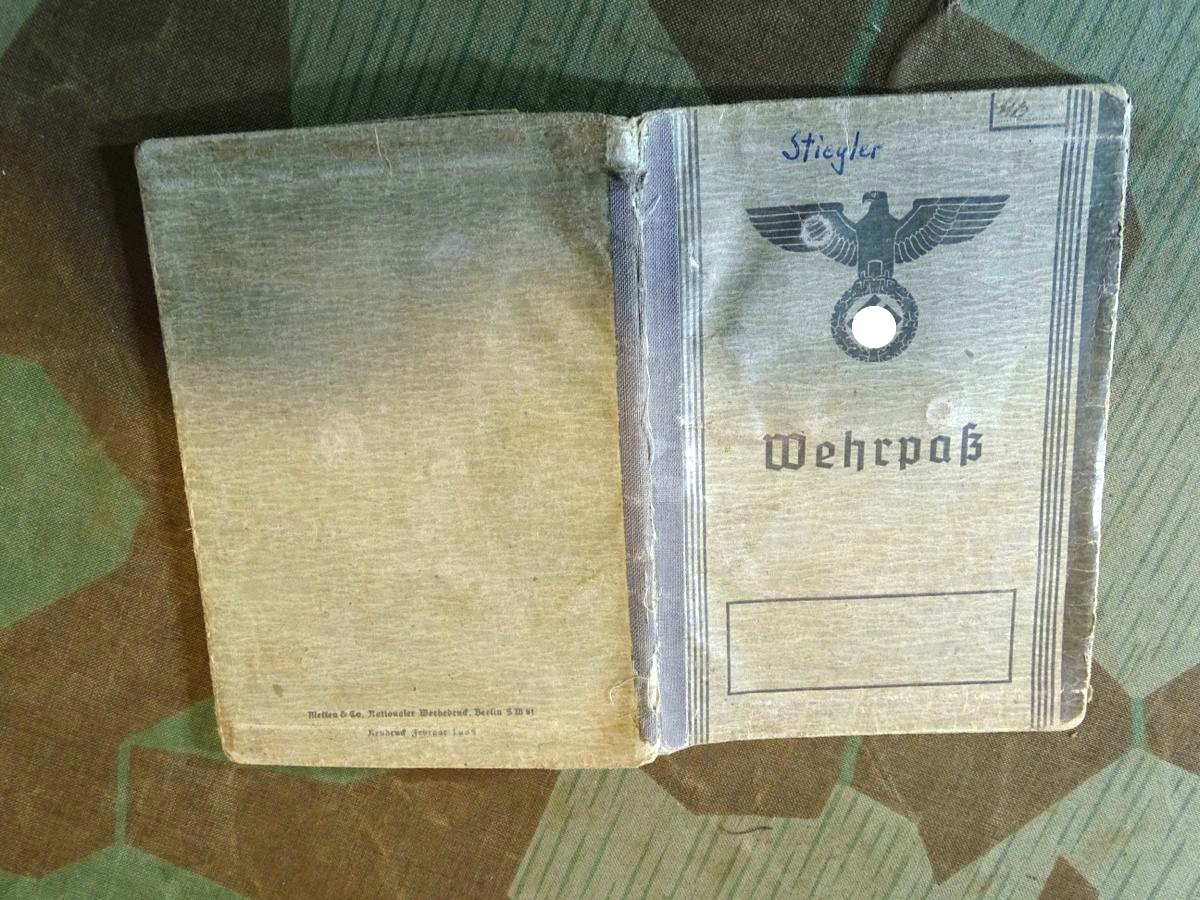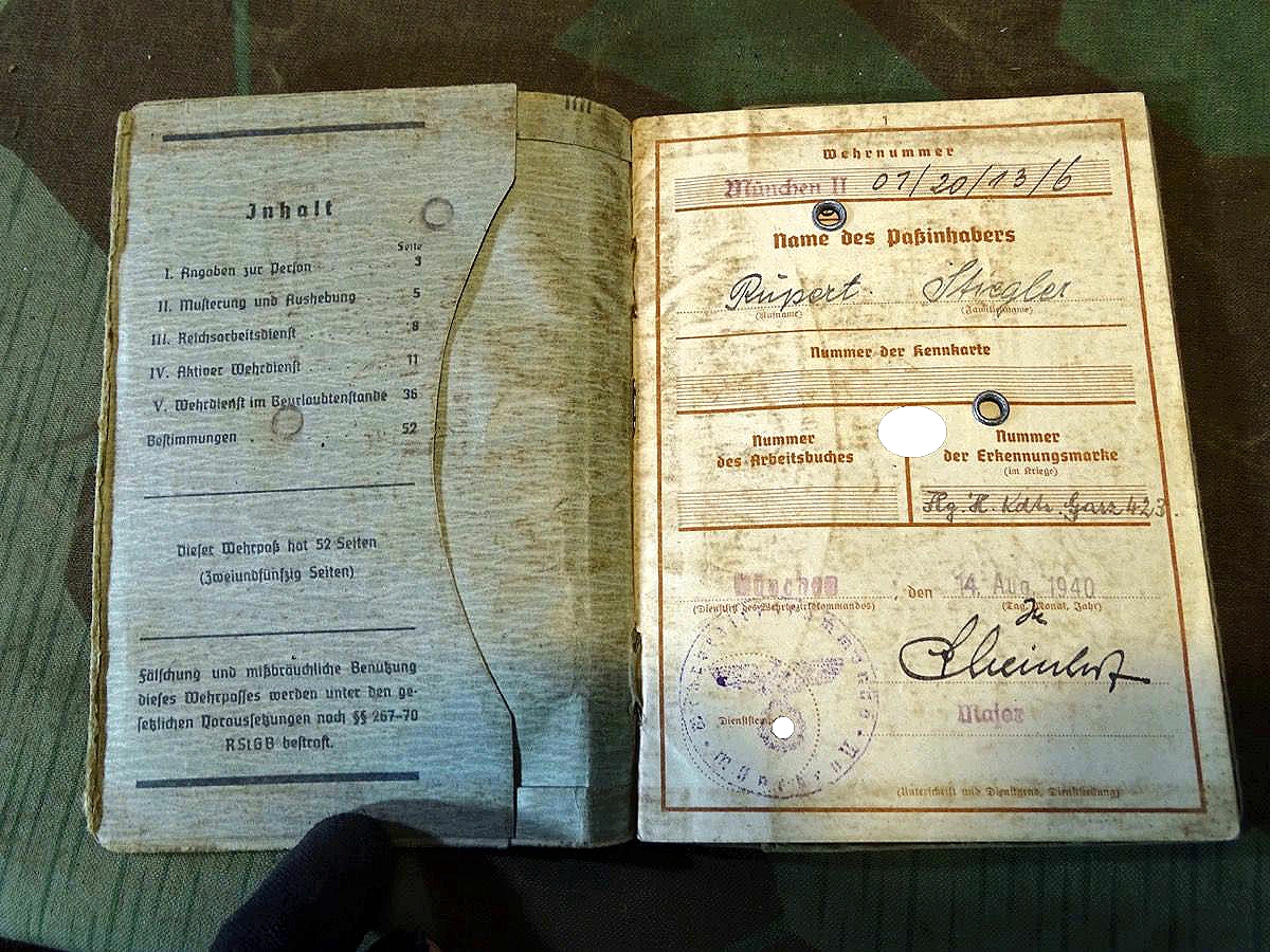 Wehrpass 2 tes Modell ab 1939, Kriegsausführung, Adler mit gespreizten Flügeln. Gebrauchter Zustand. Rupert Stieger. 1941 eingesetzt in Fliegerhorst Kompanie Garz. 1941-13.05.45 Sicherung Norwegens und Luftkrieg gegen England. Landesschützenzug 61/III . Ausgebildet an K 98. 1942 Gefreiter,1943 Obergefreiter. 01.05.1943 KvK 2. Klasse und EK 2. kl.,