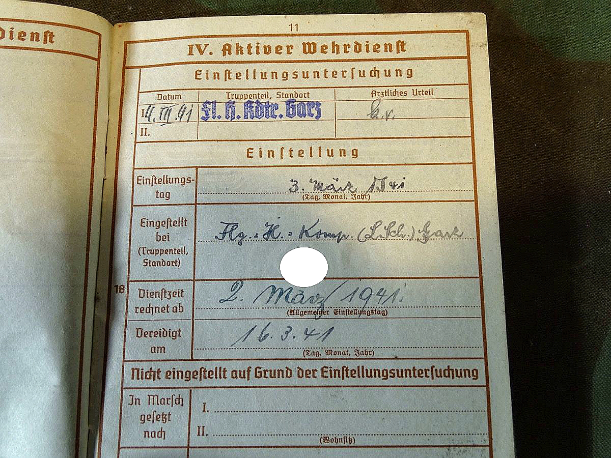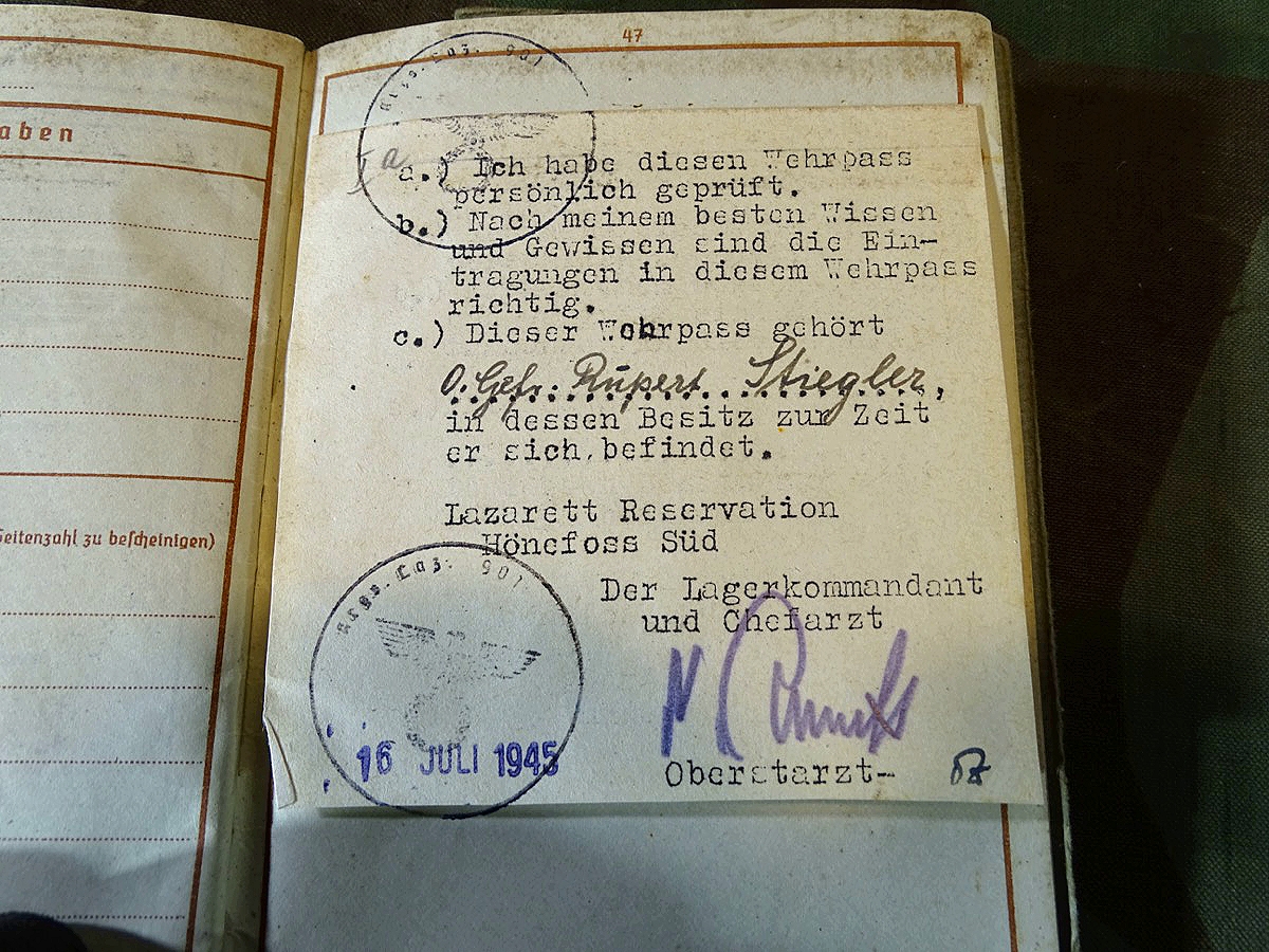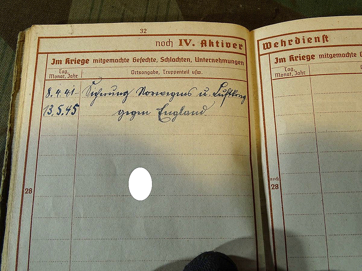 Wehrpass, R.Stieger. 1941 Fliegerhorst Kp.Garz. 1941-45 Sicherung Norwegens u.Luftkrieg m. England.