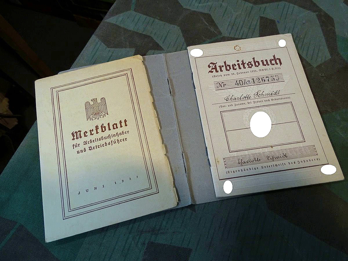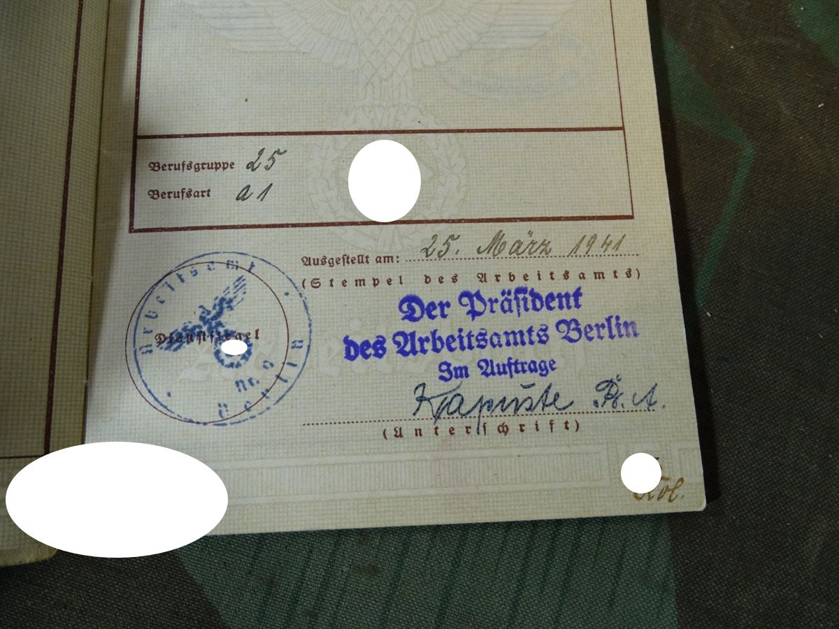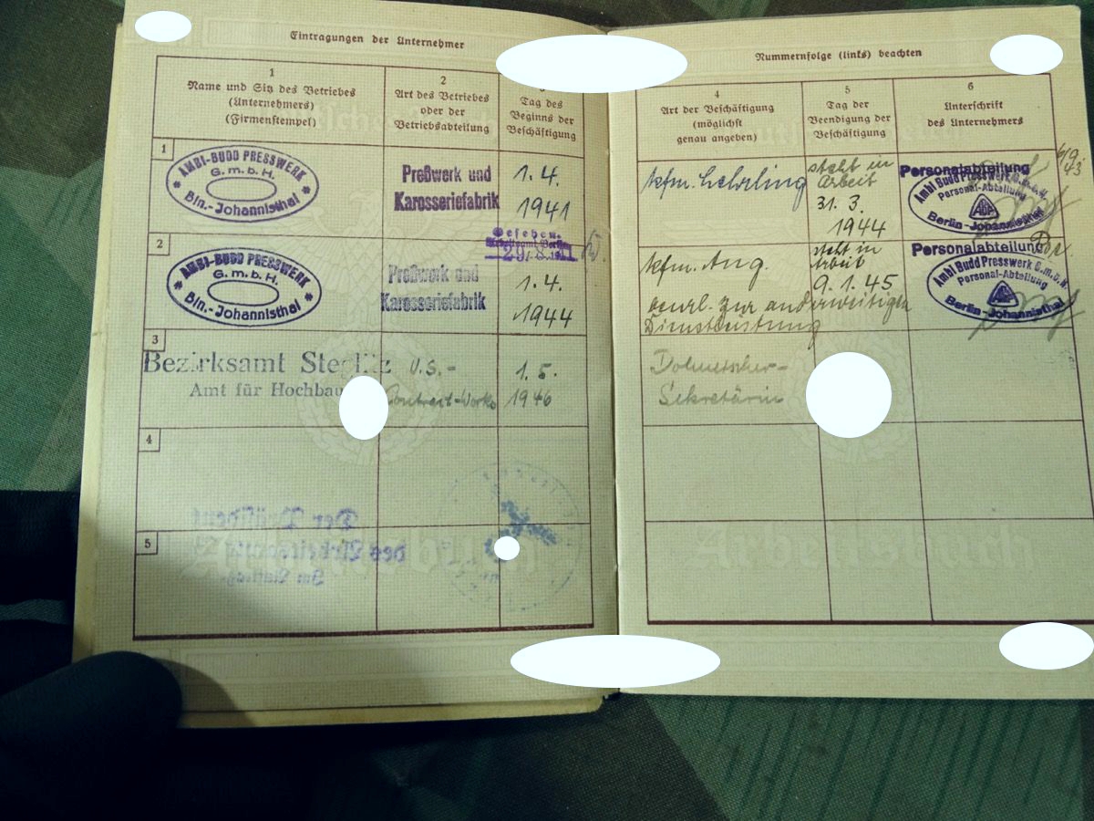 Kriegsausführung, Adler mit ausgebreiteten Flügeln. HK auf Titelblatt bei Kriegsende blau übermalt aber noch komplett zu sehen. Innenheftung lose, einfach zu reparieren. Siehe Fotos. Arbeitstätigkeit bei den Ambi Budd Presswerken und Karroseriefabrik in Berlin Johannistal von 1941-45 als kaufm. Angestellte, nach 1945 als Dollmetscherin im Hochbauamt für die US Behörden. Anbei ein Ausweis der Kinderlandverschickung von der Reichszentrale für Land Aufenthalt für Stadtkinder e.V. um 1941 ( mit 16 Jahren ) ( Gut sichtbar bei Reise zu tragen ) Zustand siehe Fotos.