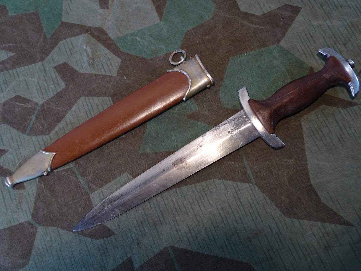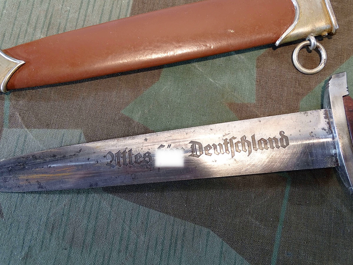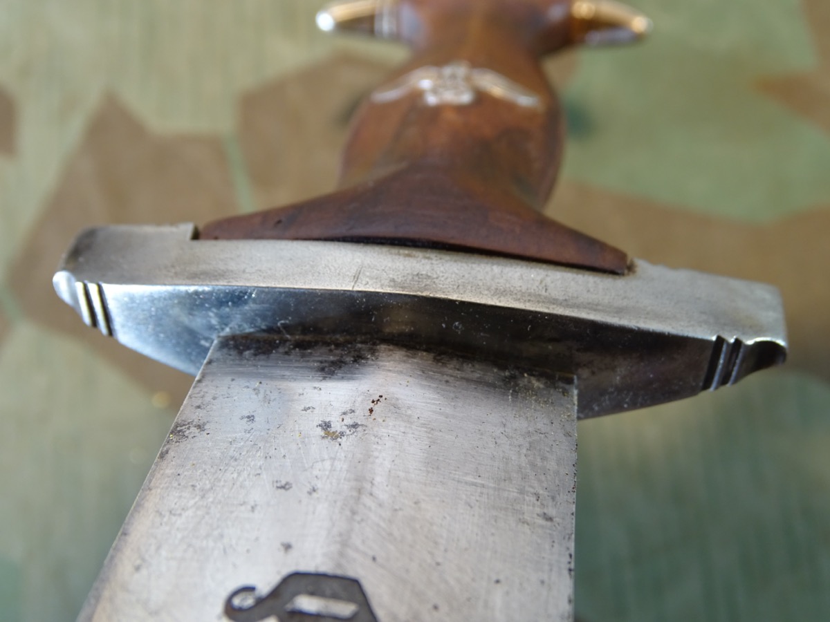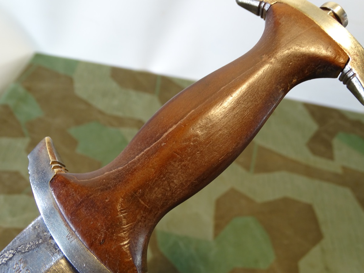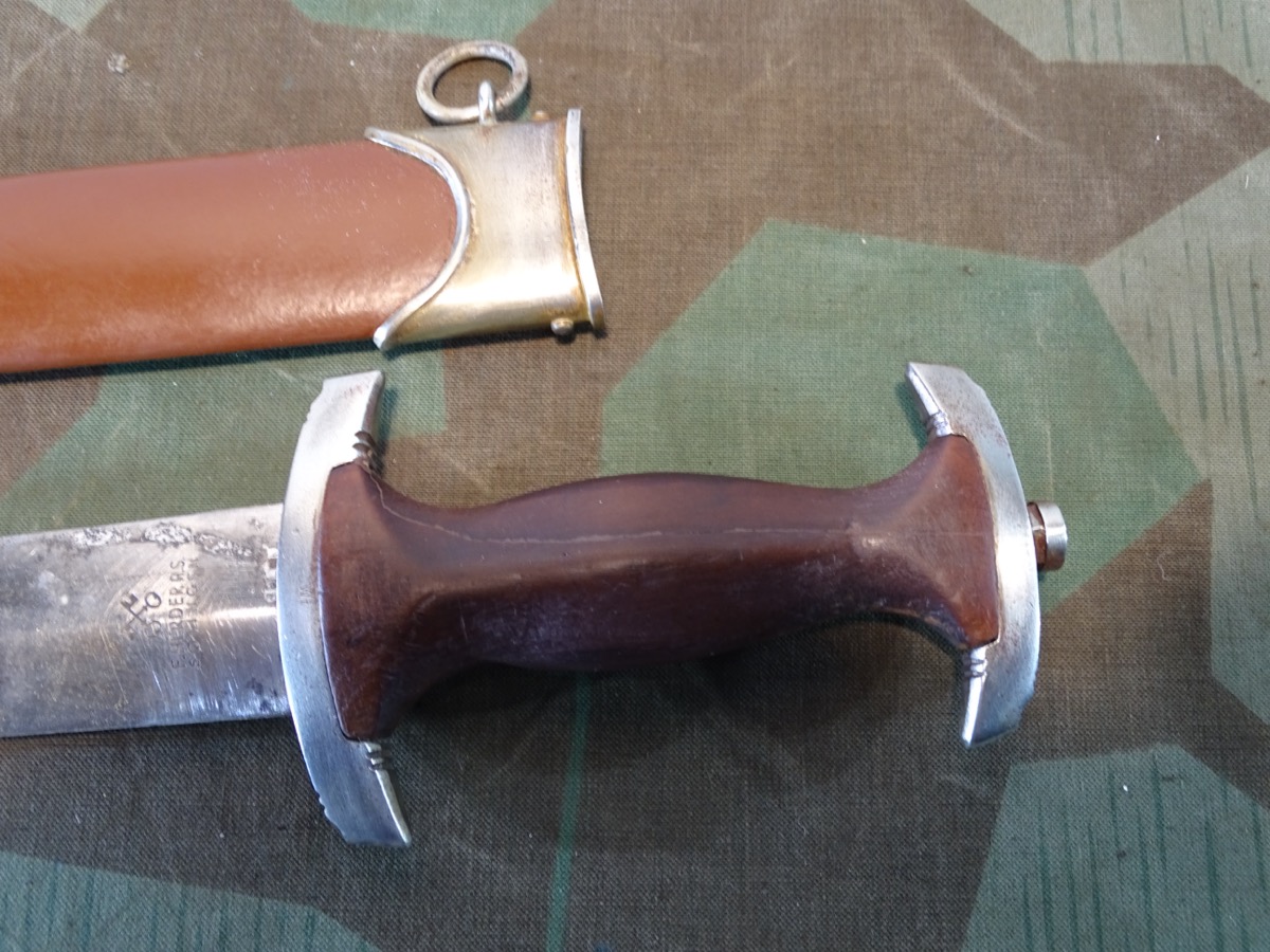 Früher und seltener SA Dolch. Auf der Klinge mit seltenem Hersteller F. Herder A.S. Solingen. Der Adler und die Pastille original und sauber eingesetzt. Der Griff mit 1 Haarriss und Lagerspuren. Auf der Parierstange mit SA-Gruppenstempelung "Wf" für Westfalen. Klinge mit schöner tiefer, dunkler Devisen Ätzung " Alles für Deutschland". Umseitig mit Herstellermarke F.Herder A.S. Solingen. Neusilber Adler, sitzt perfekt in Aussparung, war nie raus. HK vollständig erhalten. Emailliertes SA Emblem nutzungsbedingt etwas verkratzt aber vollständig ohne Emaillechips erhalten. Holz Griff sitzt gut angepasst und ohne große Abstände in den Schiffchen wie es sein soll. Neben Herstellermarke auf Klinge ein paar Narben im Metall. Klinge generell noch gut erhalten, fast glatt und blank nur mit ein paar patinierten Strellen und kleineren Narben, siehe Fotos. Griff- und Scheidenbeschläge wohl mal gereinigt. Neusilber Beschläge. An unterem Schiedenbeschlag ist eine Schraube größer als die anderen, wohl mal vom Träger ersetzt worden. Unterer Scheidenbeschlag wackelt. Parierstange mit SA Gebietsbezeichnung Wf für Westfalen. Griff auf Rückseite mit schmalem Spannungsriss, dieser mit Holzkitt oder ähnlichem farblich passend verschlossen. Scheide ist wohl mal im laufe der Nutzungszeit neu lackiert worden. Zustand siehe Fotos. Bei Bestellung bitte Altersnachweis mitsenden (Kopie vom Personalausweis).