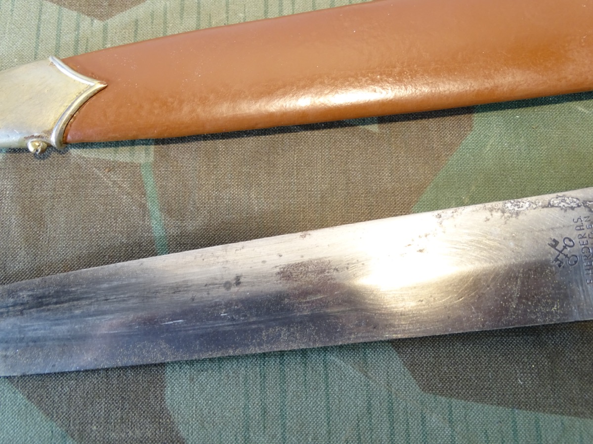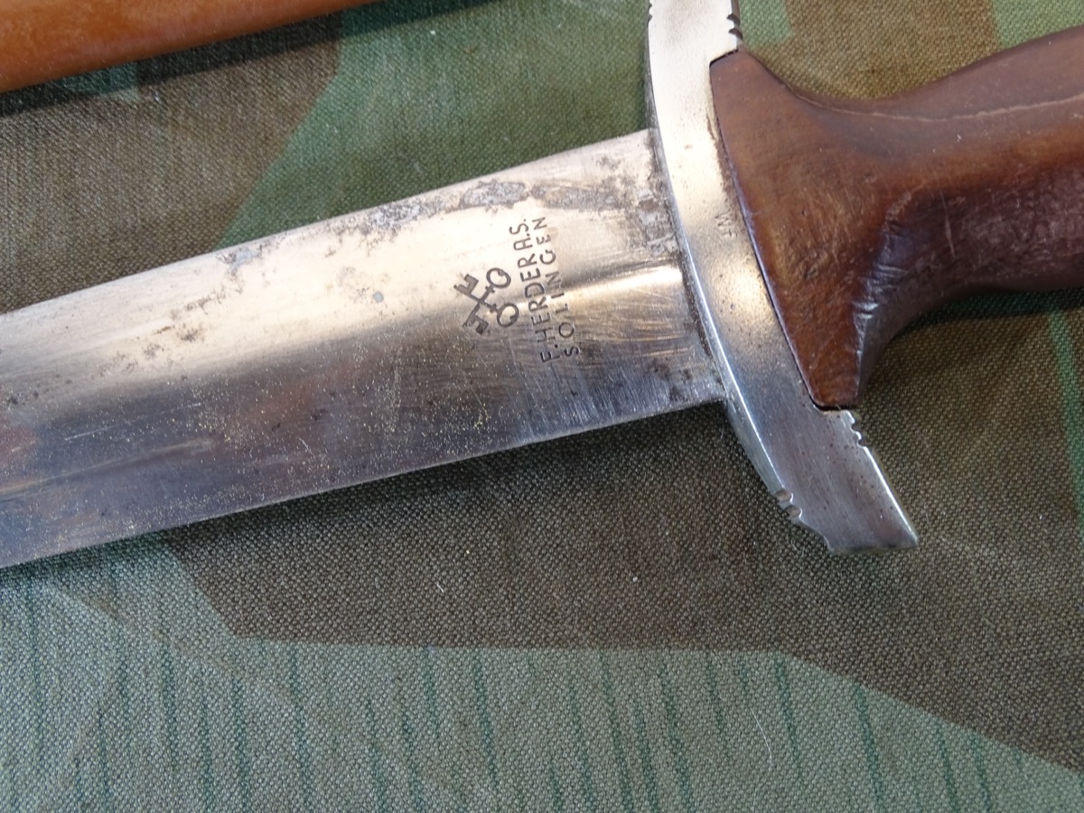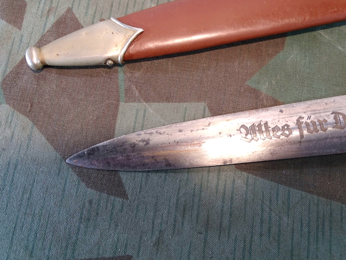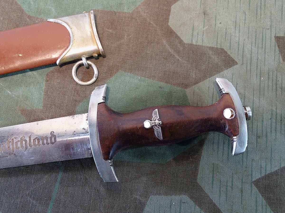 Früher und seltener SA Dolch. Auf der Klinge mit seltenem Hersteller F. Herder A.S. Solingen. Der Adler und die Pastille original und sauber eingesetzt. Der Griff mit 1 Haarriss und Lagerspuren. Auf der Parierstange mit SA-Gruppenstempelung "Wf" für Westfalen. Klinge mit schöner tiefer, dunkler Devisen Ätzung " Alles für Deutschland". Umseitig mit Herstellermarke F.Herder A.S. Solingen. Neusilber Adler, sitzt perfekt in Aussparung, war nie raus. HK vollständig erhalten. Emailliertes SA Emblem nutzungsbedingt etwas verkratzt aber vollständig ohne Emaillechips erhalten. Holz Griff sitzt gut angepasst und ohne große Abstände in den Schiffchen wie es sein soll. Neben Herstellermarke auf Klinge ein paar Narben im Metall. Klinge generell noch gut erhalten, fast glatt und blank nur mit ein paar patinierten Strellen und kleineren Narben, siehe Fotos. Griff- und Scheidenbeschläge wohl mal gereinigt. Neusilber Beschläge. An unterem Schiedenbeschlag ist eine Schraube größer als die anderen, wohl mal vom Träger ersetzt worden. Unterer Scheidenbeschlag wackelt. Parierstange mit SA Gebietsbezeichnung Wf für Westfalen. Griff auf Rückseite mit schmalem Spannungsriss, dieser mit Holzkitt oder ähnlichem farblich passend verschlossen. Scheide ist wohl mal im laufe der Nutzungszeit neu lackiert worden. Zustand siehe Fotos. Bei Bestellung bitte Altersnachweis mitsenden (Kopie vom Personalausweis).