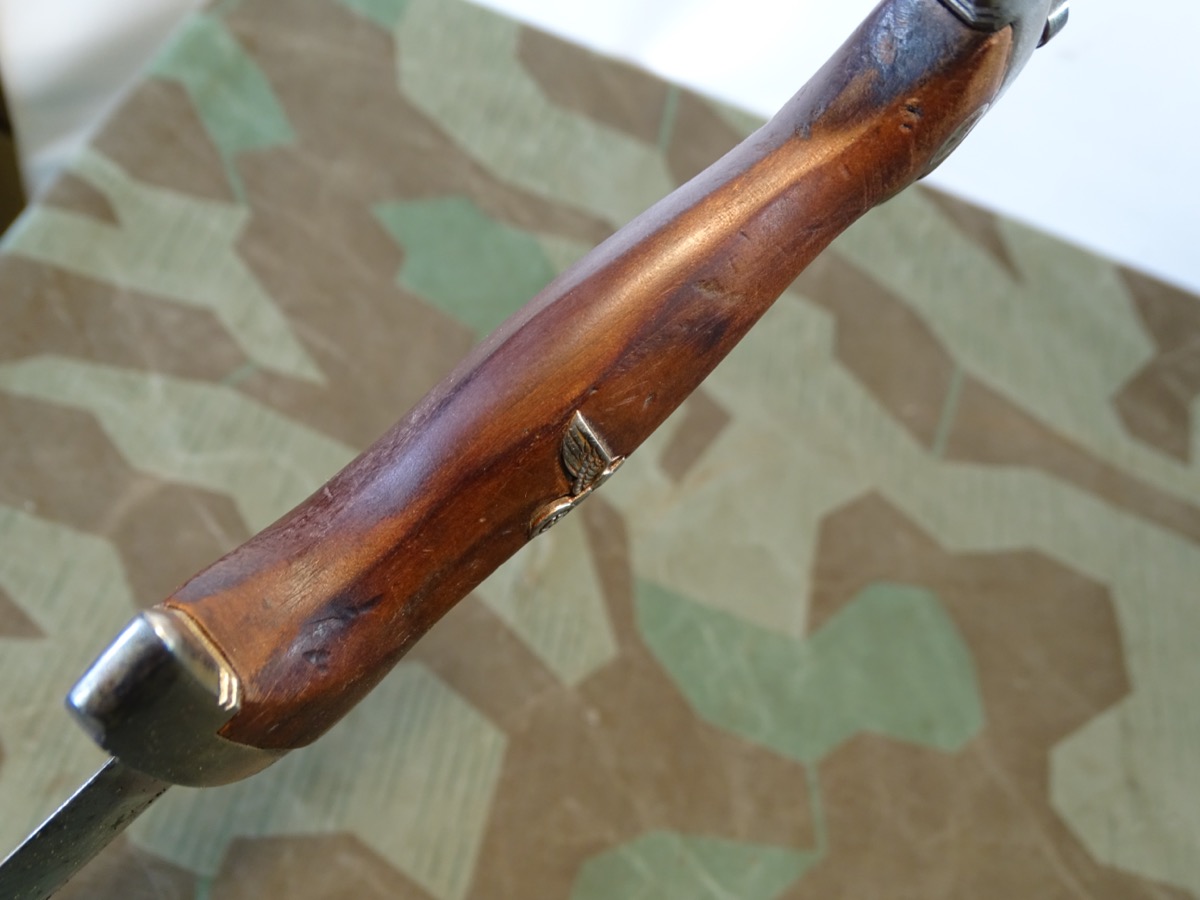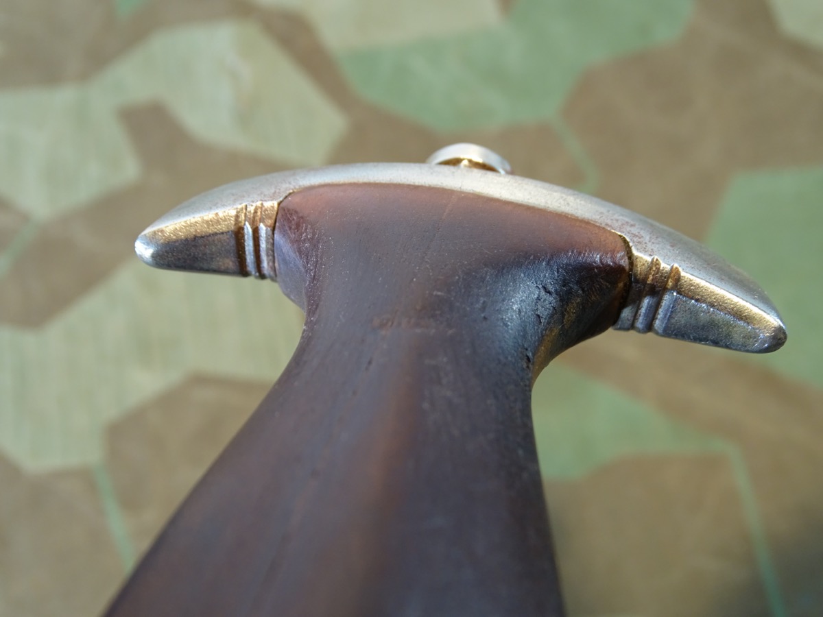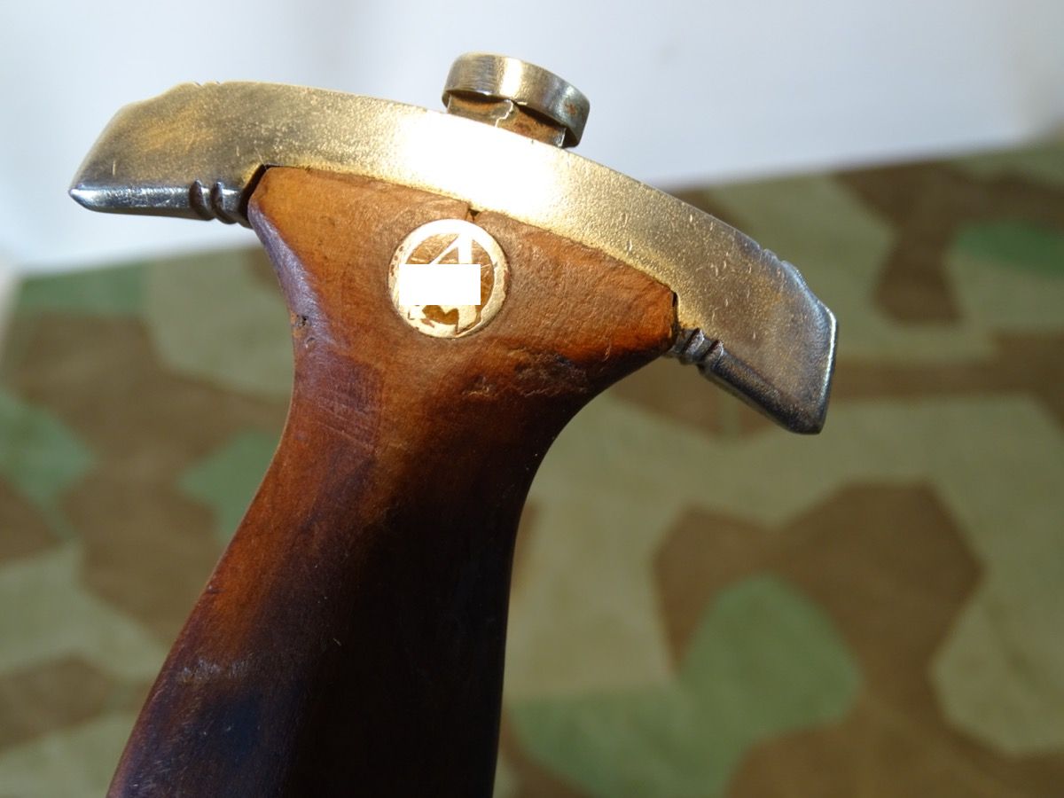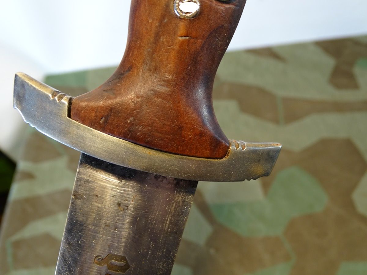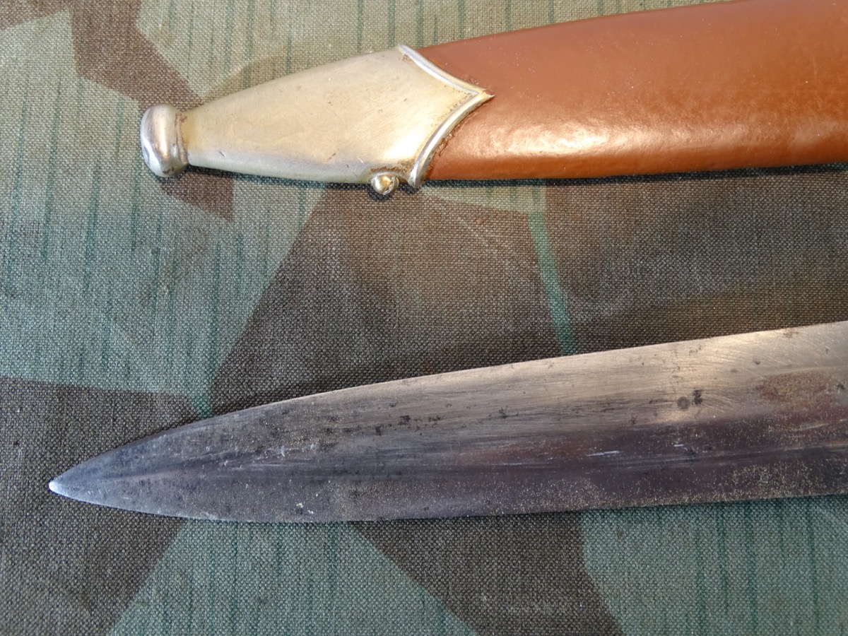 Früher und seltener SA Dolch. Auf der Klinge mit seltenem Hersteller F. Herder A.S. Solingen. Der Adler und die Pastille original und sauber eingesetzt. Der Griff mit 1 Haarriss und Lagerspuren. Auf der Parierstange mit SA-Gruppenstempelung "Wf" für Westfalen. Klinge mit schöner tiefer, dunkler Devisen Ätzung " Alles für Deutschland". Umseitig mit Herstellermarke F.Herder A.S. Solingen. Neusilber Adler, sitzt perfekt in Aussparung, war nie raus. HK vollständig erhalten. Emailliertes SA Emblem nutzungsbedingt etwas verkratzt aber vollständig ohne Emaillechips erhalten. Holz Griff sitzt gut angepasst und ohne große Abstände in den Schiffchen wie es sein soll. Neben Herstellermarke auf Klinge ein paar Narben im Metall. Klinge generell noch gut erhalten, fast glatt und blank nur mit ein paar patinierten Strellen und kleineren Narben, siehe Fotos. Griff- und Scheidenbeschläge wohl mal gereinigt. Neusilber Beschläge. An unterem Schiedenbeschlag ist eine Schraube größer als die anderen, wohl mal vom Träger ersetzt worden. Unterer Scheidenbeschlag wackelt. Parierstange mit SA Gebietsbezeichnung Wf für Westfalen. Griff auf Rückseite mit schmalem Spannungsriss, dieser mit Holzkitt oder ähnlichem farblich passend verschlossen. Scheide ist wohl mal im laufe der Nutzungszeit neu lackiert worden. Zustand siehe Fotos. Bei Bestellung bitte Altersnachweis mitsenden (Kopie vom Personalausweis).