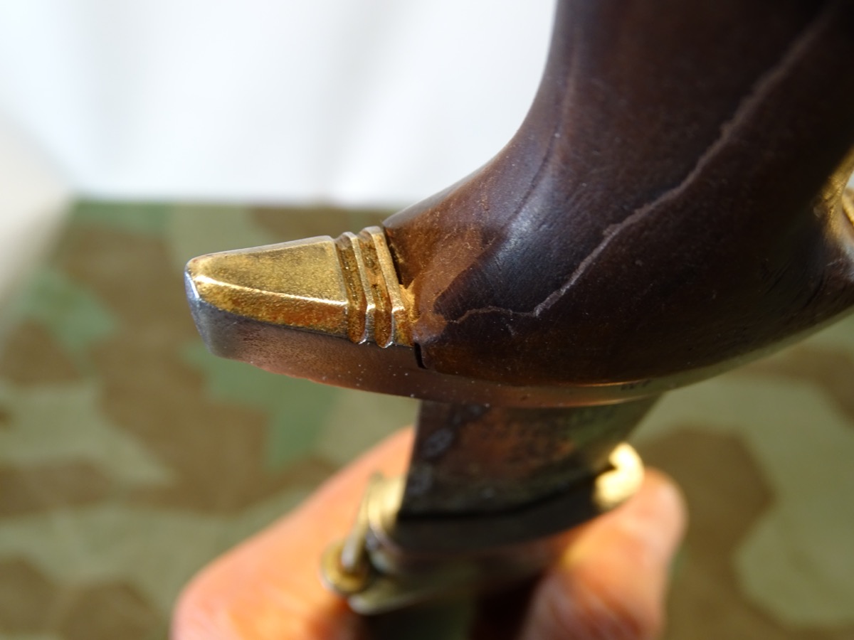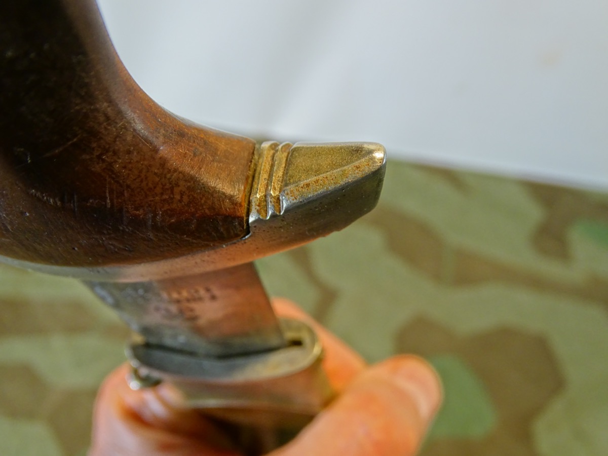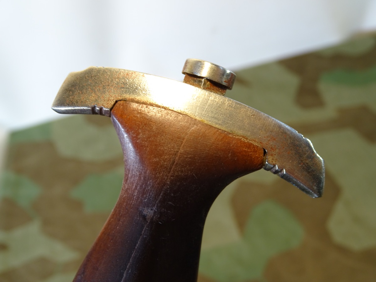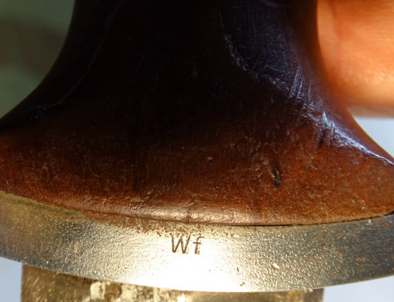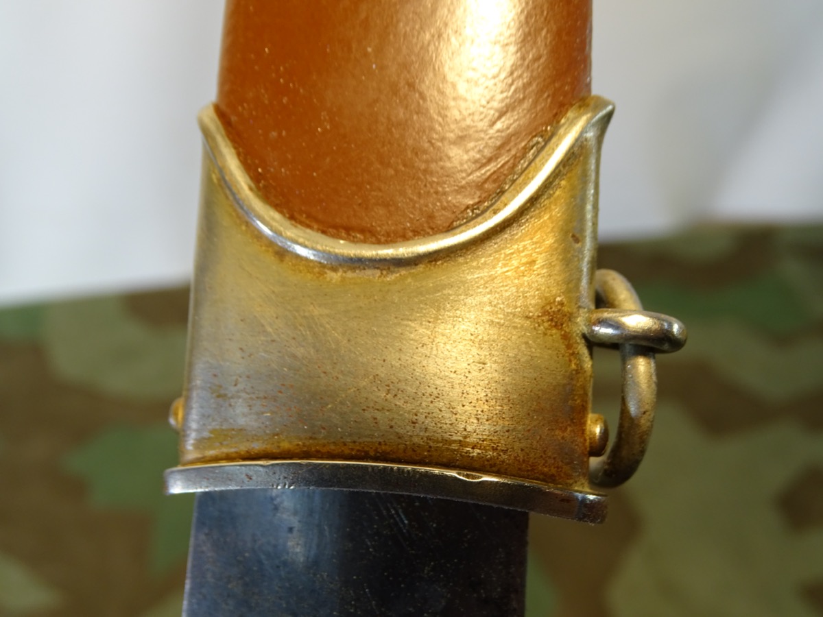 Früher und seltener SA Dolch. Auf der Klinge mit seltenem Hersteller F. Herder A.S. Solingen. Der Adler und die Pastille original und sauber eingesetzt. Der Griff mit 1 Haarriss und Lagerspuren. Auf der Parierstange mit SA-Gruppenstempelung "Wf" für Westfalen. Klinge mit schöner tiefer, dunkler Devisen Ätzung " Alles für Deutschland". Umseitig mit Herstellermarke F.Herder A.S. Solingen. Neusilber Adler, sitzt perfekt in Aussparung, war nie raus. HK vollständig erhalten. Emailliertes SA Emblem nutzungsbedingt etwas verkratzt aber vollständig ohne Emaillechips erhalten. Holz Griff sitzt gut angepasst und ohne große Abstände in den Schiffchen wie es sein soll. Neben Herstellermarke auf Klinge ein paar Narben im Metall. Klinge generell noch gut erhalten, fast glatt und blank nur mit ein paar patinierten Strellen und kleineren Narben, siehe Fotos. Griff- und Scheidenbeschläge wohl mal gereinigt. Neusilber Beschläge. An unterem Schiedenbeschlag ist eine Schraube größer als die anderen, wohl mal vom Träger ersetzt worden. Unterer Scheidenbeschlag wackelt. Parierstange mit SA Gebietsbezeichnung Wf für Westfalen. Griff auf Rückseite mit schmalem Spannungsriss, dieser mit Holzkitt oder ähnlichem farblich passend verschlossen. Scheide ist wohl mal im laufe der Nutzungszeit neu lackiert worden. Zustand siehe Fotos. Bei Bestellung bitte Altersnachweis mitsenden (Kopie vom Personalausweis).