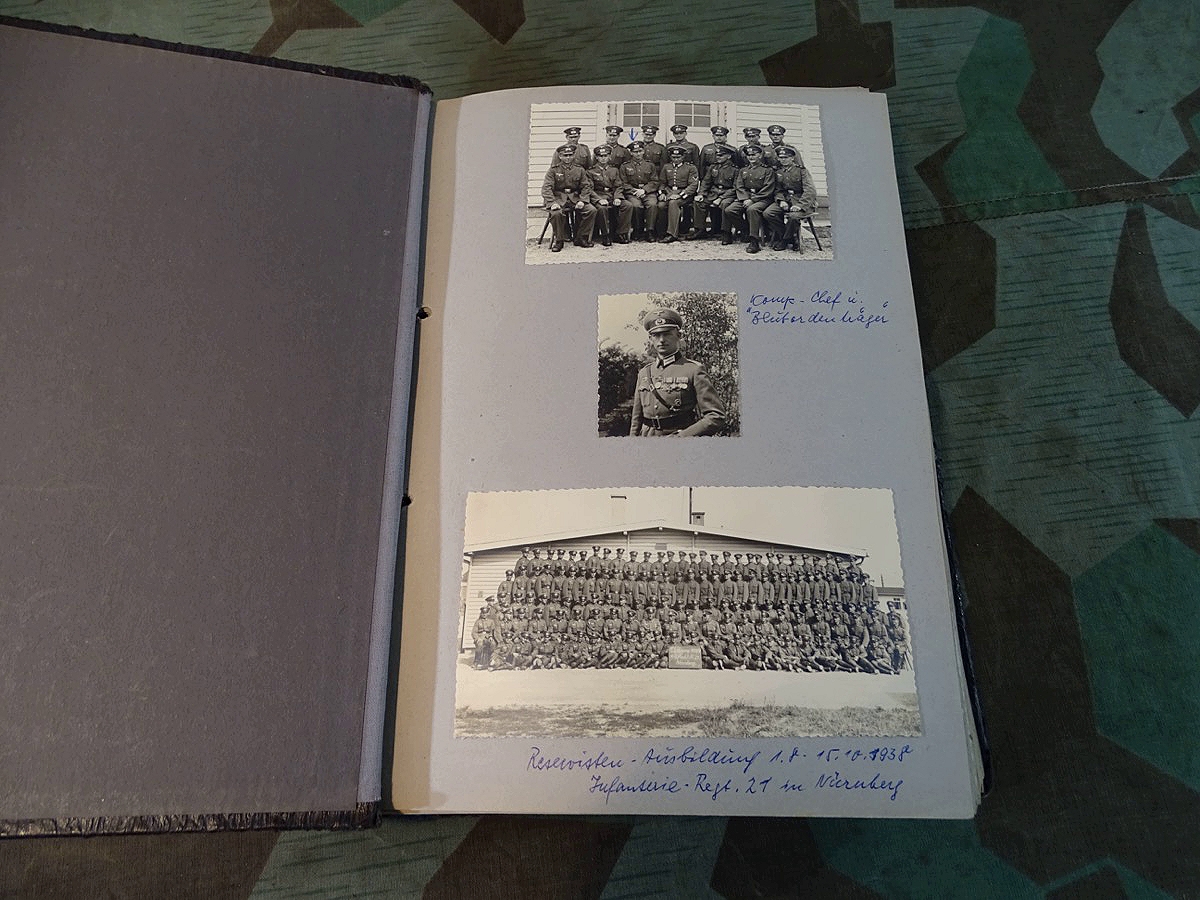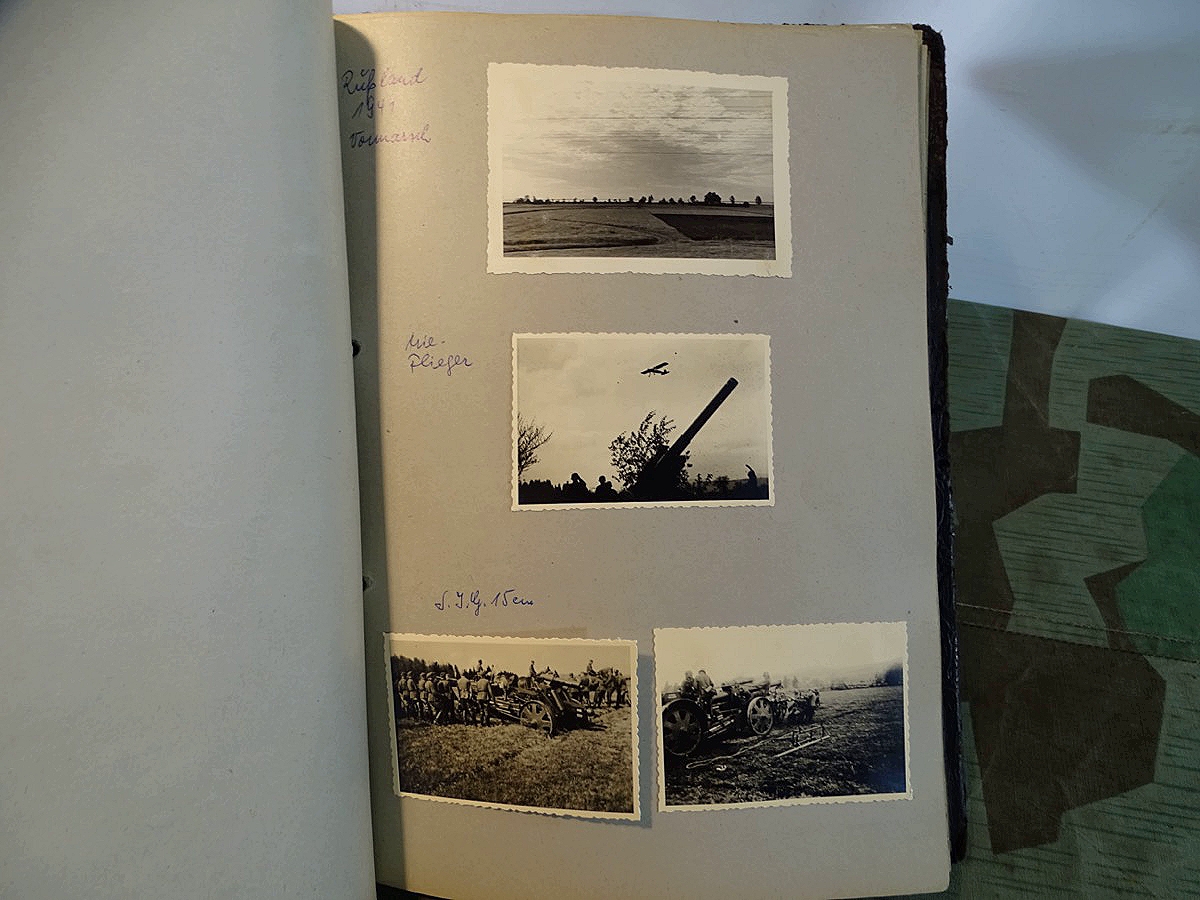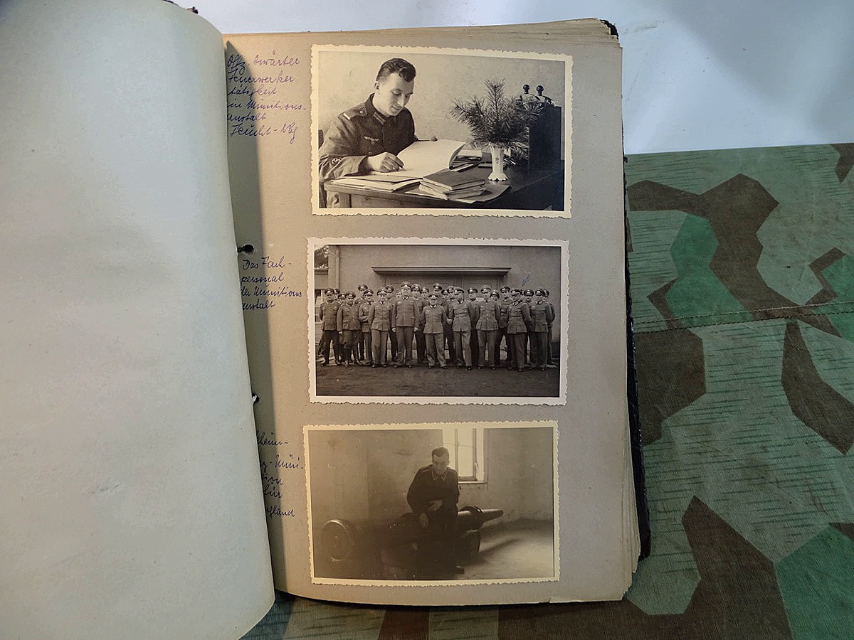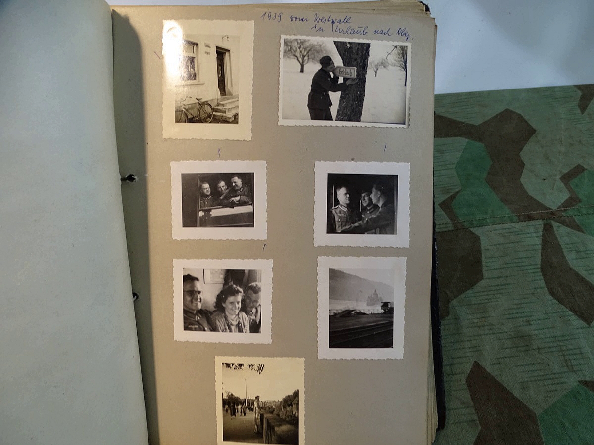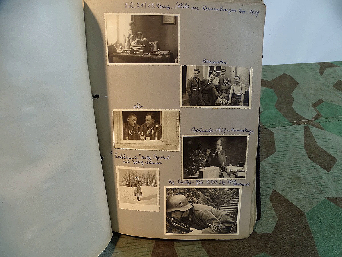 Schöner, offizieller Dienstzeitalbum Original Einband. Silbern teifgeprägter Hoheitsadler und Schrift. Innen wohl mal nach dem Krieg vom ehem. Soldaten neu aufbereitet worden, da mit Kuli beschriftet. Fotos sauber eingeklebt und sauber, lesbar beschriftet. Inhalte und Beschriftungen der Bilder : Gruppenbild mit Schild: 5 Jahrgang 1937/38 15 Ers. Kp Inf Rgt 21 Nürnberg, auf Schulterklappen die 21 lesbar. /Offiziersportrait Kp. Chef mit vielen Orden und Beschriftung: Blutorden/ Polen 1939,IR 21, 17Div. Deutscher Panzer bei Kutno/Zerstörte WH Autos, tote Pferde, flüchtende Bevölkerung, zerstörte Gebäude, Gefangene/ 1939 im Westwall/ Schönes Foto Soldat mit MG 34, Helmabzeichen, Gefreitenwinkel/ 1940 Feuerwerkerschule Berlin Lichterfelde/ Foto " Geheim - Spezial Munition für England??? Geheime Rakete oder Hochgeschwindigkeits Munition ???/ Munitions Anstallt in Feucht/ 3 sehr schöne, seltene Postkarten Fotos : Frauen beim Nähen von Pulversäckchen für Munition und Männer beim Befüllen von Granaten. / 1940 Frankreich, Fontainebleu, La Rochelle/ 4 seltene Fotos Postkartengrösse, Eisenbahngeschütz ( Theodor Bruno E ?) / Bologna / Portrait mit F Feuerwerker Abz. auf Ärmel. / Le Havre / Bourges / Paris/Sprengung von Feind Munition / Beute Waffen / Farbige Gefangene bei Arbeitseinsatz / Russland 1941/42, Smolensk / 2 Fotos schweres Inf. Geschütz 15 cm / Serhr schönes Foto, WH Soldaten in Wende Tarnanzügen , Splinter tarn, Handschuhe, Feldmützen 43, Winter Russland 1943/44/ Viele deutsche Gräber / Russland 1943/44 Fotos " Auf Partisanen Jagd, mit MG 34 und MP 40 , Helm mit Mückenschleier/ Foto einer kleinen Pak, deutsche 3,7 oder russ. 5 cm Beute.