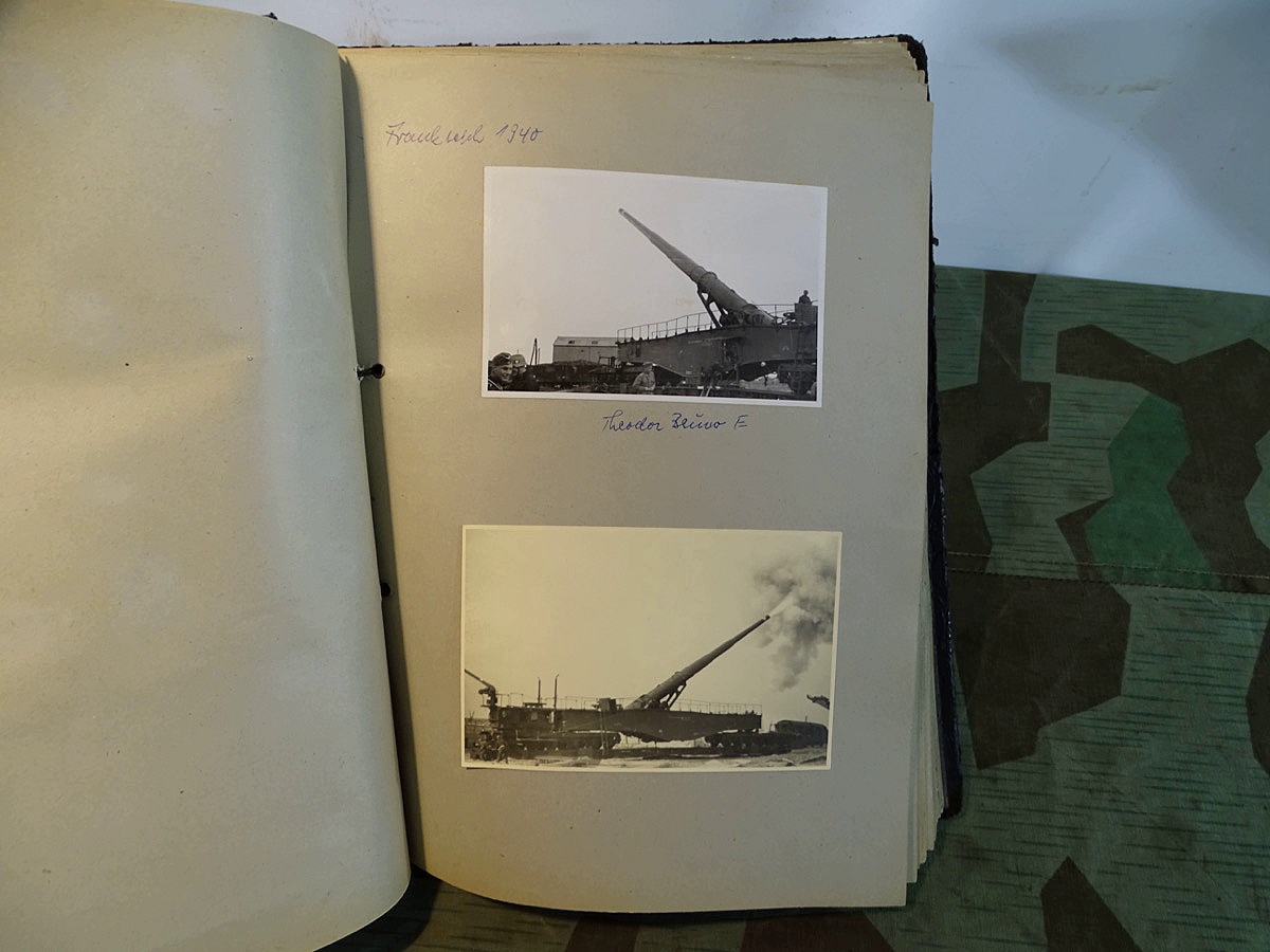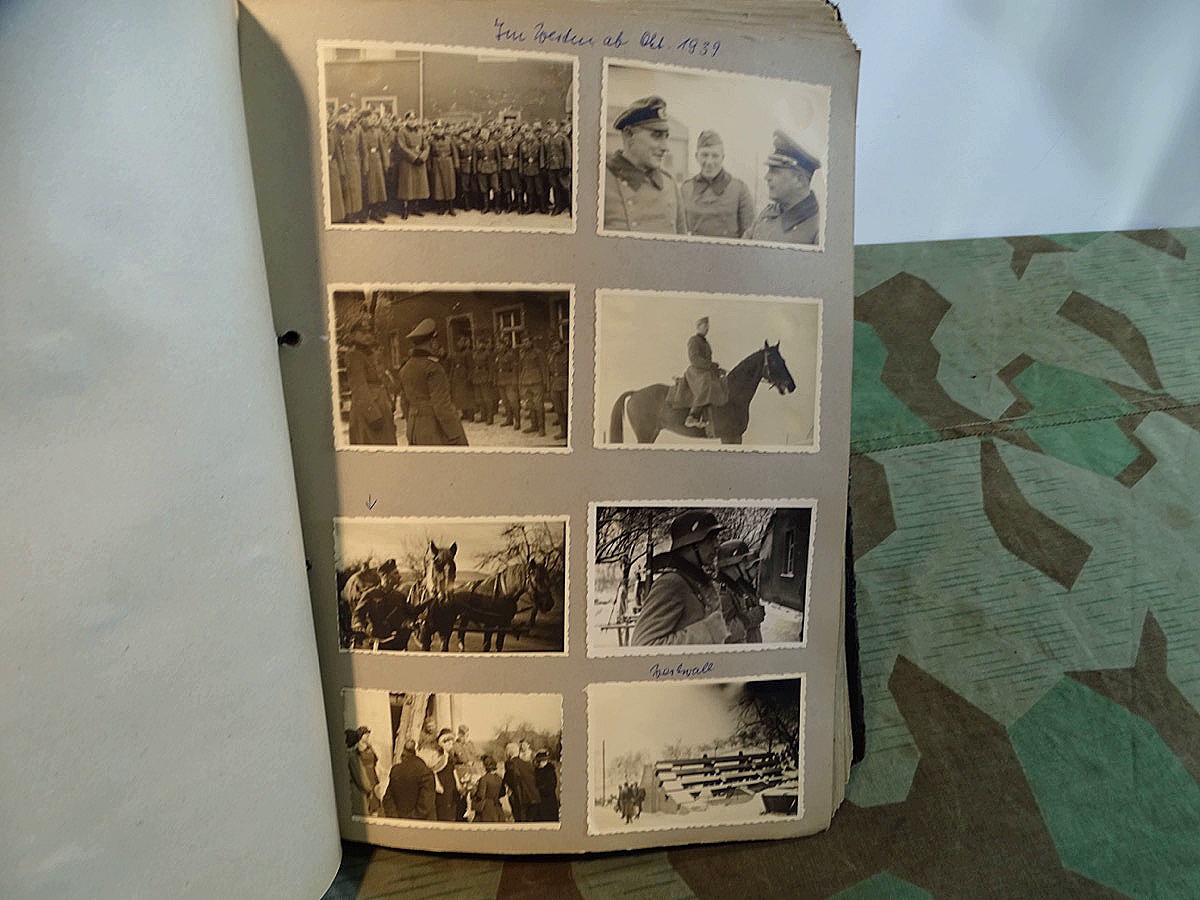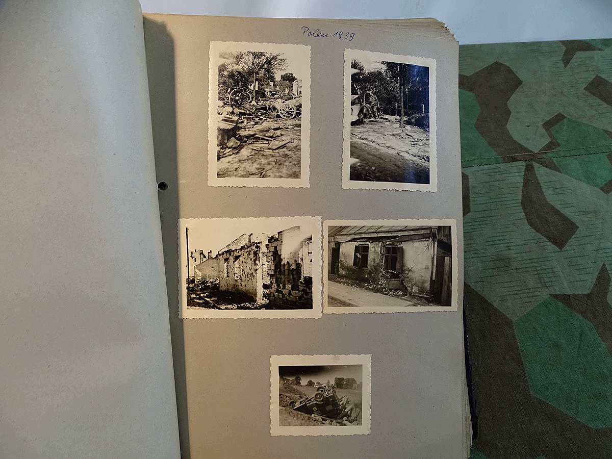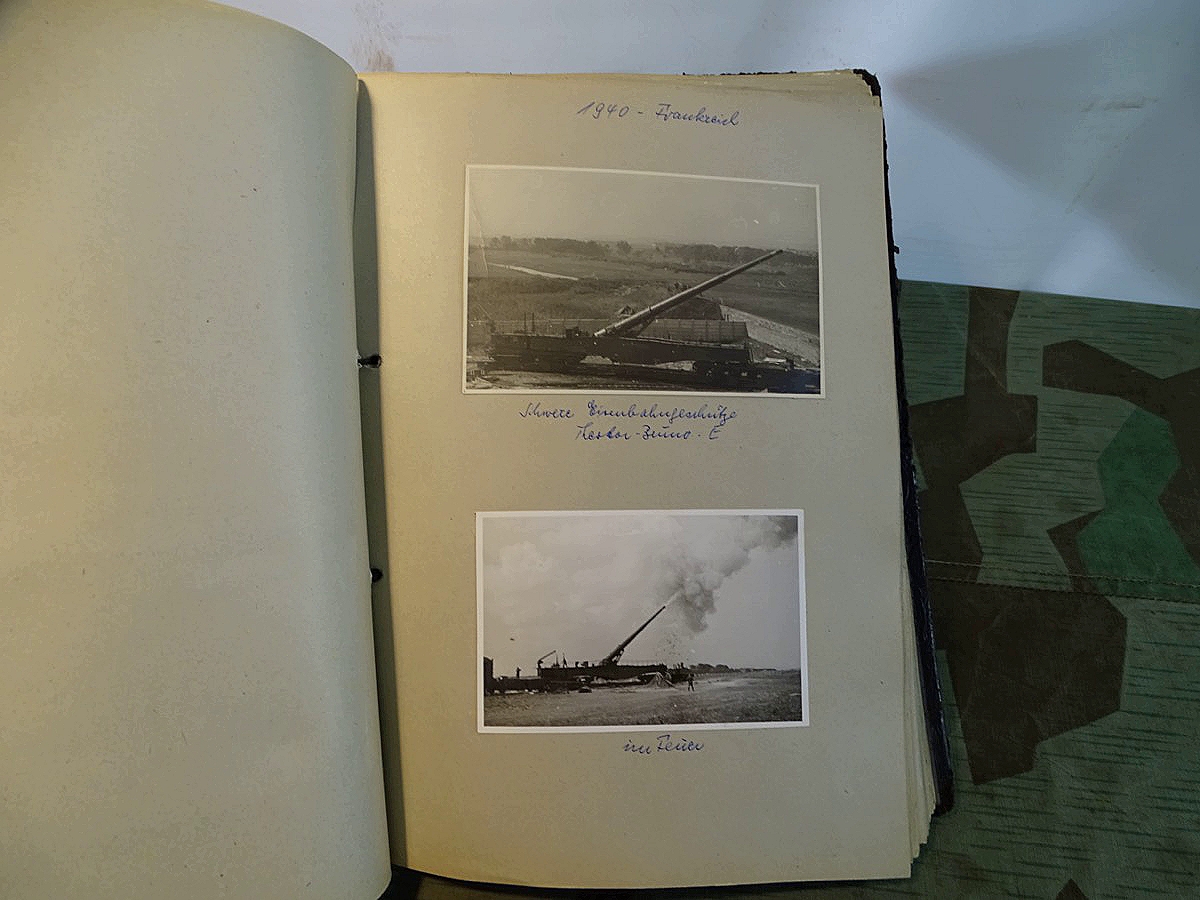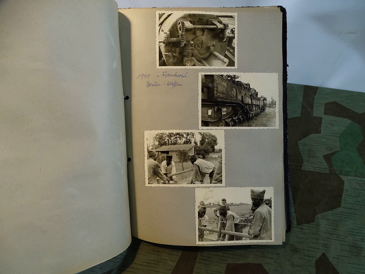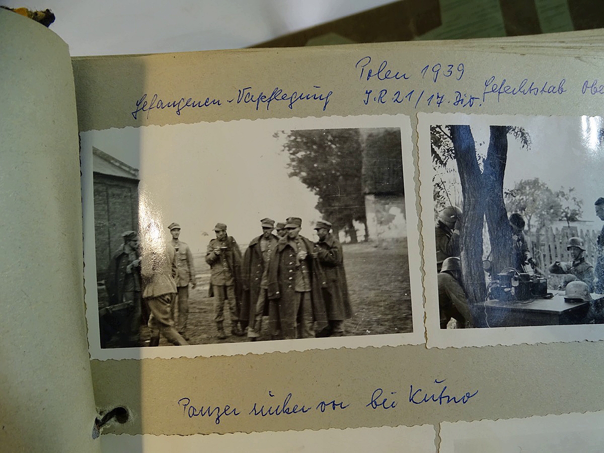 Schöner, offizieller Dienstzeitalbum Original Einband. Silbern teifgeprägter Hoheitsadler und Schrift. Innen wohl mal nach dem Krieg vom ehem. Soldaten neu aufbereitet worden, da mit Kuli beschriftet. Fotos sauber eingeklebt und sauber, lesbar beschriftet. Inhalte und Beschriftungen der Bilder : Gruppenbild mit Schild: 5 Jahrgang 1937/38 15 Ers. Kp Inf Rgt 21 Nürnberg, auf Schulterklappen die 21 lesbar. /Offiziersportrait Kp. Chef mit vielen Orden und Beschriftung: Blutorden/ Polen 1939,IR 21, 17Div. Deutscher Panzer bei Kutno/Zerstörte WH Autos, tote Pferde, flüchtende Bevölkerung, zerstörte Gebäude, Gefangene/ 1939 im Westwall/ Schönes Foto Soldat mit MG 34, Helmabzeichen, Gefreitenwinkel/ 1940 Feuerwerkerschule Berlin Lichterfelde/ Foto " Geheim - Spezial Munition für England??? Geheime Rakete oder Hochgeschwindigkeits Munition ???/ Munitions Anstallt in Feucht/ 3 sehr schöne, seltene Postkarten Fotos : Frauen beim Nähen von Pulversäckchen für Munition und Männer beim Befüllen von Granaten. / 1940 Frankreich, Fontainebleu, La Rochelle/ 4 seltene Fotos Postkartengrösse, Eisenbahngeschütz ( Theodor Bruno E ?) / Bologna / Portrait mit F Feuerwerker Abz. auf Ärmel. / Le Havre / Bourges / Paris/Sprengung von Feind Munition / Beute Waffen / Farbige Gefangene bei Arbeitseinsatz / Russland 1941/42, Smolensk / 2 Fotos schweres Inf. Geschütz 15 cm / Serhr schönes Foto, WH Soldaten in Wende Tarnanzügen , Splinter tarn, Handschuhe, Feldmützen 43, Winter Russland 1943/44/ Viele deutsche Gräber / Russland 1943/44 Fotos " Auf Partisanen Jagd, mit MG 34 und MP 40 , Helm mit Mückenschleier/ Foto einer kleinen Pak, deutsche 3,7 oder russ. 5 cm Beute.