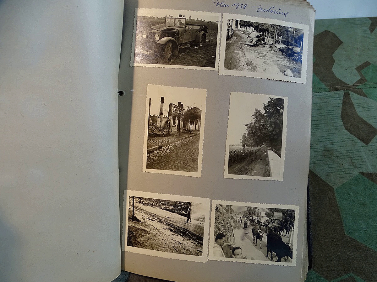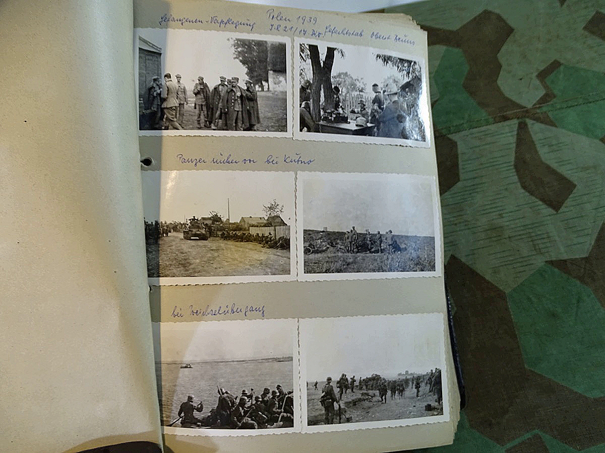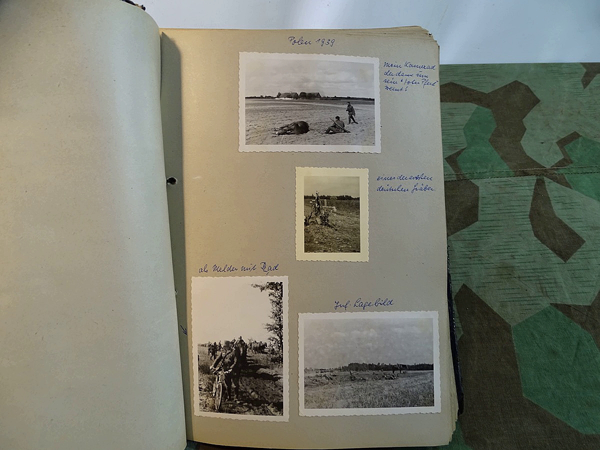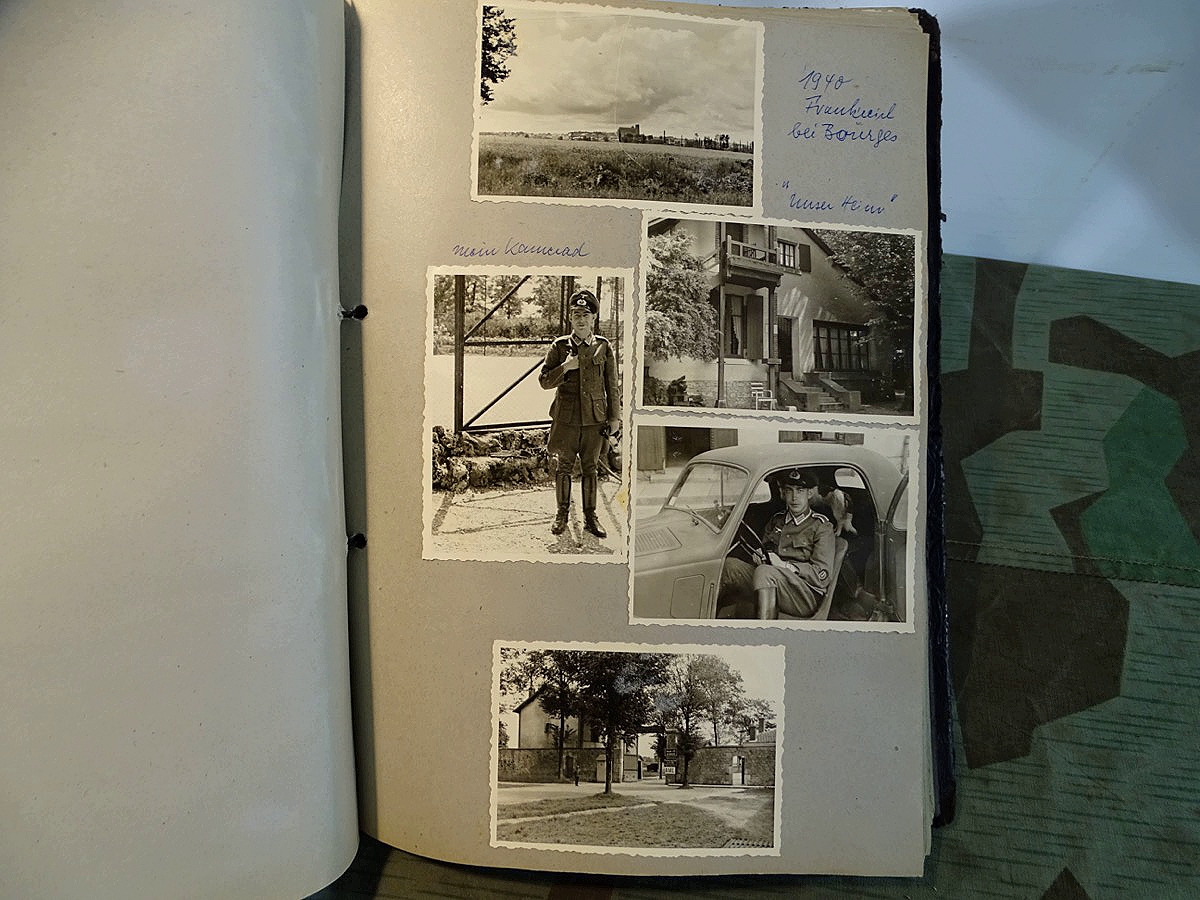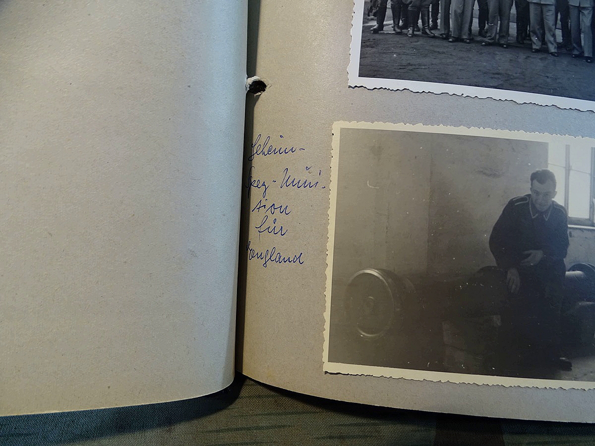 Schöner, offizieller Dienstzeitalbum Original Einband. Silbern teifgeprägter Hoheitsadler und Schrift. Innen wohl mal nach dem Krieg vom ehem. Soldaten neu aufbereitet worden, da mit Kuli beschriftet. Fotos sauber eingeklebt und sauber, lesbar beschriftet. Inhalte und Beschriftungen der Bilder : Gruppenbild mit Schild: 5 Jahrgang 1937/38 15 Ers. Kp Inf Rgt 21 Nürnberg, auf Schulterklappen die 21 lesbar. /Offiziersportrait Kp. Chef mit vielen Orden und Beschriftung: Blutorden/ Polen 1939,IR 21, 17Div. Deutscher Panzer bei Kutno/Zerstörte WH Autos, tote Pferde, flüchtende Bevölkerung, zerstörte Gebäude, Gefangene/ 1939 im Westwall/ Schönes Foto Soldat mit MG 34, Helmabzeichen, Gefreitenwinkel/ 1940 Feuerwerkerschule Berlin Lichterfelde/ Foto " Geheim - Spezial Munition für England??? Geheime Rakete oder Hochgeschwindigkeits Munition ???/ Munitions Anstallt in Feucht/ 3 sehr schöne, seltene Postkarten Fotos : Frauen beim Nähen von Pulversäckchen für Munition und Männer beim Befüllen von Granaten. / 1940 Frankreich, Fontainebleu, La Rochelle/ 4 seltene Fotos Postkartengrösse, Eisenbahngeschütz ( Theodor Bruno E ?) / Bologna / Portrait mit F Feuerwerker Abz. auf Ärmel. / Le Havre / Bourges / Paris/Sprengung von Feind Munition / Beute Waffen / Farbige Gefangene bei Arbeitseinsatz / Russland 1941/42, Smolensk / 2 Fotos schweres Inf. Geschütz 15 cm / Serhr schönes Foto, WH Soldaten in Wende Tarnanzügen , Splinter tarn, Handschuhe, Feldmützen 43, Winter Russland 1943/44/ Viele deutsche Gräber / Russland 1943/44 Fotos " Auf Partisanen Jagd, mit MG 34 und MP 40 , Helm mit Mückenschleier/ Foto einer kleinen Pak, deutsche 3,7 oder russ. 5 cm Beute.