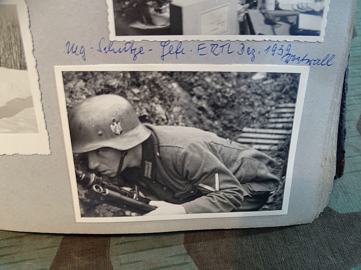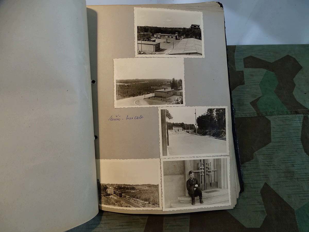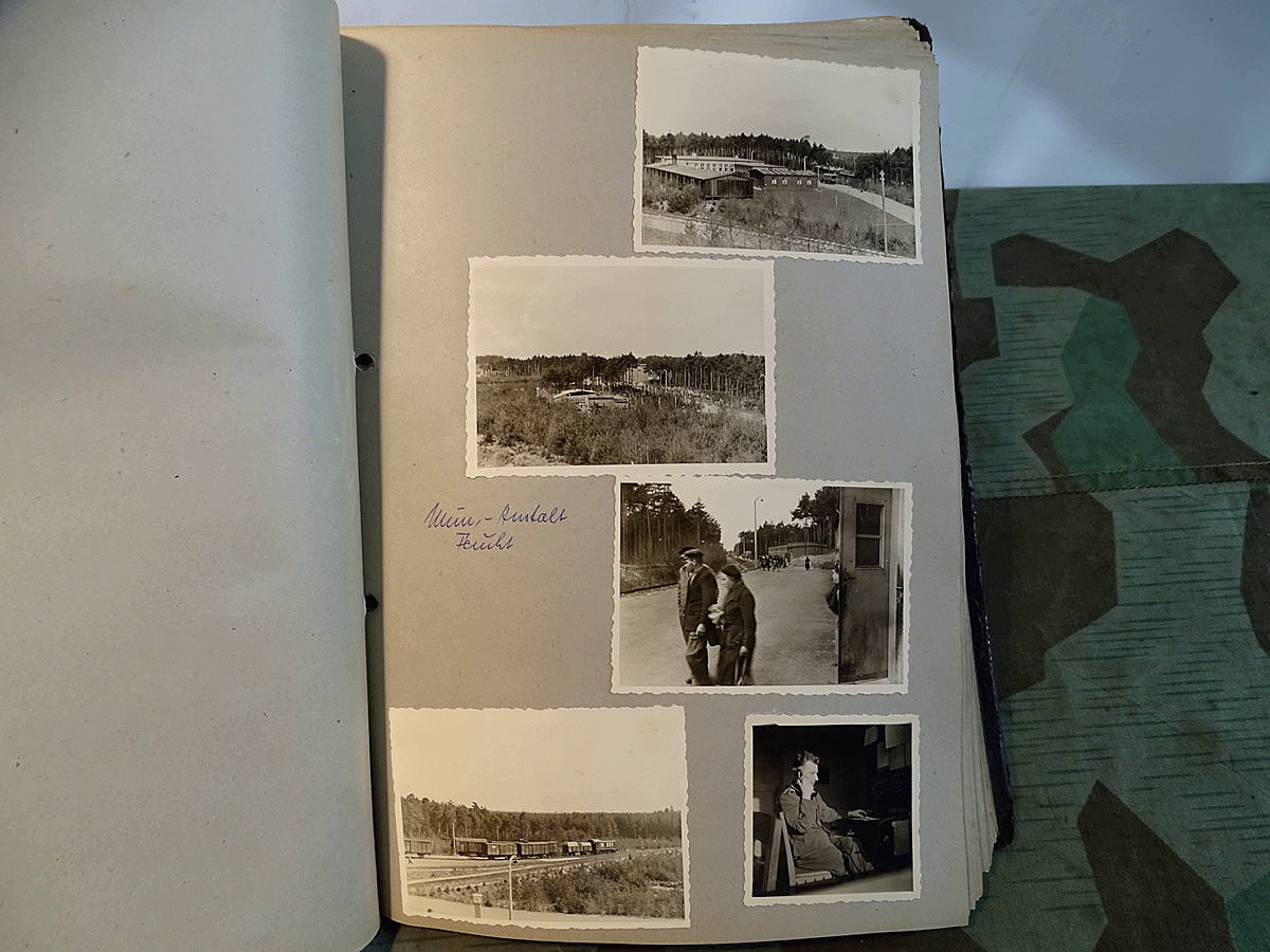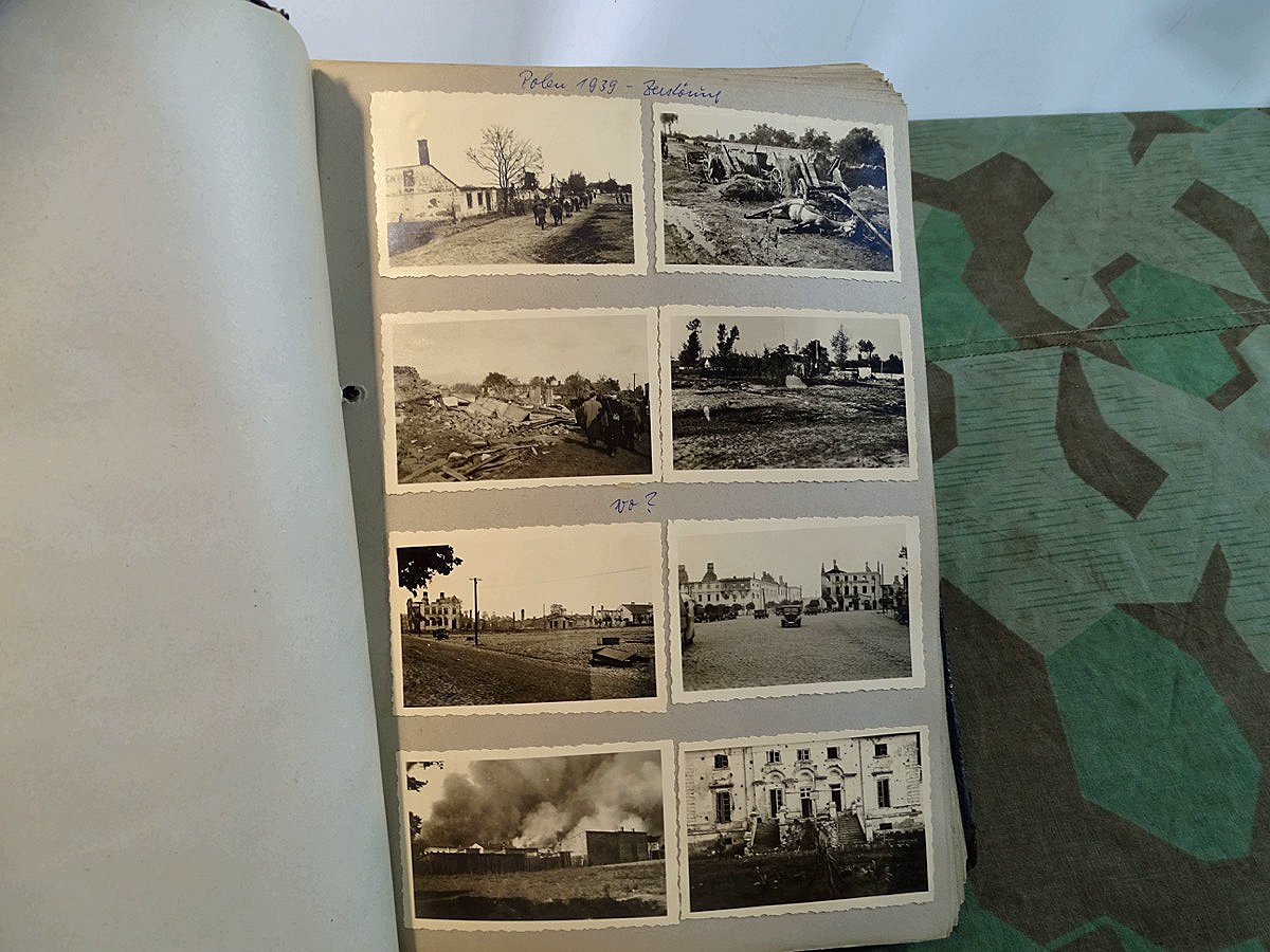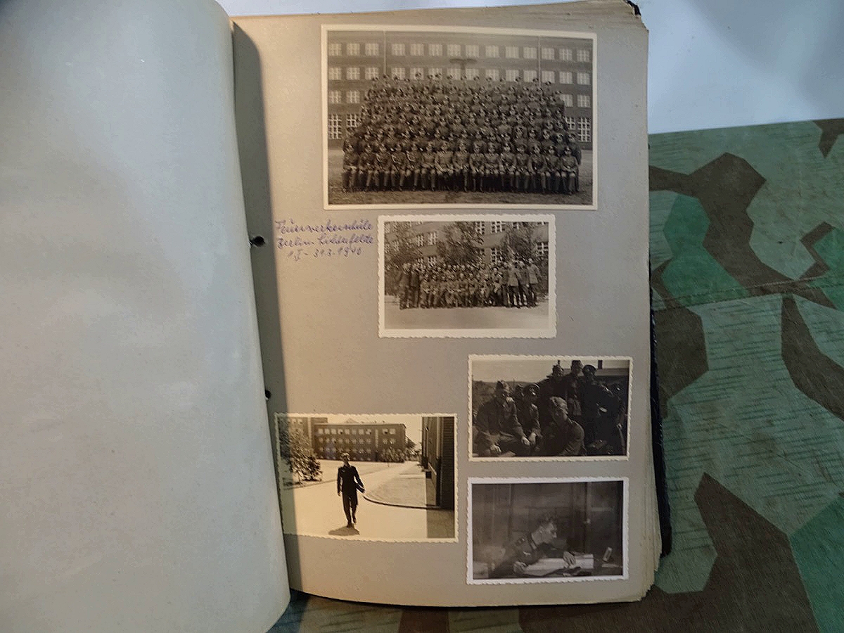 Schöner, offizieller Dienstzeitalbum Original Einband. Silbern teifgeprägter Hoheitsadler und Schrift. Innen wohl mal nach dem Krieg vom ehem. Soldaten neu aufbereitet worden, da mit Kuli beschriftet. Fotos sauber eingeklebt und sauber, lesbar beschriftet. Inhalte und Beschriftungen der Bilder : Gruppenbild mit Schild: 5 Jahrgang 1937/38 15 Ers. Kp Inf Rgt 21 Nürnberg, auf Schulterklappen die 21 lesbar. /Offiziersportrait Kp. Chef mit vielen Orden und Beschriftung: Blutorden/ Polen 1939,IR 21, 17Div. Deutscher Panzer bei Kutno/Zerstörte WH Autos, tote Pferde, flüchtende Bevölkerung, zerstörte Gebäude, Gefangene/ 1939 im Westwall/ Schönes Foto Soldat mit MG 34, Helmabzeichen, Gefreitenwinkel/ 1940 Feuerwerkerschule Berlin Lichterfelde/ Foto " Geheim - Spezial Munition für England??? Geheime Rakete oder Hochgeschwindigkeits Munition ???/ Munitions Anstallt in Feucht/ 3 sehr schöne, seltene Postkarten Fotos : Frauen beim Nähen von Pulversäckchen für Munition und Männer beim Befüllen von Granaten. / 1940 Frankreich, Fontainebleu, La Rochelle/ 4 seltene Fotos Postkartengrösse, Eisenbahngeschütz ( Theodor Bruno E ?) / Bologna / Portrait mit F Feuerwerker Abz. auf Ärmel. / Le Havre / Bourges / Paris/Sprengung von Feind Munition / Beute Waffen / Farbige Gefangene bei Arbeitseinsatz / Russland 1941/42, Smolensk / 2 Fotos schweres Inf. Geschütz 15 cm / Serhr schönes Foto, WH Soldaten in Wende Tarnanzügen , Splinter tarn, Handschuhe, Feldmützen 43, Winter Russland 1943/44/ Viele deutsche Gräber / Russland 1943/44 Fotos " Auf Partisanen Jagd, mit MG 34 und MP 40 , Helm mit Mückenschleier/ Foto einer kleinen Pak, deutsche 3,7 oder russ. 5 cm Beute.