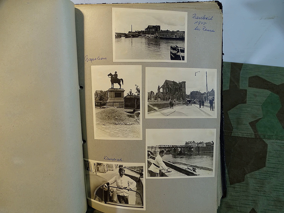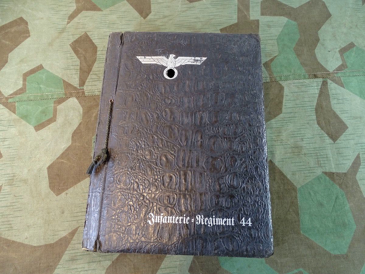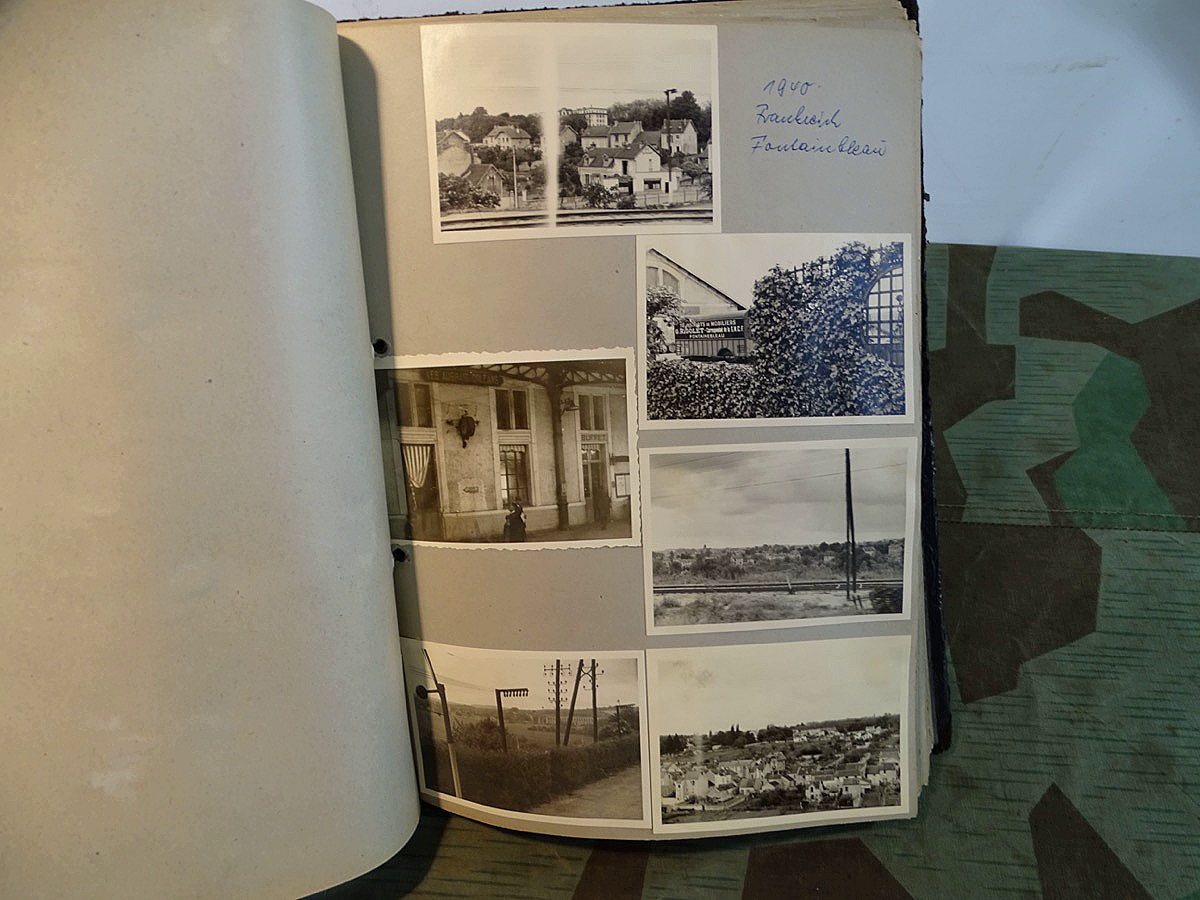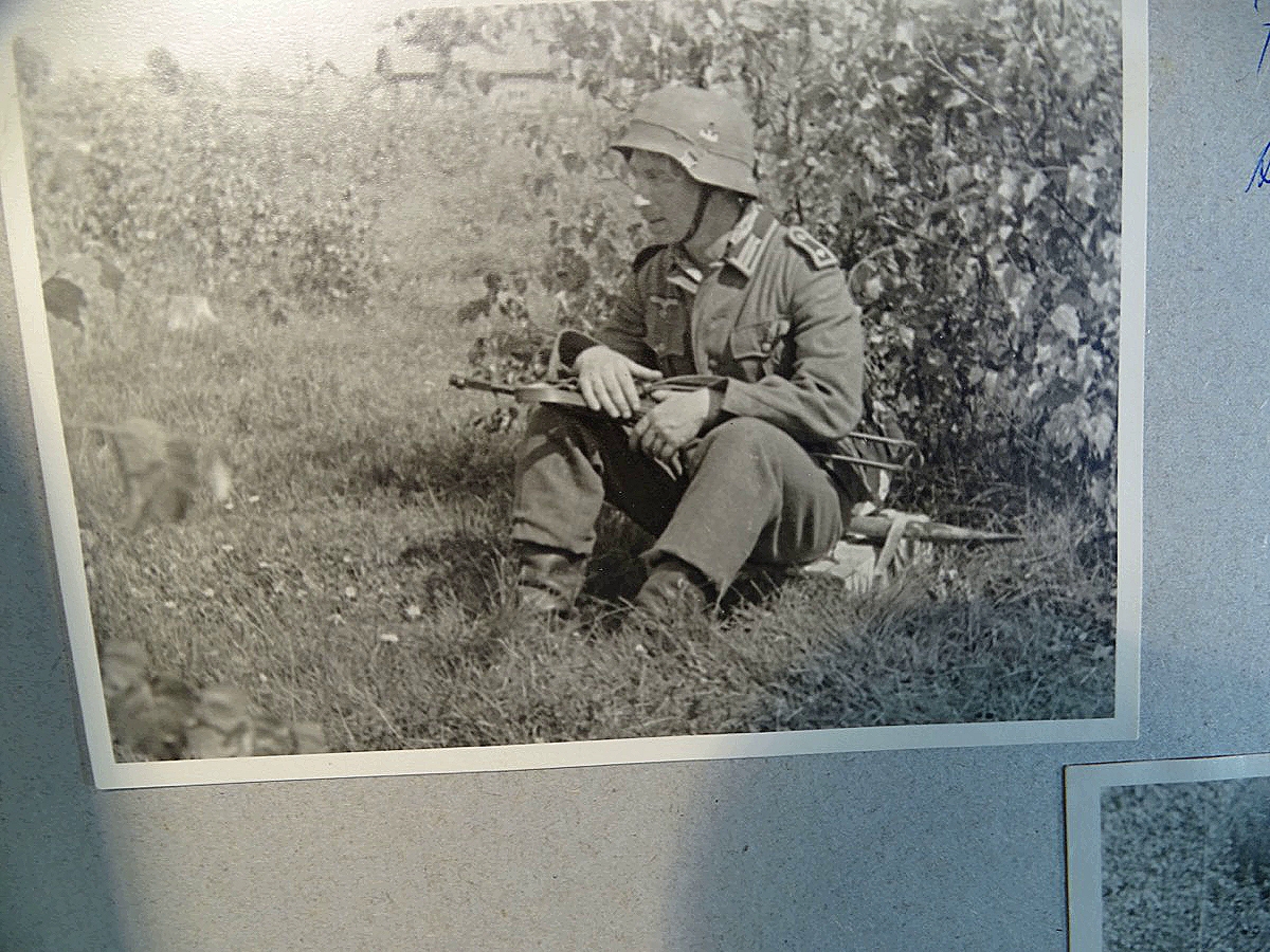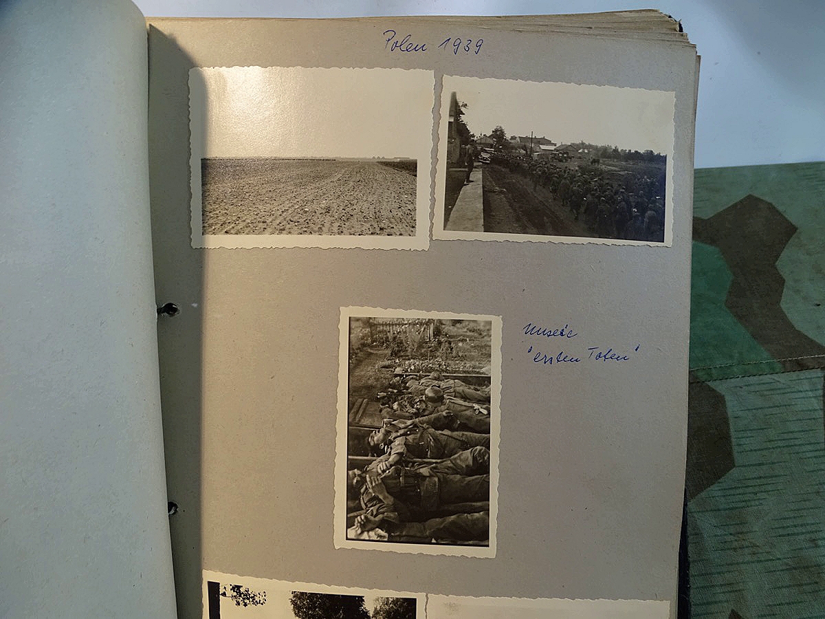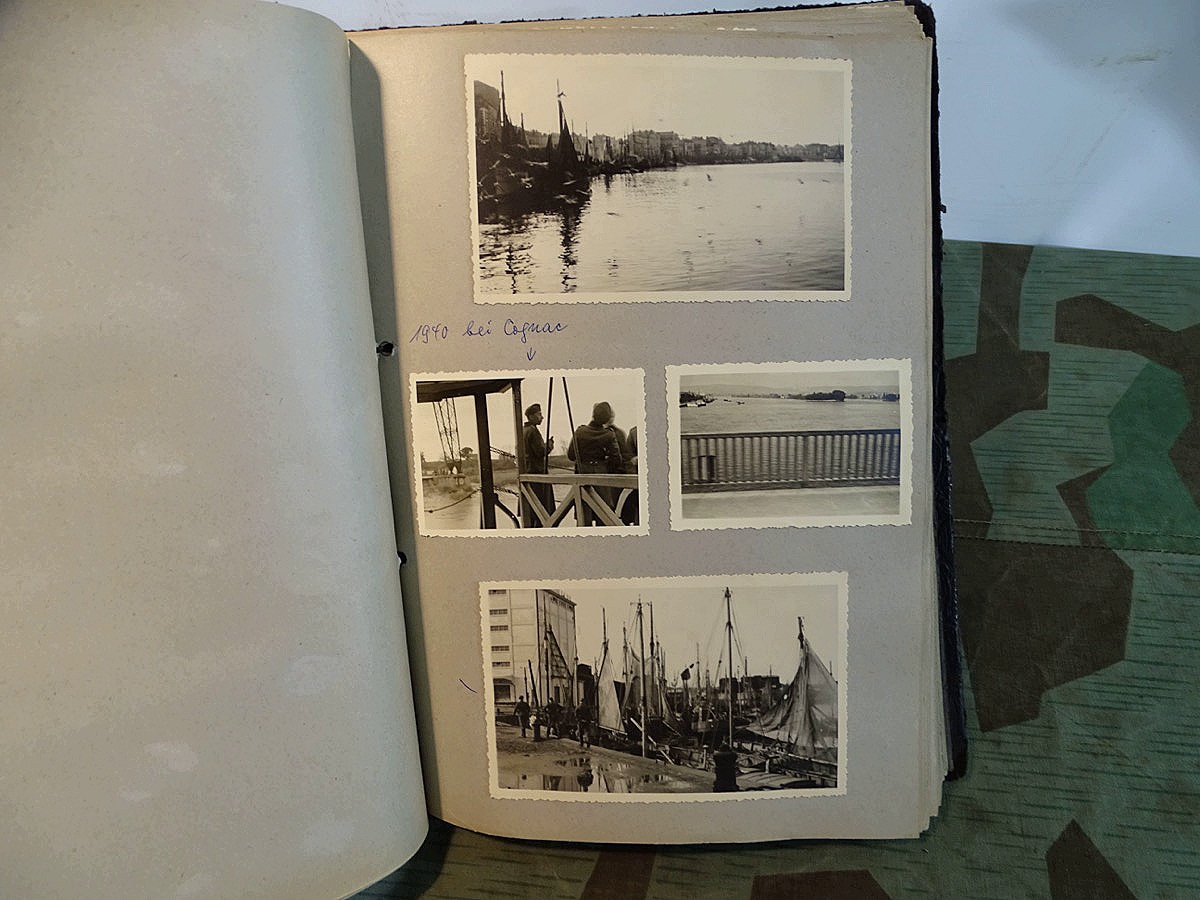 Schöner, offizieller Dienstzeitalbum Original Einband. Silbern teifgeprägter Hoheitsadler und Schrift. Innen wohl mal nach dem Krieg vom ehem. Soldaten neu aufbereitet worden, da mit Kuli beschriftet. Fotos sauber eingeklebt und sauber, lesbar beschriftet. Inhalte und Beschriftungen der Bilder : Gruppenbild mit Schild: 5 Jahrgang 1937/38 15 Ers. Kp Inf Rgt 21 Nürnberg, auf Schulterklappen die 21 lesbar. /Offiziersportrait Kp. Chef mit vielen Orden und Beschriftung: Blutorden/ Polen 1939,IR 21, 17Div. Deutscher Panzer bei Kutno/Zerstörte WH Autos, tote Pferde, flüchtende Bevölkerung, zerstörte Gebäude, Gefangene/ 1939 im Westwall/ Schönes Foto Soldat mit MG 34, Helmabzeichen, Gefreitenwinkel/ 1940 Feuerwerkerschule Berlin Lichterfelde/ Foto " Geheim - Spezial Munition für England??? Geheime Rakete oder Hochgeschwindigkeits Munition ???/ Munitions Anstallt in Feucht/ 3 sehr schöne, seltene Postkarten Fotos : Frauen beim Nähen von Pulversäckchen für Munition und Männer beim Befüllen von Granaten. / 1940 Frankreich, Fontainebleu, La Rochelle/ 4 seltene Fotos Postkartengrösse, Eisenbahngeschütz ( Theodor Bruno E ?) / Bologna / Portrait mit F Feuerwerker Abz. auf Ärmel. / Le Havre / Bourges / Paris/Sprengung von Feind Munition / Beute Waffen / Farbige Gefangene bei Arbeitseinsatz / Russland 1941/42, Smolensk / 2 Fotos schweres Inf. Geschütz 15 cm / Serhr schönes Foto, WH Soldaten in Wende Tarnanzügen , Splinter tarn, Handschuhe, Feldmützen 43, Winter Russland 1943/44/ Viele deutsche Gräber / Russland 1943/44 Fotos " Auf Partisanen Jagd, mit MG 34 und MP 40 , Helm mit Mückenschleier/ Foto einer kleinen Pak, deutsche 3,7 oder russ. 5 cm Beute.