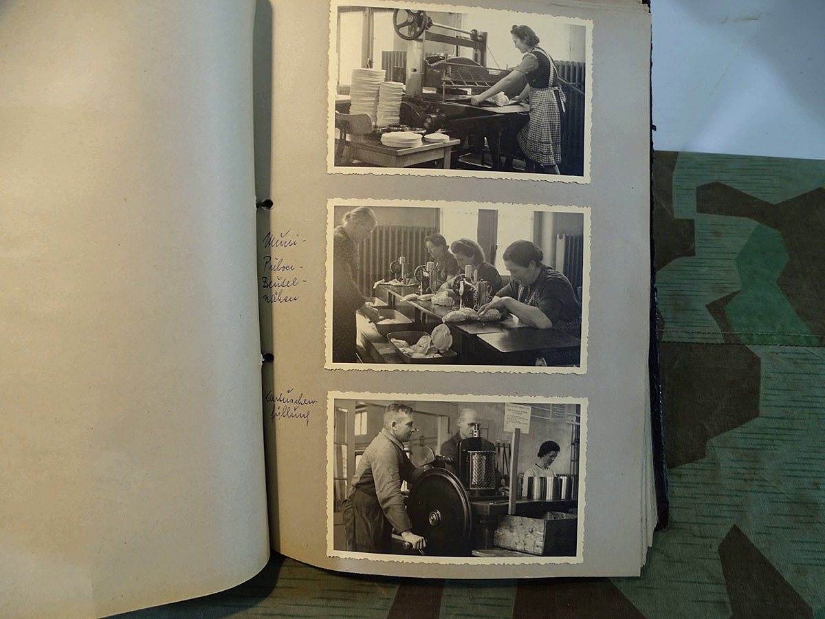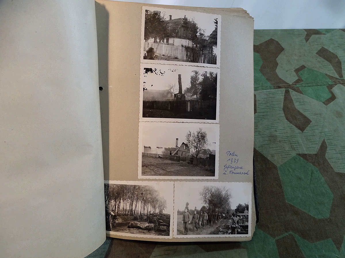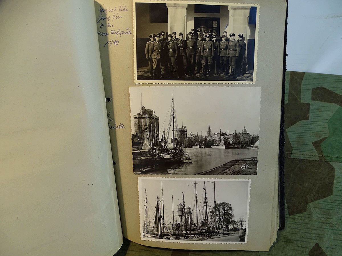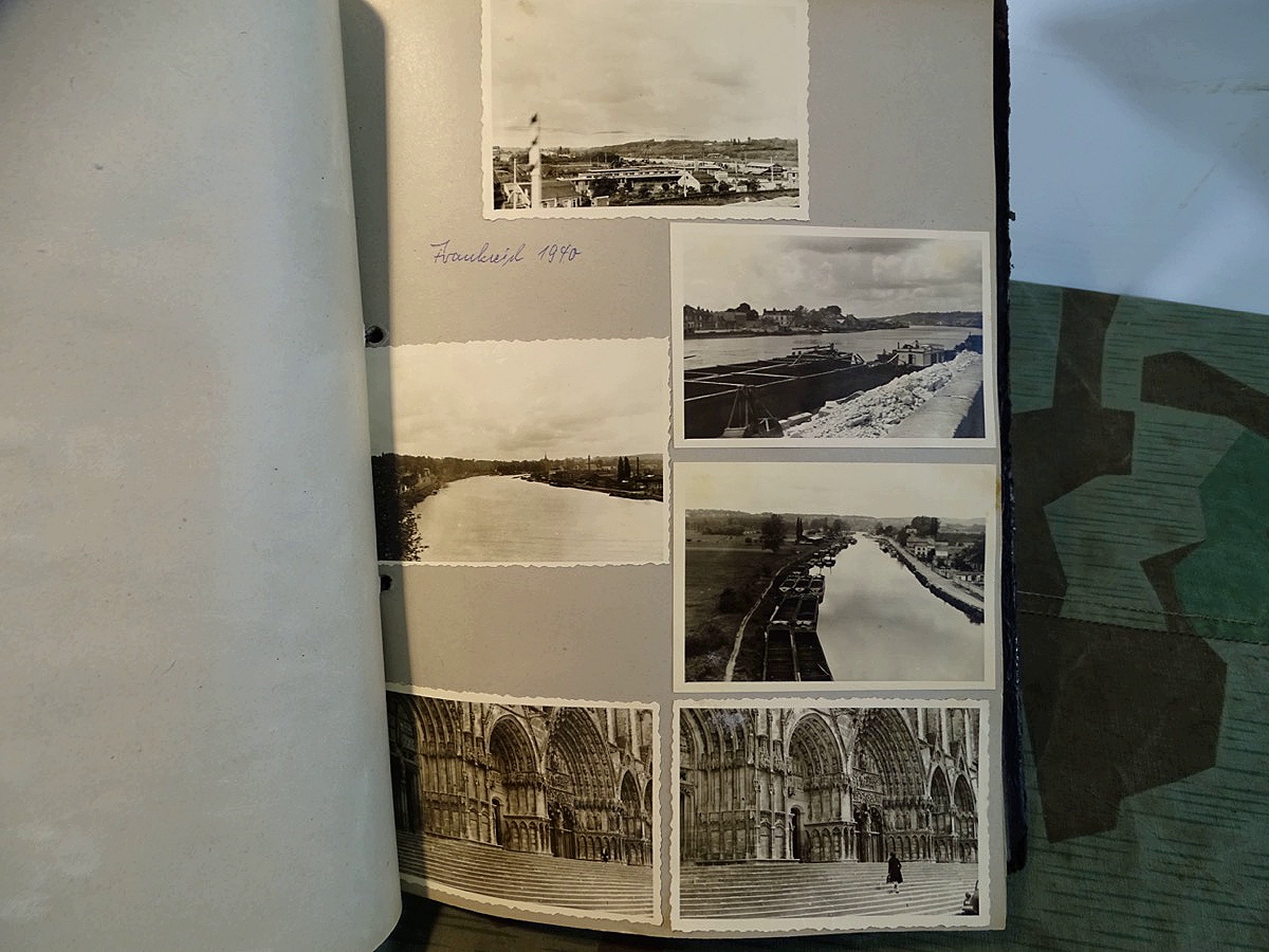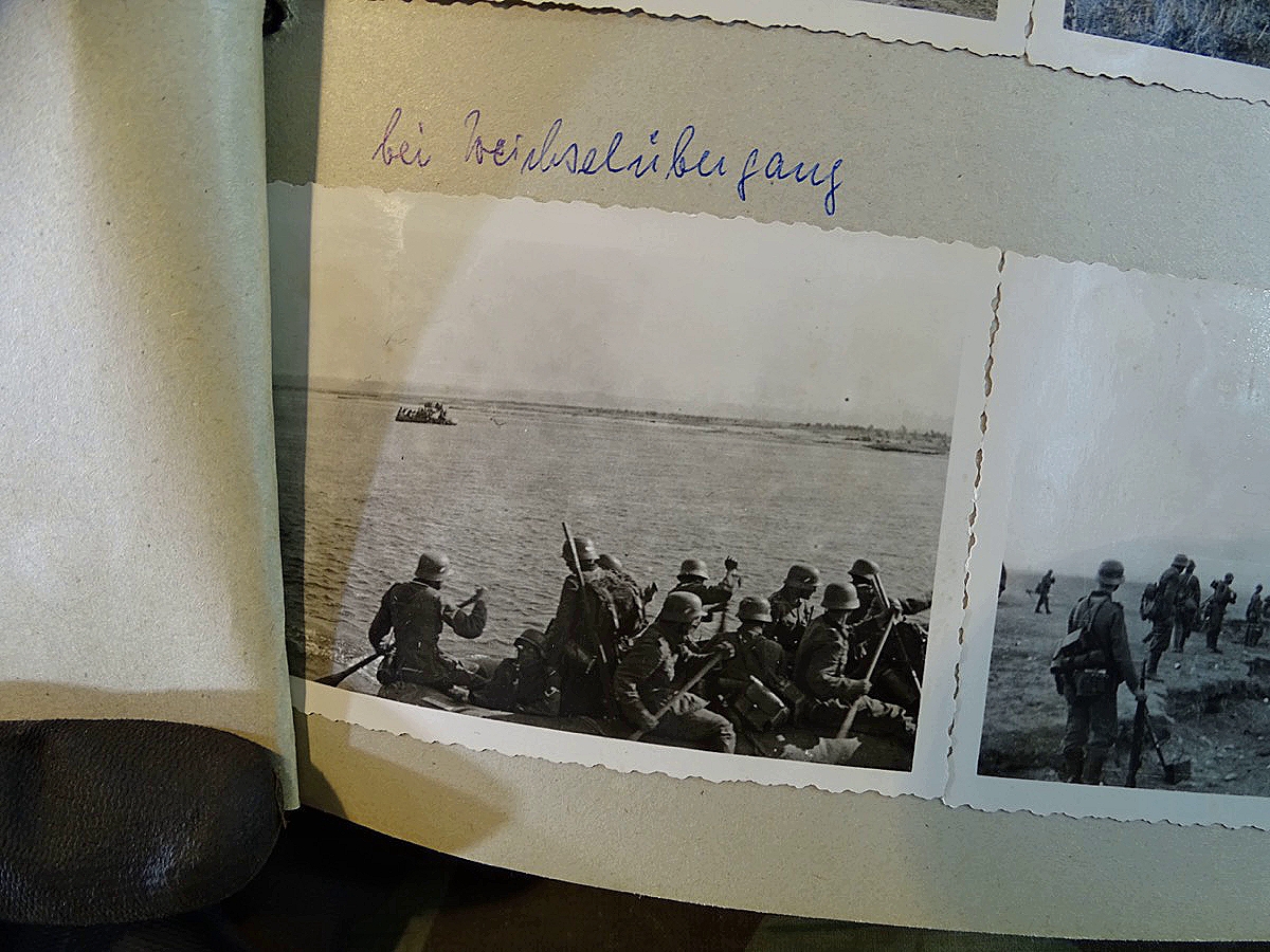 Schöner, offizieller Dienstzeitalbum Original Einband. Silbern teifgeprägter Hoheitsadler und Schrift. Innen wohl mal nach dem Krieg vom ehem. Soldaten neu aufbereitet worden, da mit Kuli beschriftet. Fotos sauber eingeklebt und sauber, lesbar beschriftet. Inhalte und Beschriftungen der Bilder : Gruppenbild mit Schild: 5 Jahrgang 1937/38 15 Ers. Kp Inf Rgt 21 Nürnberg, auf Schulterklappen die 21 lesbar. /Offiziersportrait Kp. Chef mit vielen Orden und Beschriftung: Blutorden/ Polen 1939,IR 21, 17Div. Deutscher Panzer bei Kutno/Zerstörte WH Autos, tote Pferde, flüchtende Bevölkerung, zerstörte Gebäude, Gefangene/ 1939 im Westwall/ Schönes Foto Soldat mit MG 34, Helmabzeichen, Gefreitenwinkel/ 1940 Feuerwerkerschule Berlin Lichterfelde/ Foto " Geheim - Spezial Munition für England??? Geheime Rakete oder Hochgeschwindigkeits Munition ???/ Munitions Anstallt in Feucht/ 3 sehr schöne, seltene Postkarten Fotos : Frauen beim Nähen von Pulversäckchen für Munition und Männer beim Befüllen von Granaten. / 1940 Frankreich, Fontainebleu, La Rochelle/ 4 seltene Fotos Postkartengrösse, Eisenbahngeschütz ( Theodor Bruno E ?) / Bologna / Portrait mit F Feuerwerker Abz. auf Ärmel. / Le Havre / Bourges / Paris/Sprengung von Feind Munition / Beute Waffen / Farbige Gefangene bei Arbeitseinsatz / Russland 1941/42, Smolensk / 2 Fotos schweres Inf. Geschütz 15 cm / Serhr schönes Foto, WH Soldaten in Wende Tarnanzügen , Splinter tarn, Handschuhe, Feldmützen 43, Winter Russland 1943/44/ Viele deutsche Gräber / Russland 1943/44 Fotos " Auf Partisanen Jagd, mit MG 34 und MP 40 , Helm mit Mückenschleier/ Foto einer kleinen Pak, deutsche 3,7 oder russ. 5 cm Beute.