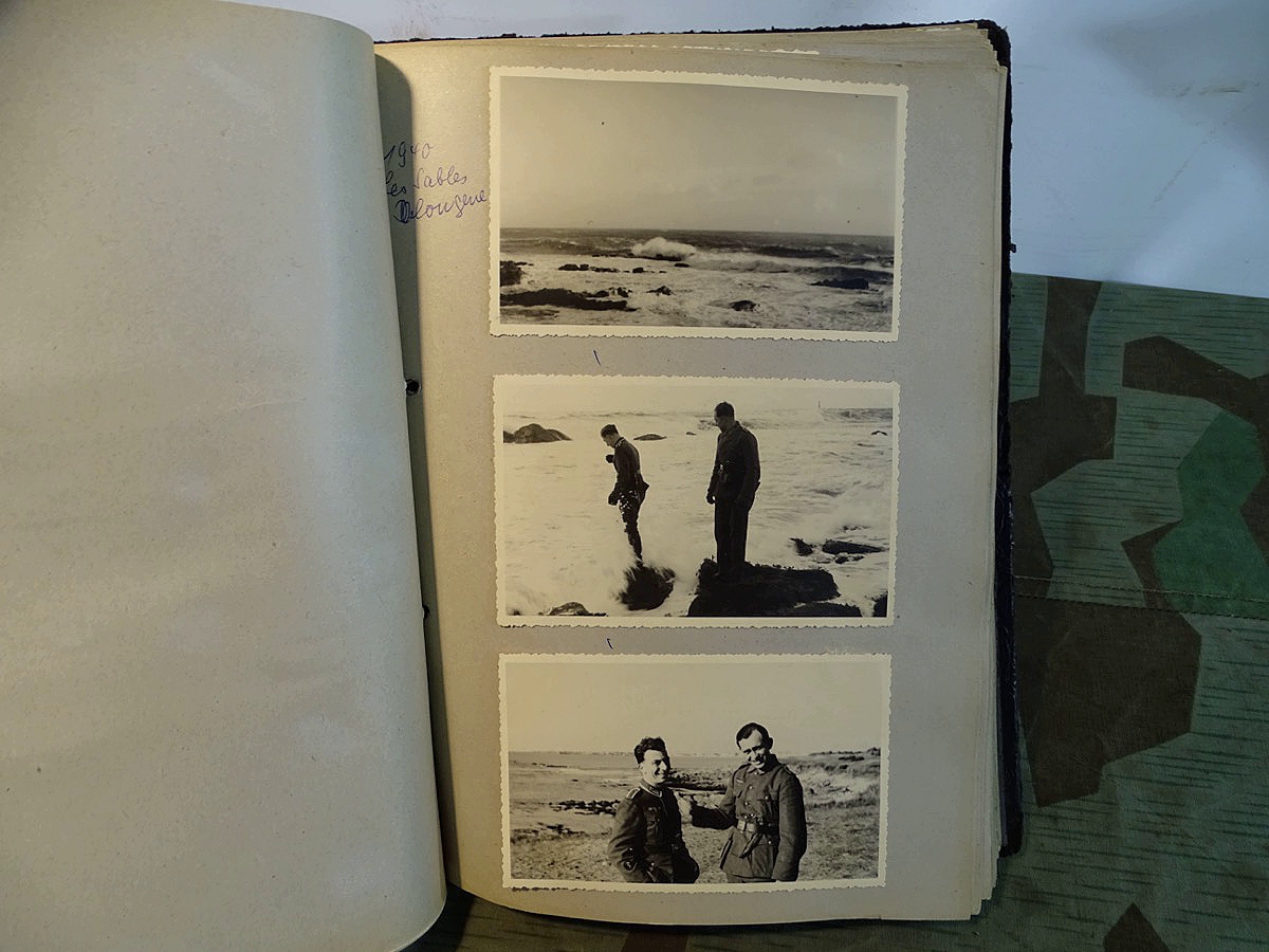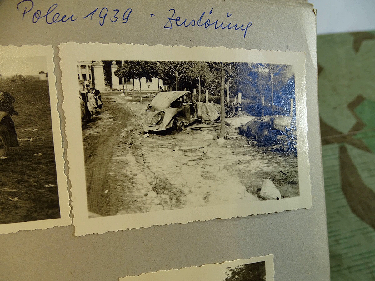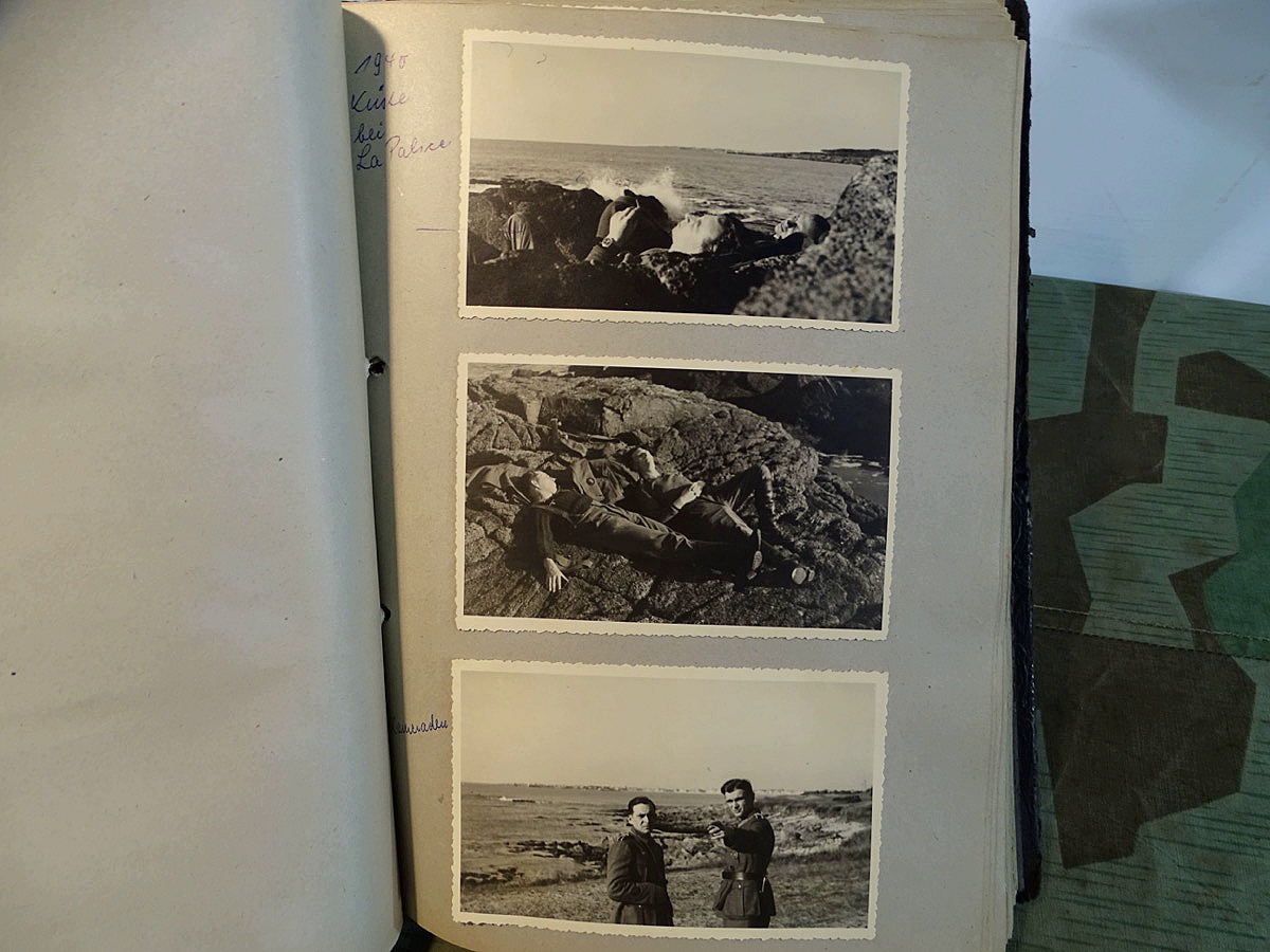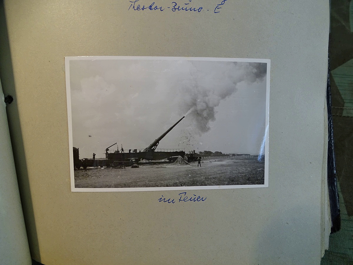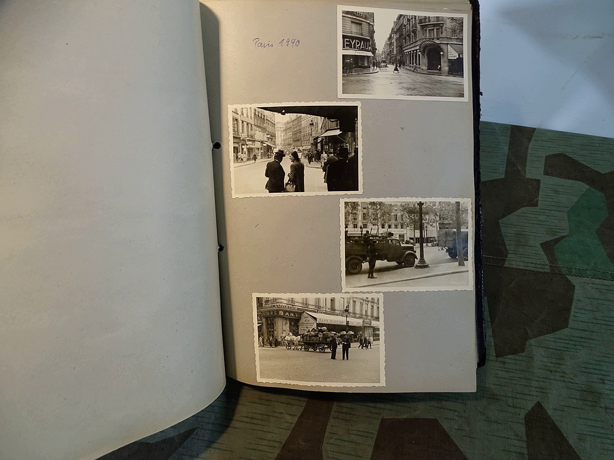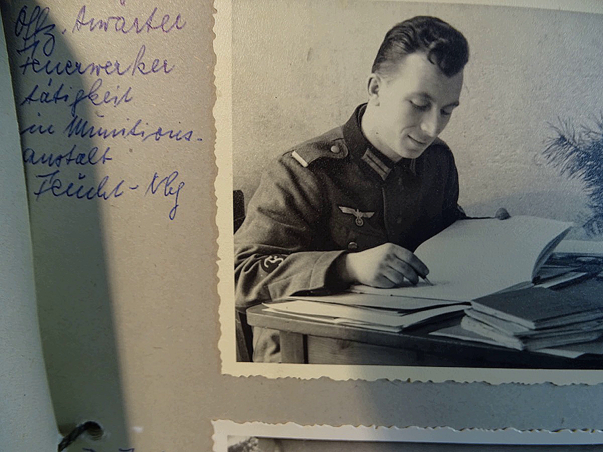 Schöner, offizieller Dienstzeitalbum Original Einband. Silbern teifgeprägter Hoheitsadler und Schrift. Innen wohl mal nach dem Krieg vom ehem. Soldaten neu aufbereitet worden, da mit Kuli beschriftet. Fotos sauber eingeklebt und sauber, lesbar beschriftet. Inhalte und Beschriftungen der Bilder : Gruppenbild mit Schild: 5 Jahrgang 1937/38 15 Ers. Kp Inf Rgt 21 Nürnberg, auf Schulterklappen die 21 lesbar. /Offiziersportrait Kp. Chef mit vielen Orden und Beschriftung: Blutorden/ Polen 1939,IR 21, 17Div. Deutscher Panzer bei Kutno/Zerstörte WH Autos, tote Pferde, flüchtende Bevölkerung, zerstörte Gebäude, Gefangene/ 1939 im Westwall/ Schönes Foto Soldat mit MG 34, Helmabzeichen, Gefreitenwinkel/ 1940 Feuerwerkerschule Berlin Lichterfelde/ Foto " Geheim - Spezial Munition für England??? Geheime Rakete oder Hochgeschwindigkeits Munition ???/ Munitions Anstallt in Feucht/ 3 sehr schöne, seltene Postkarten Fotos : Frauen beim Nähen von Pulversäckchen für Munition und Männer beim Befüllen von Granaten. / 1940 Frankreich, Fontainebleu, La Rochelle/ 4 seltene Fotos Postkartengrösse, Eisenbahngeschütz ( Theodor Bruno E ?) / Bologna / Portrait mit F Feuerwerker Abz. auf Ärmel. / Le Havre / Bourges / Paris/Sprengung von Feind Munition / Beute Waffen / Farbige Gefangene bei Arbeitseinsatz / Russland 1941/42, Smolensk / 2 Fotos schweres Inf. Geschütz 15 cm / Serhr schönes Foto, WH Soldaten in Wende Tarnanzügen , Splinter tarn, Handschuhe, Feldmützen 43, Winter Russland 1943/44/ Viele deutsche Gräber / Russland 1943/44 Fotos " Auf Partisanen Jagd, mit MG 34 und MP 40 , Helm mit Mückenschleier/ Foto einer kleinen Pak, deutsche 3,7 oder russ. 5 cm Beute.