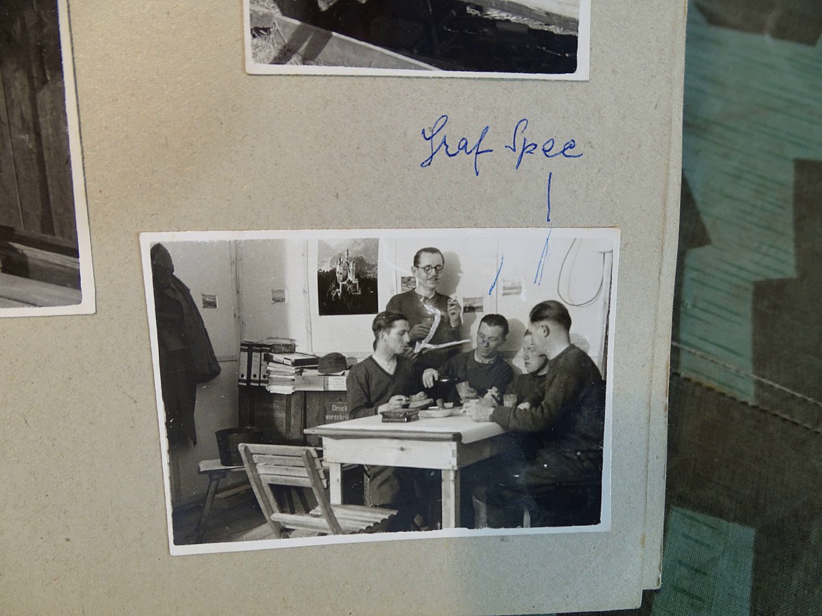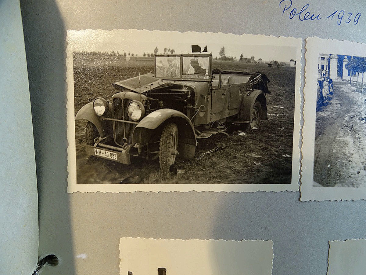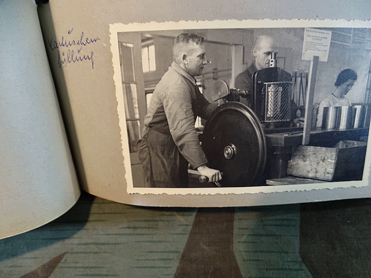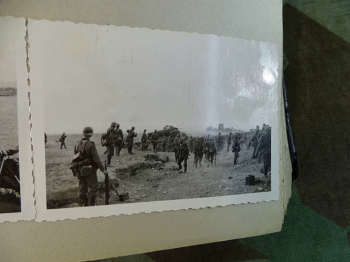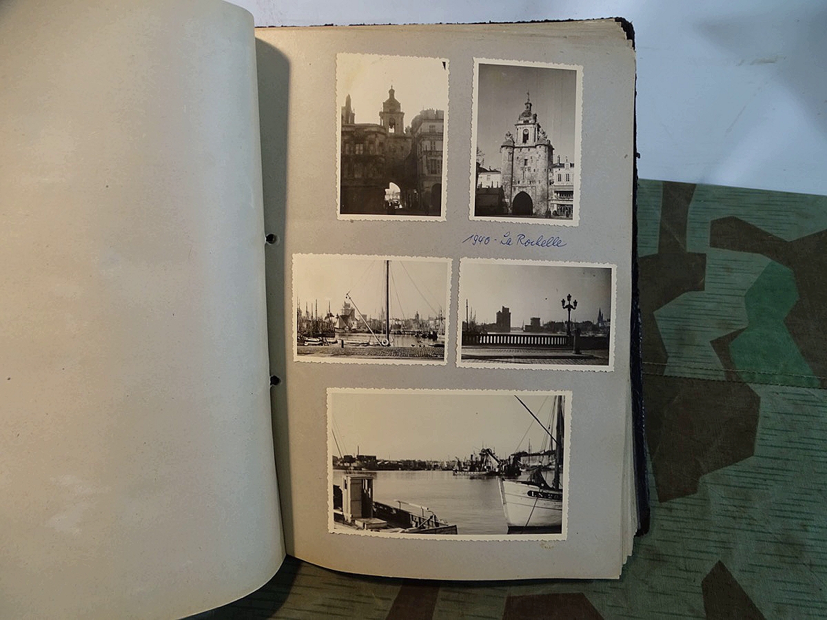 Schöner, offizieller Dienstzeitalbum Original Einband. Silbern teifgeprägter Hoheitsadler und Schrift. Innen wohl mal nach dem Krieg vom ehem. Soldaten neu aufbereitet worden, da mit Kuli beschriftet. Fotos sauber eingeklebt und sauber, lesbar beschriftet. Inhalte und Beschriftungen der Bilder : Gruppenbild mit Schild: 5 Jahrgang 1937/38 15 Ers. Kp Inf Rgt 21 Nürnberg, auf Schulterklappen die 21 lesbar. /Offiziersportrait Kp. Chef mit vielen Orden und Beschriftung: Blutorden/ Polen 1939,IR 21, 17Div. Deutscher Panzer bei Kutno/Zerstörte WH Autos, tote Pferde, flüchtende Bevölkerung, zerstörte Gebäude, Gefangene/ 1939 im Westwall/ Schönes Foto Soldat mit MG 34, Helmabzeichen, Gefreitenwinkel/ 1940 Feuerwerkerschule Berlin Lichterfelde/ Foto " Geheim - Spezial Munition für England??? Geheime Rakete oder Hochgeschwindigkeits Munition ???/ Munitions Anstallt in Feucht/ 3 sehr schöne, seltene Postkarten Fotos : Frauen beim Nähen von Pulversäckchen für Munition und Männer beim Befüllen von Granaten. / 1940 Frankreich, Fontainebleu, La Rochelle/ 4 seltene Fotos Postkartengrösse, Eisenbahngeschütz ( Theodor Bruno E ?) / Bologna / Portrait mit F Feuerwerker Abz. auf Ärmel. / Le Havre / Bourges / Paris/Sprengung von Feind Munition / Beute Waffen / Farbige Gefangene bei Arbeitseinsatz / Russland 1941/42, Smolensk / 2 Fotos schweres Inf. Geschütz 15 cm / Serhr schönes Foto, WH Soldaten in Wende Tarnanzügen , Splinter tarn, Handschuhe, Feldmützen 43, Winter Russland 1943/44/ Viele deutsche Gräber / Russland 1943/44 Fotos " Auf Partisanen Jagd, mit MG 34 und MP 40 , Helm mit Mückenschleier/ Foto einer kleinen Pak, deutsche 3,7 oder russ. 5 cm Beute.