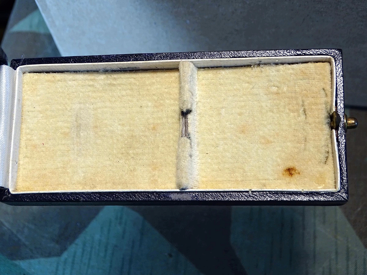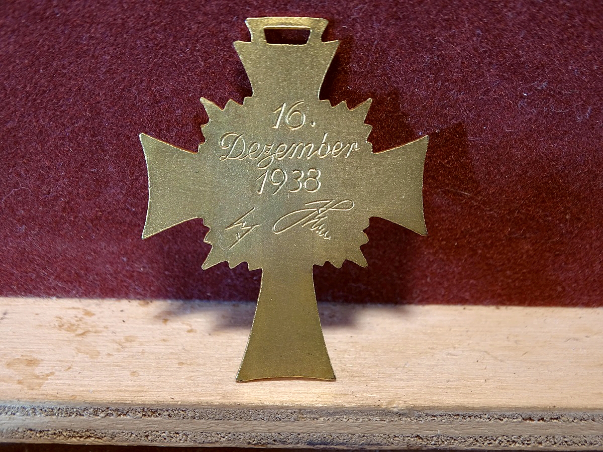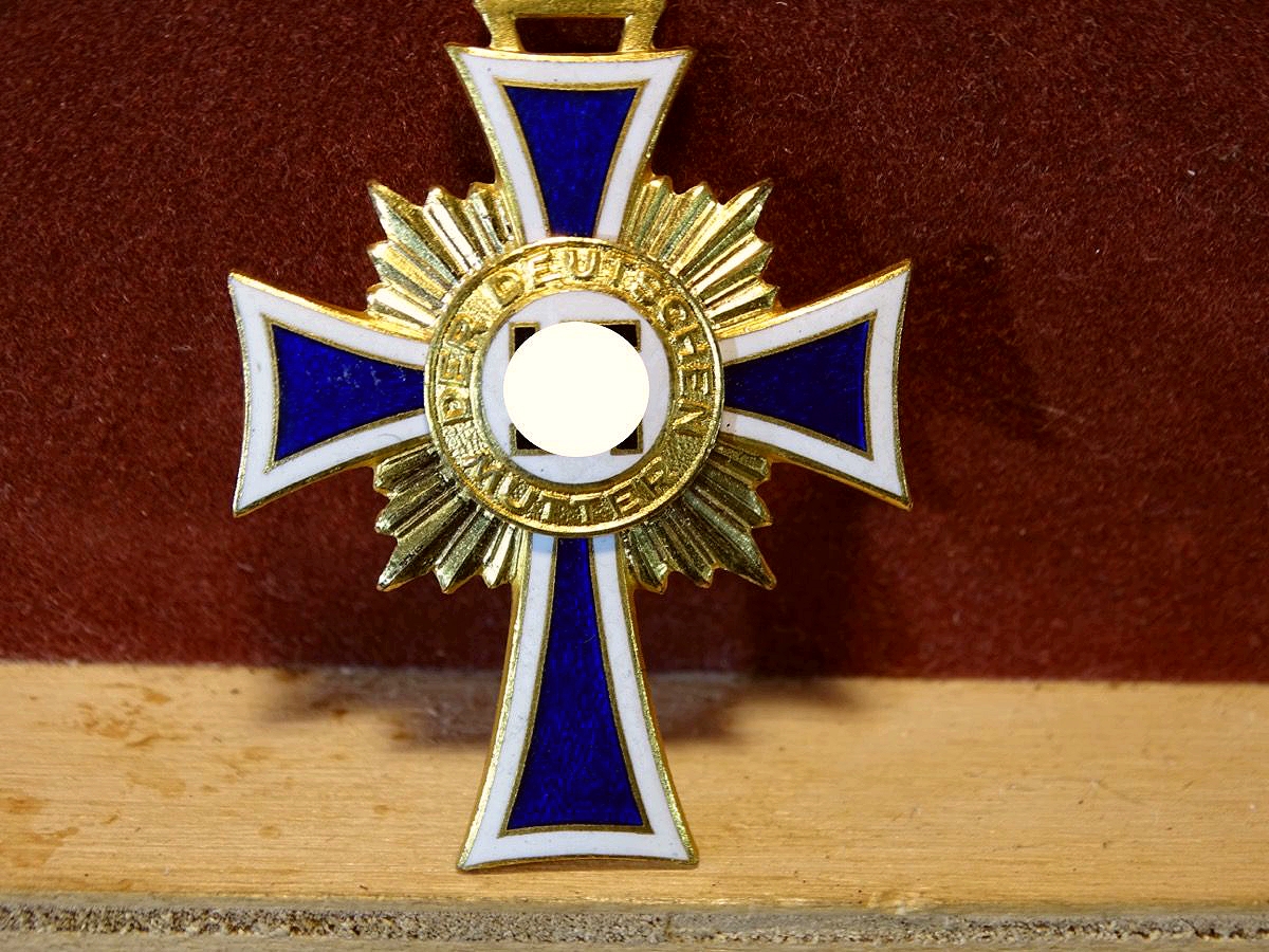 Ehrenkreuz der Deutschen Mutter in Gold mit langem Band, komplett im Verleihungsetui. Hersteller Stemplung in weißem Kunstseidenfutter des Kistendeckels: "A. Rettenmeier, Schwäb.Gmünd" Goldener Aufdruch eines Mutterkreuzes auf Schatullendeckel erhalten aber nutzungsbedingt berieben. Emaille und Vergoldung intakt.