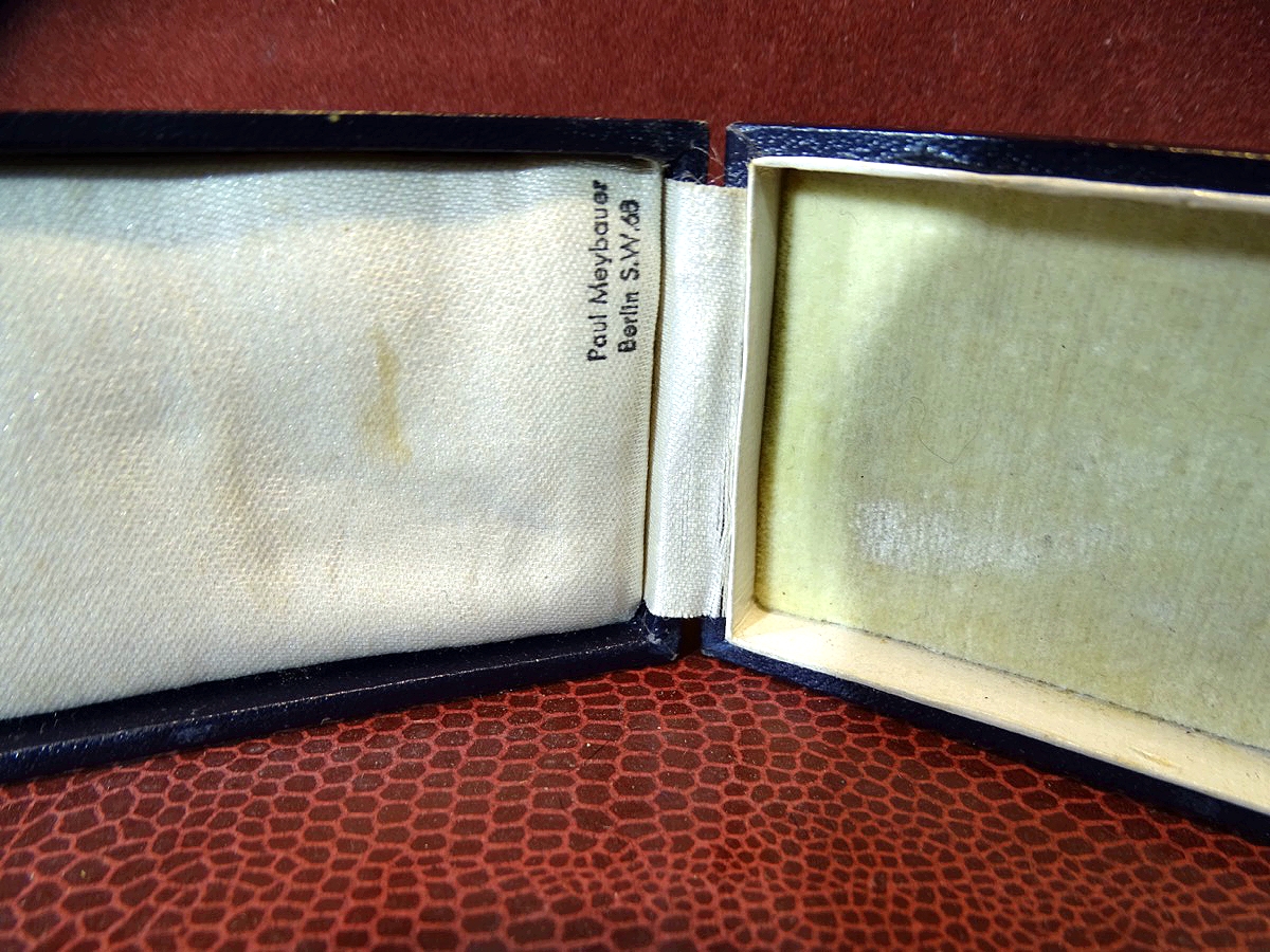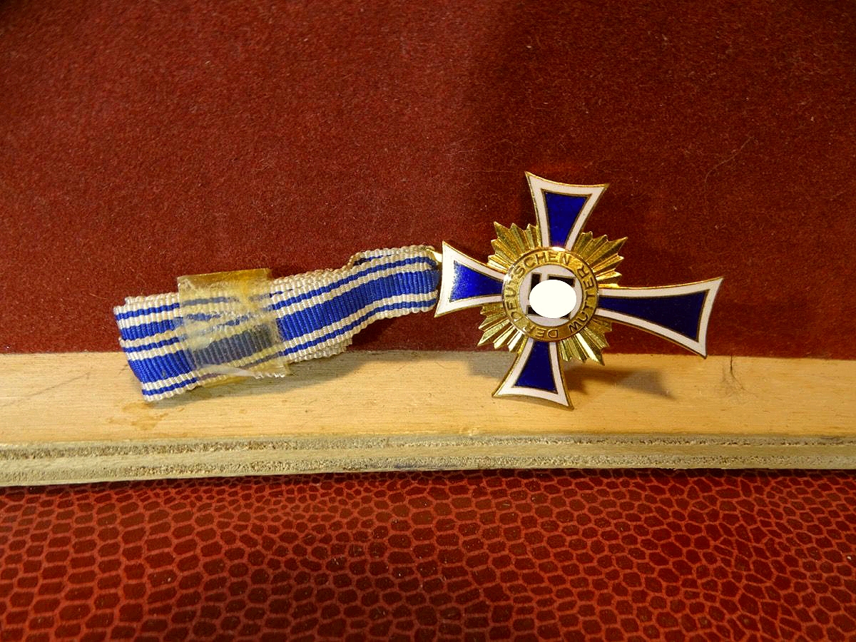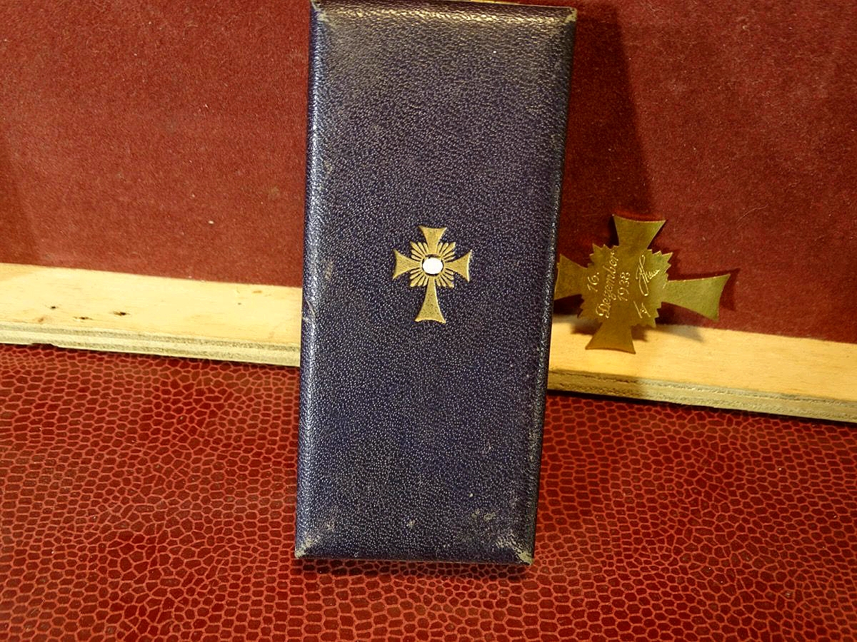 Ehrenkreuz der Deutschen Mutter in Gold am Band, komplett im Verleihungsetui. Hersteller Stemplung in weißem Kunstseidenfutter des Kistendeckels: "Paul Meybauer Berlin" Goldener Aufdruch eines Mutterkreuzes auf Schatullendeckel schön erhalten. Etui sehr gute Erhaltung. Band volle Länge. Emaille und Vergoldung intakt.