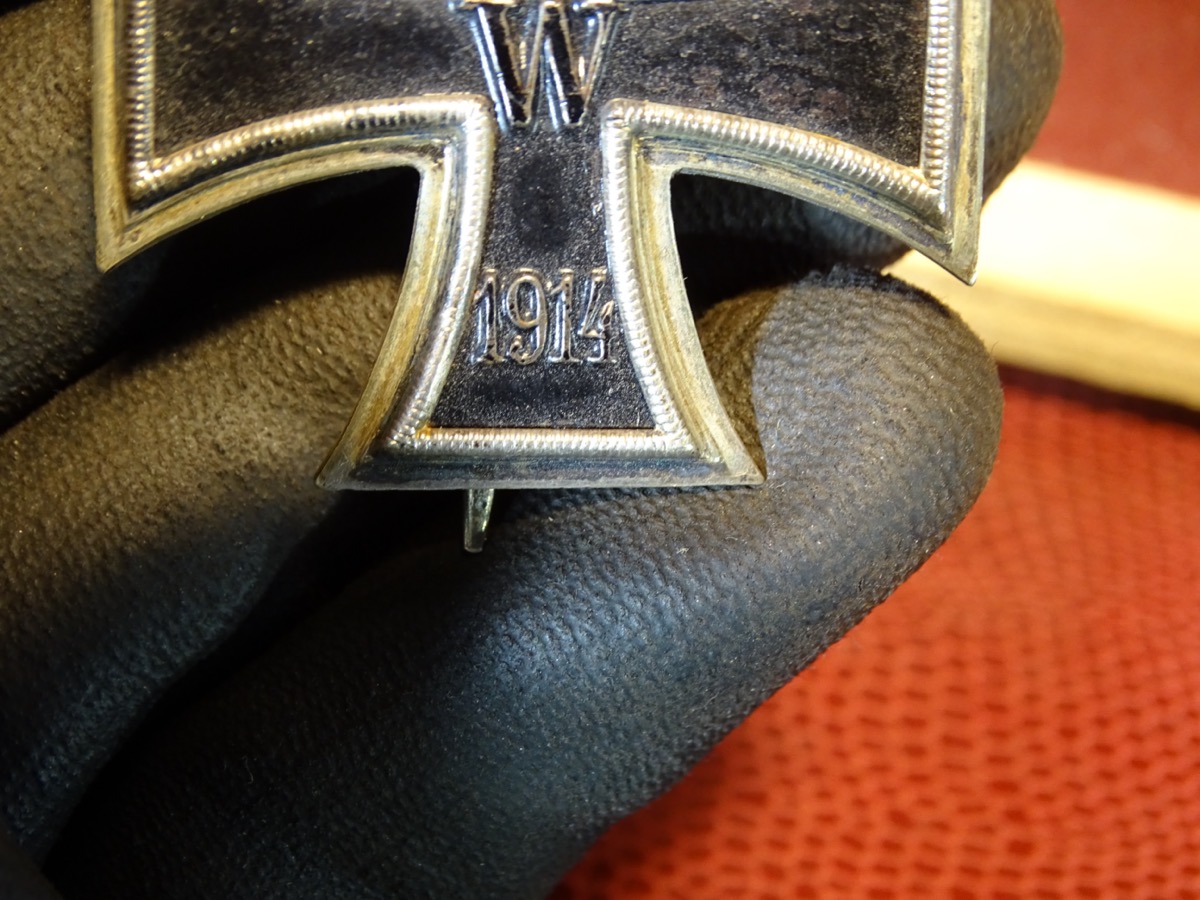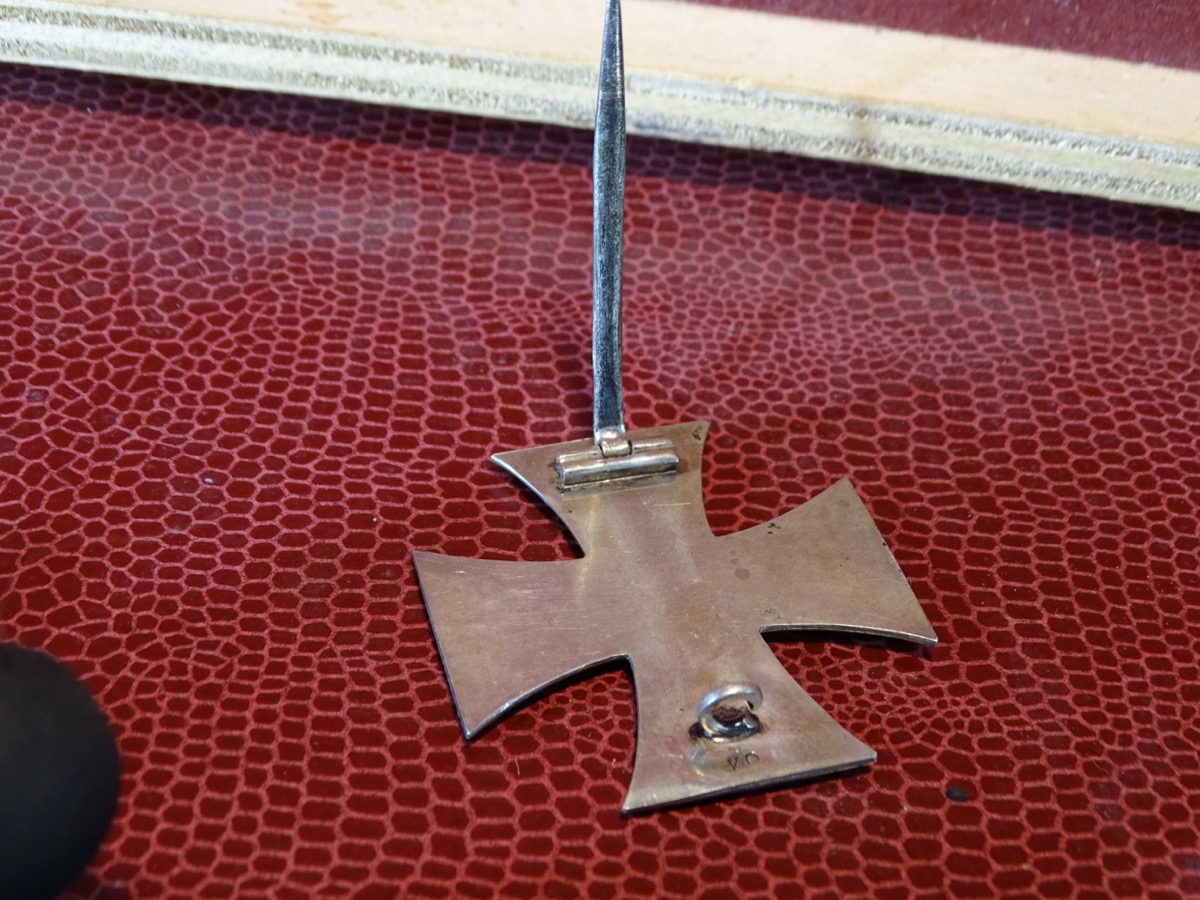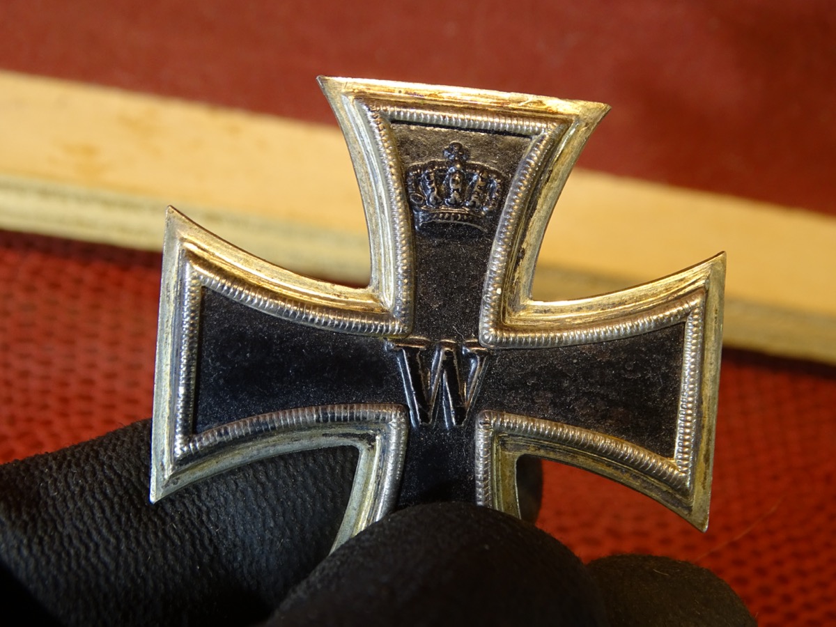 Schöner klarer Herstellerstempel auf Rückseite. "KO" für Königliches Münzamt Orden, Berlin oder Fa. Klein Oberstein. Leicht getragen, Kernfarbe noch fast komplett erhalten, nur auf den erhabenen Stellen etwas berieben. Gleichmässige Patina. Magnetischer Eisenkern. Zustand siehe Fotos.