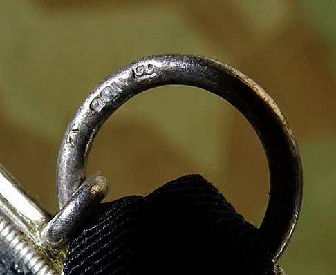 Am Kämpferband. Ring mit 800er Silberstempel und Herstellermarke CD für Carl Dillenius. Links daneben noch eine Marke, sieht wie ein K oder V aus, mit dieser Zusatzmarke nicht in unserer Literatur erfasst. Interessante Stempel Variante. Schwarze Kernfarbe mit Abrieb aber noch zum größten Teil erhalten, silberner Rand gut erhalten. Zustand siehe Fotos