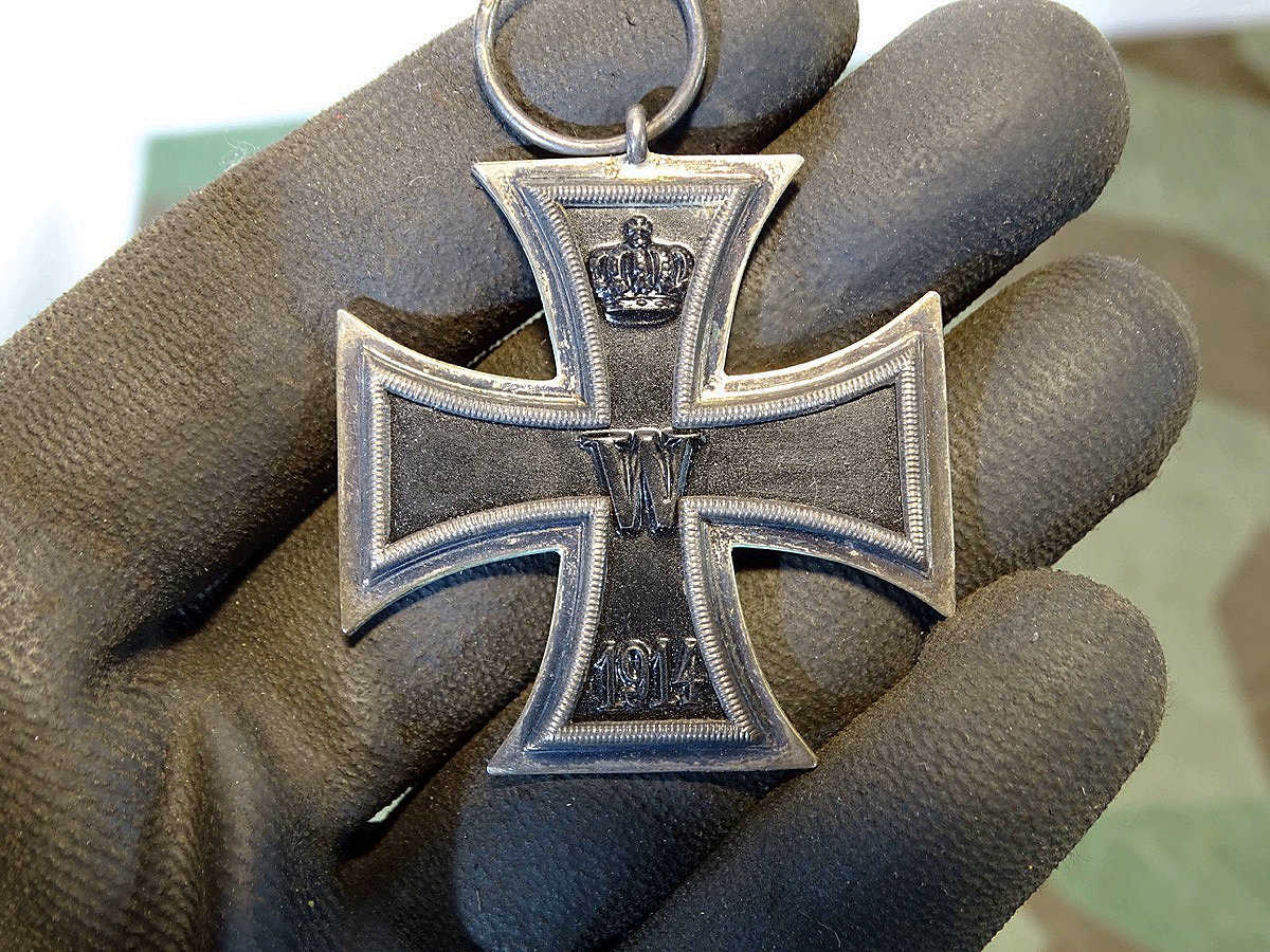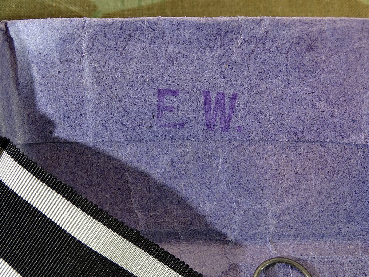 Sehr schönes, sehr gut erhaltenes komplettes, zusammengehöriges Set. Zustand siehe Fotos. Angekauft direkt aus privatem Familiennachlass. Eisernes Kreuz 2 Klasse 1914 in sehr gutem Zustand. Kernschwärzung noch komplett erhalten. Rand gleichmässig patiniert. Im Ring mit Herstellermarke EW .Gleicher Herstellerkürzel-Aufdruck EW auch auf dem blauen Verpackungs- / Auslieferungs Papier. Papier, EK und langes Band in sehr schönem Zustand.So selten zu finden. Laut Fachbuch v. Frank Wernitz ist es mutmaßlich dem Hersteller Emil Wiechmann zu zu ordnen