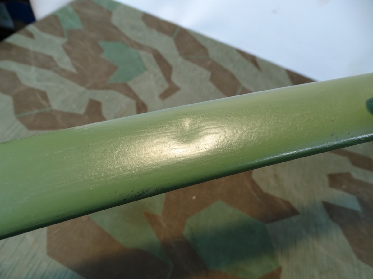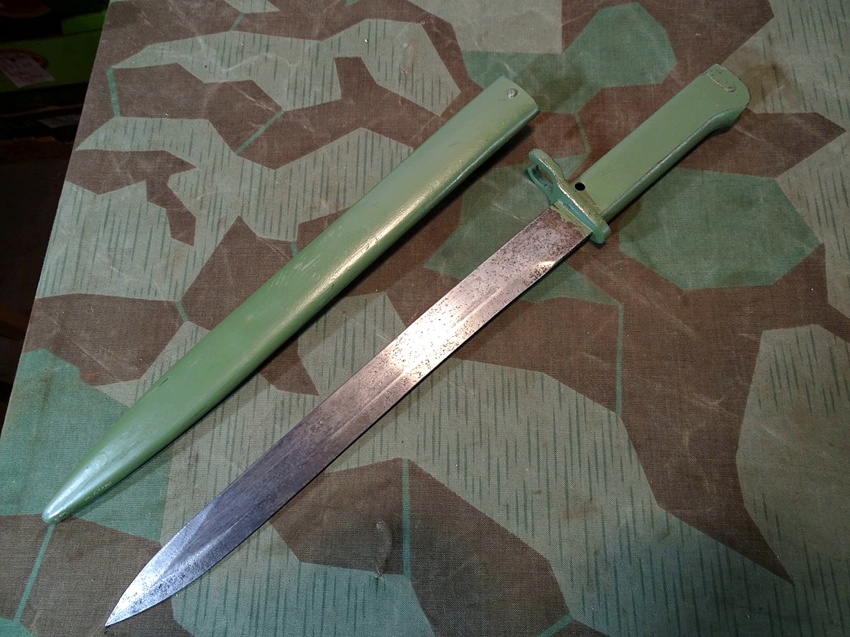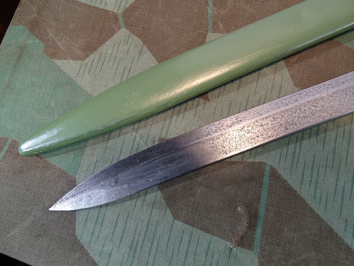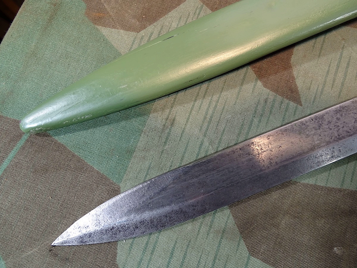 Klinge mit Hohlkehle, Waffenamt Kontrollpunze mit Krone darüber auf dem Klingenrücken. Die Farbe auf Griff und Scheide ist noch fast kpl. erhalten, unserer meinung aber mal nachgestrichen worden. Wohl mal neu im laufe der Nutzungszeit neu lackiert worden. Der Farbton ist grob stimmig zum 1. Weltkrieg nur etwas zu hell und zu gut erhalten um aus der Nutzungszeit zu sein. Zustand siehe Fotos. Bei Bestellung bitte Altersnachweis senden oder mailen ( Kopie vom Personalausweis).