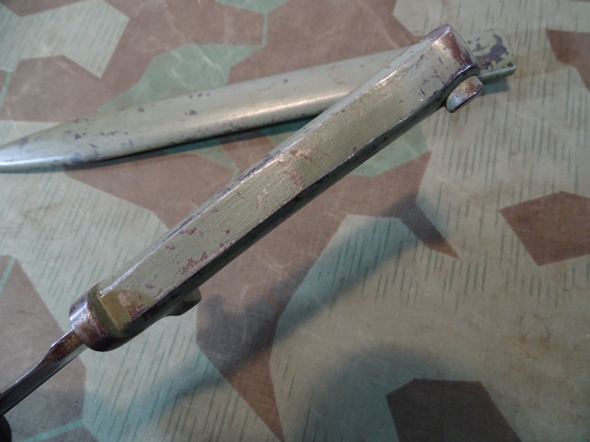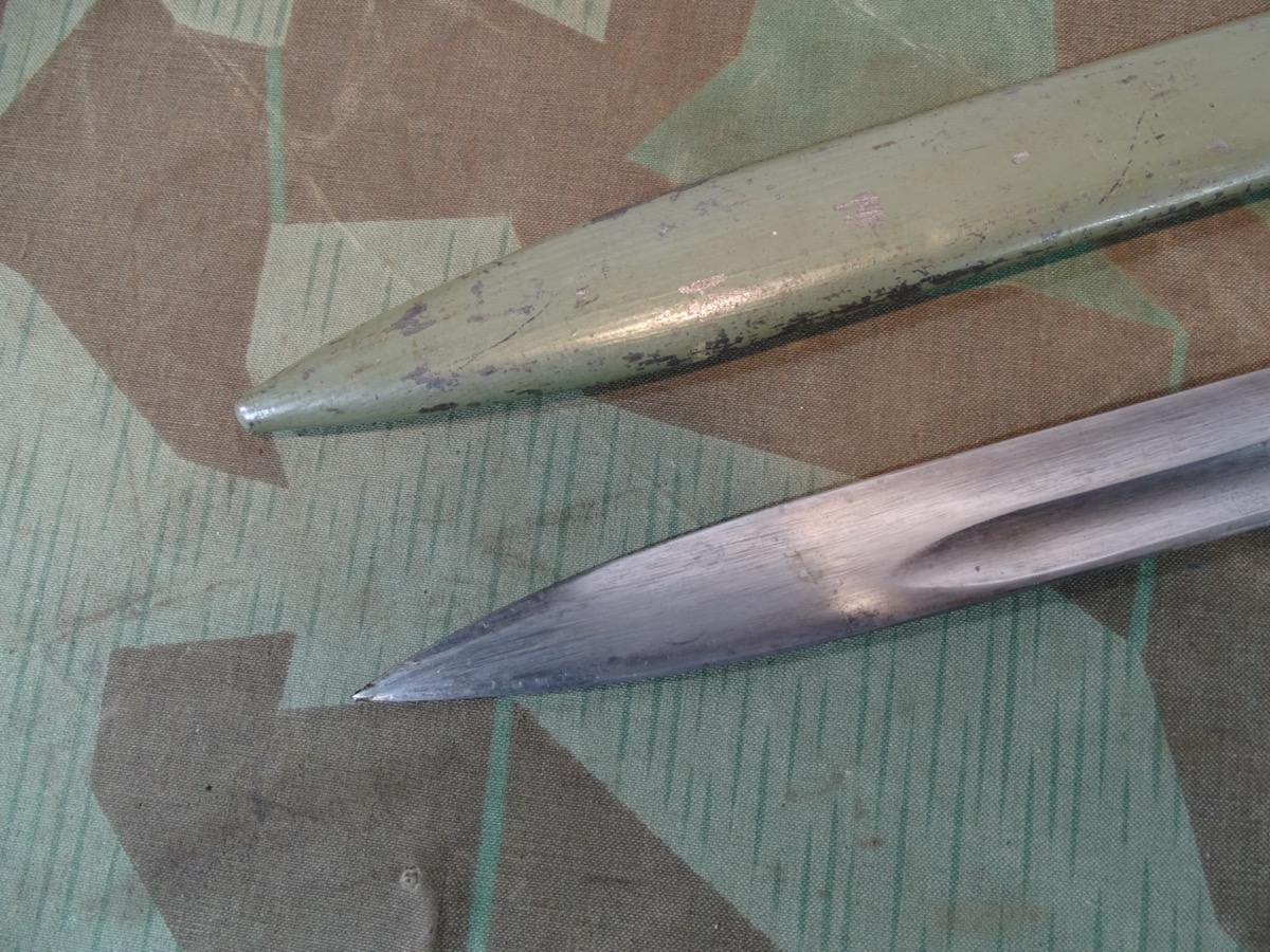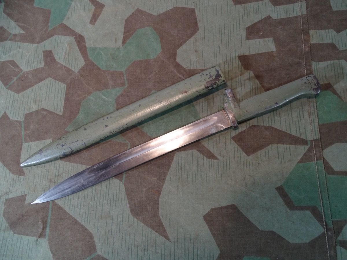 Passend für Gewehr 88 als auch für Gewehr 98 und einige K 98 Modelle. Entstanden im Verlauf des ersten Weltkriegs als Fertigungsvereinfachung auf Grund des gestiegenen Bedarfs und der Materialknappheit. Damals gefertigt in zahllosen Varianten. Selten zu bekommendes, getragenes Stück, in guter Erhaltung. Scheide und Griff noch mit viel zeitgenössichem Originallack. Saubere Klinge mit Hohlkehle, Waffenamt Kontrollpunze auf dem Klingenrücken. Bei Bestellung bitte Altersnachweis senden oder mailen ( Kopie vom Personalausweis).