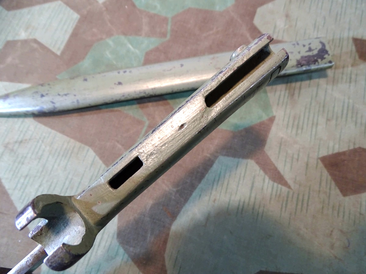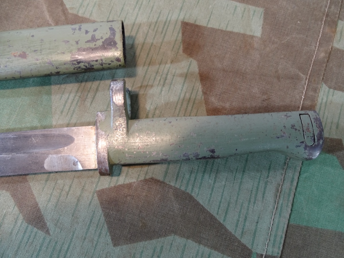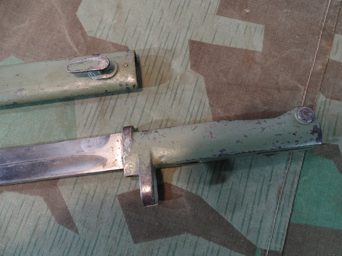 Passend für Gewehr 88 als auch für Gewehr 98 und einige K 98 Modelle. Entstanden im Verlauf des ersten Weltkriegs als Fertigungsvereinfachung auf Grund des gestiegenen Bedarfs und der Materialknappheit. Damals gefertigt in zahllosen Varianten. Selten zu bekommendes, getragenes Stück, in guter Erhaltung. Scheide und Griff noch mit viel zeitgenössichem Originallack. Saubere Klinge mit Hohlkehle, Waffenamt Kontrollpunze auf dem Klingenrücken. Bei Bestellung bitte Altersnachweis senden oder mailen ( Kopie vom Personalausweis).
