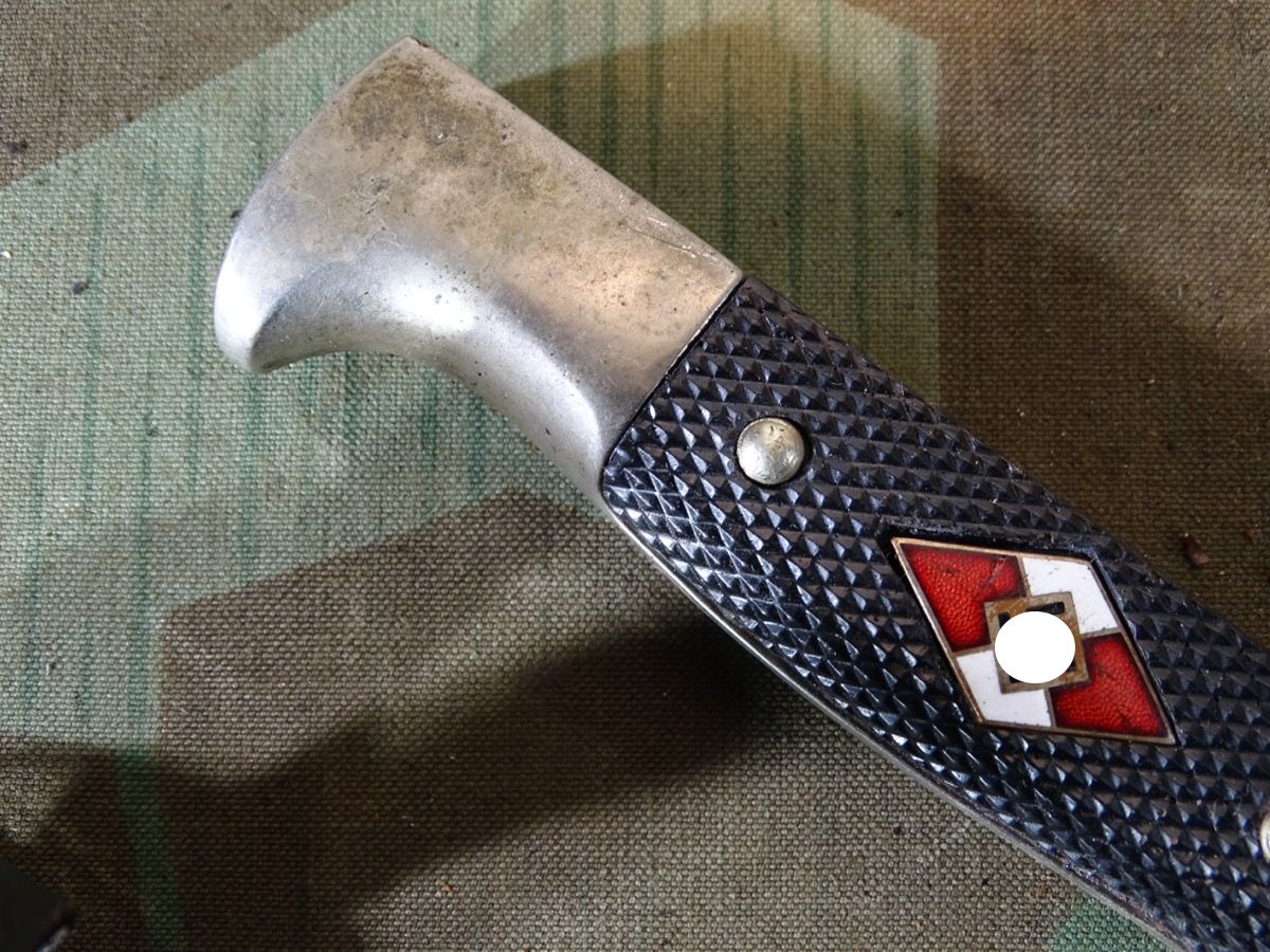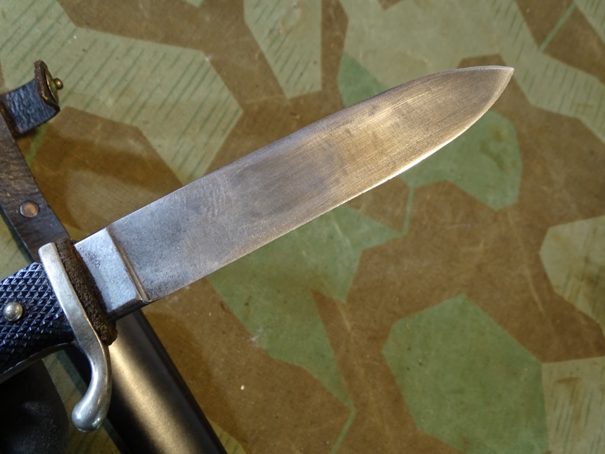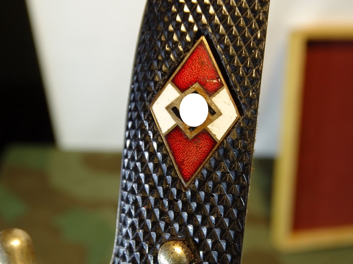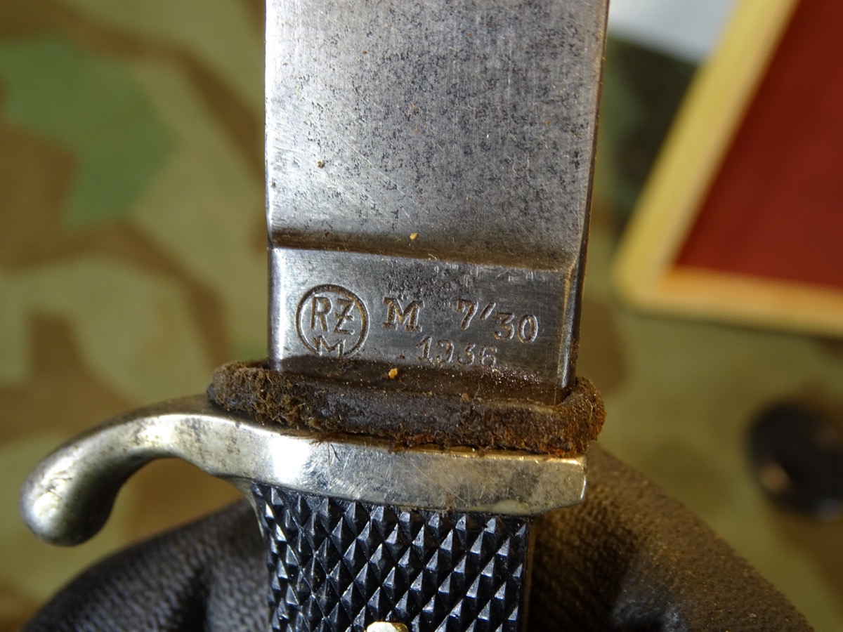 Mit seltener Träger Gravur "Erich Kern" in alter deutscher Sütterlin Schrift. Metallgriff mit größtenteils gut etrhaltener Vernickelung. Griffschalen gut erhalten, ein paar Tragespuren. Typische Neusilber Nieten. Griffemblem original eingesetzt, lässt sich etwas bewegen, also verklammert, nicht geklebt. Emaille des Emblems mit Alters- und Nutzungsspuren. Ein kleiner Emailchip in der roten Emaille- siehe Fotos, HK mit oberflächlichen Abplatzern in der Emaille aber noch durchgehend schwarzer Grund, so daß es nur bei ganz naher Betrachtung sichtbar ist. Klinge gut erhalten, blank, normale Nutzungsspuren. Auf Klingenanfang mit RZM M 7/30 1936 , auf Klingenmitte mit geschlagenem Doppelhersteller: " G.Gräfrath Solingen " Scheide in sehr gutem Zustand. Vielleicht daher im Laufe der Nutzung mal neu lackiert worden. Sauber gemacht, kann auch Originallack sein. Lederhänger gut erhalten. Leder gefettet und beweglich, oberflächliche Altersspuren. Zustand siehe Fotos. Bei Bestellung bitte Altersnachweis senden oder mailen ( Kopie vom Personalausweis)