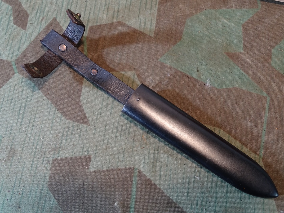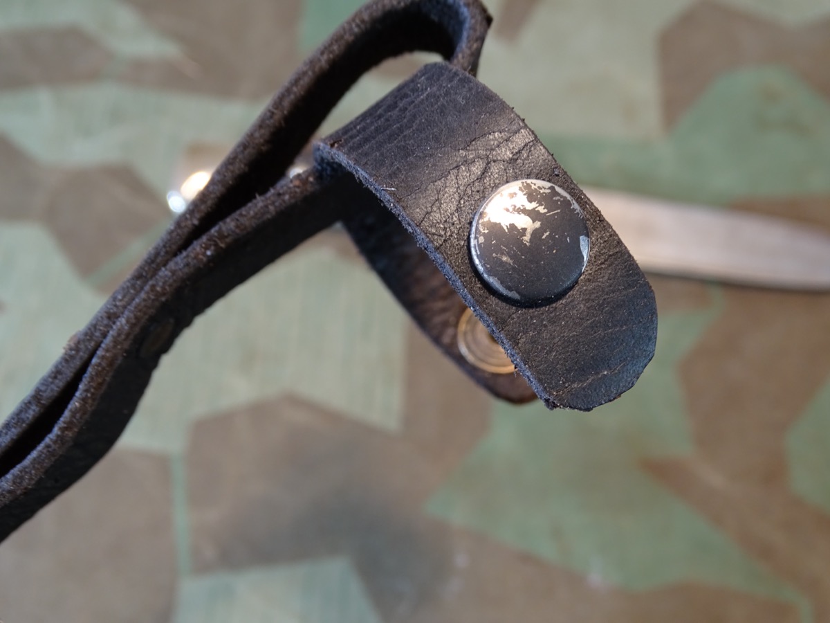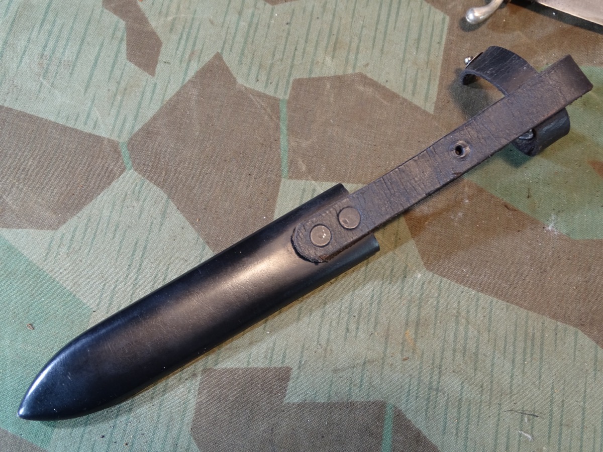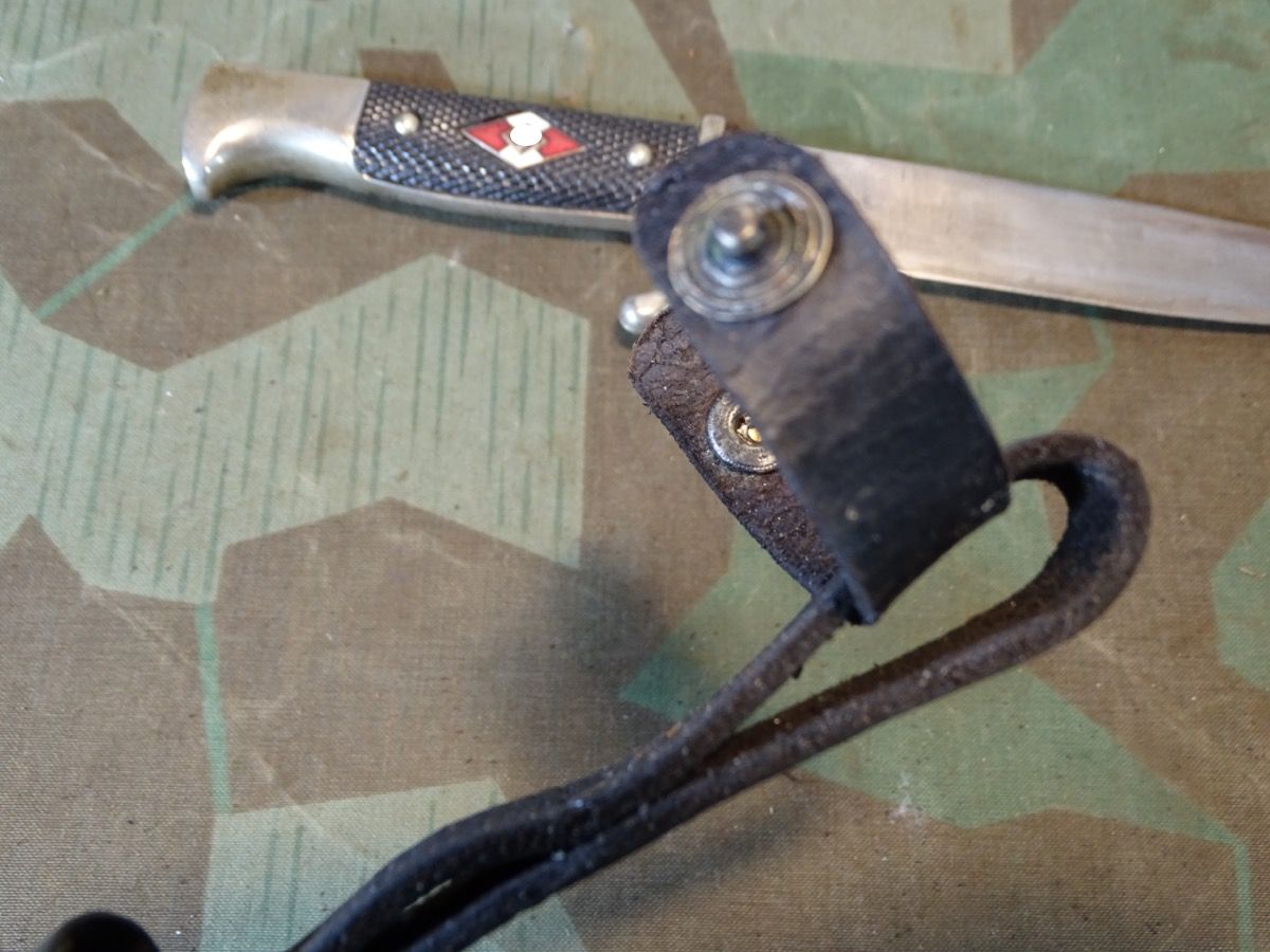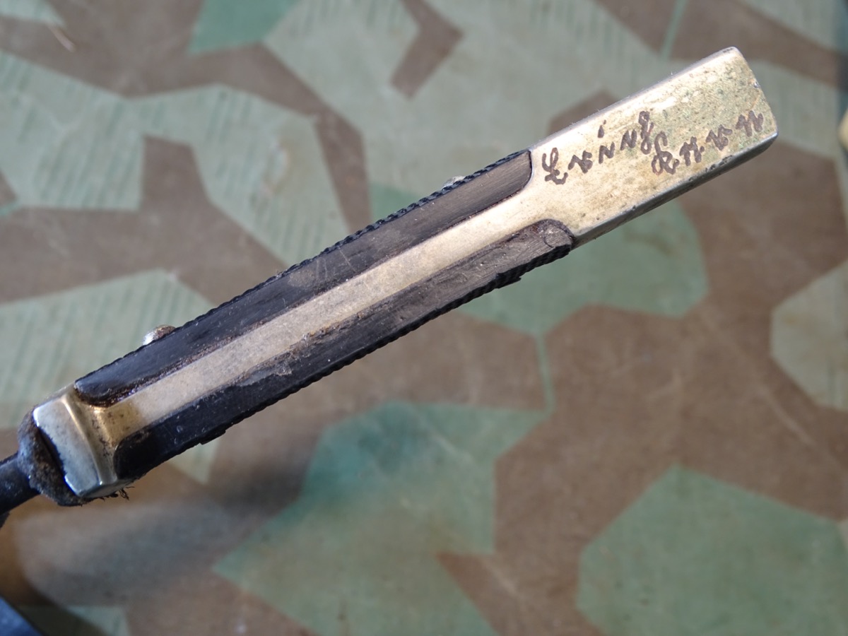 Mit seltener Träger Gravur "Erich Kern" in alter deutscher Sütterlin Schrift. Metallgriff mit größtenteils gut etrhaltener Vernickelung. Griffschalen gut erhalten, ein paar Tragespuren. Typische Neusilber Nieten. Griffemblem original eingesetzt, lässt sich etwas bewegen, also verklammert, nicht geklebt. Emaille des Emblems mit Alters- und Nutzungsspuren. Ein kleiner Emailchip in der roten Emaille- siehe Fotos, HK mit oberflächlichen Abplatzern in der Emaille aber noch durchgehend schwarzer Grund, so daß es nur bei ganz naher Betrachtung sichtbar ist. Klinge gut erhalten, blank, normale Nutzungsspuren. Auf Klingenanfang mit RZM M 7/30 1936 , auf Klingenmitte mit geschlagenem Doppelhersteller: " G.Gräfrath Solingen " Scheide in sehr gutem Zustand. Vielleicht daher im Laufe der Nutzung mal neu lackiert worden. Sauber gemacht, kann auch Originallack sein. Lederhänger gut erhalten. Leder gefettet und beweglich, oberflächliche Altersspuren. Zustand siehe Fotos. Bei Bestellung bitte Altersnachweis senden oder mailen ( Kopie vom Personalausweis)