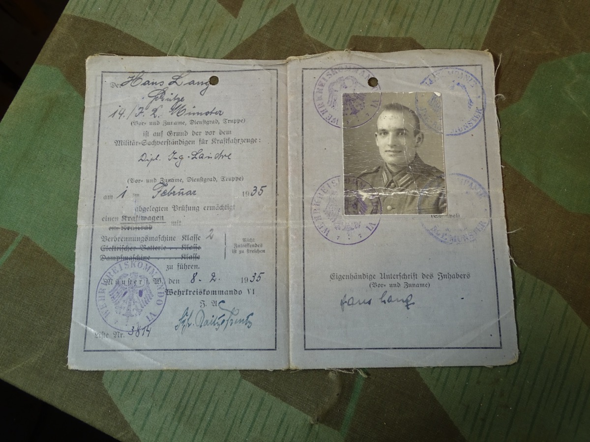 Früher Militär Führerschein 1935, Hans L. a.Kleve, 14 Kp. Inf. Rgt. Münster, Kl. 1+2, Halbkette bis 10 To. 1944