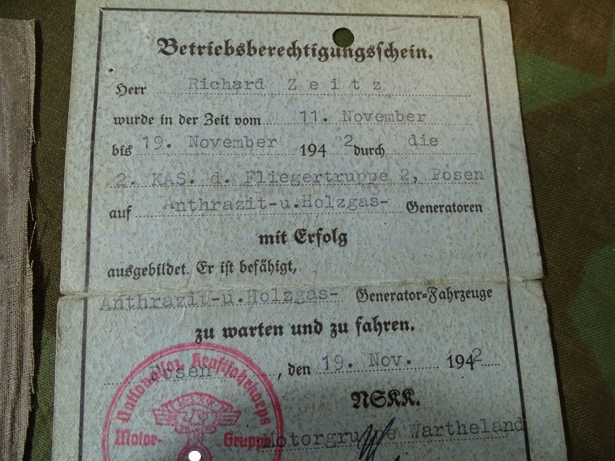 Führerschein Kl. 3 Königsberg /Pr. u. f. Anthrazit u.Holzgas Generator Kfz, NSKK/ NSFK Motorgruppe Wartheland