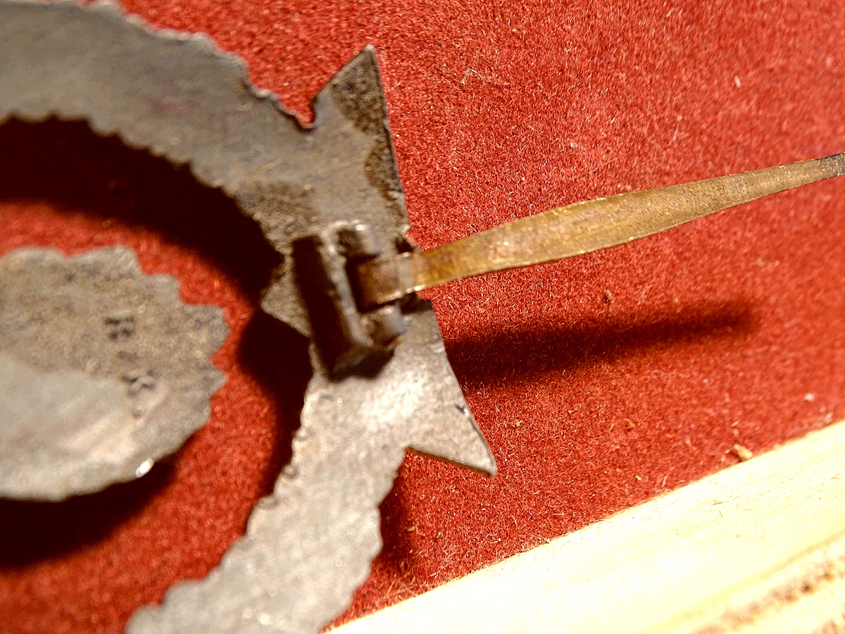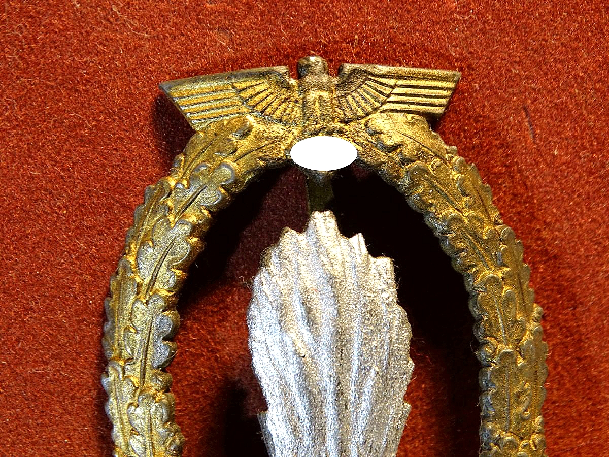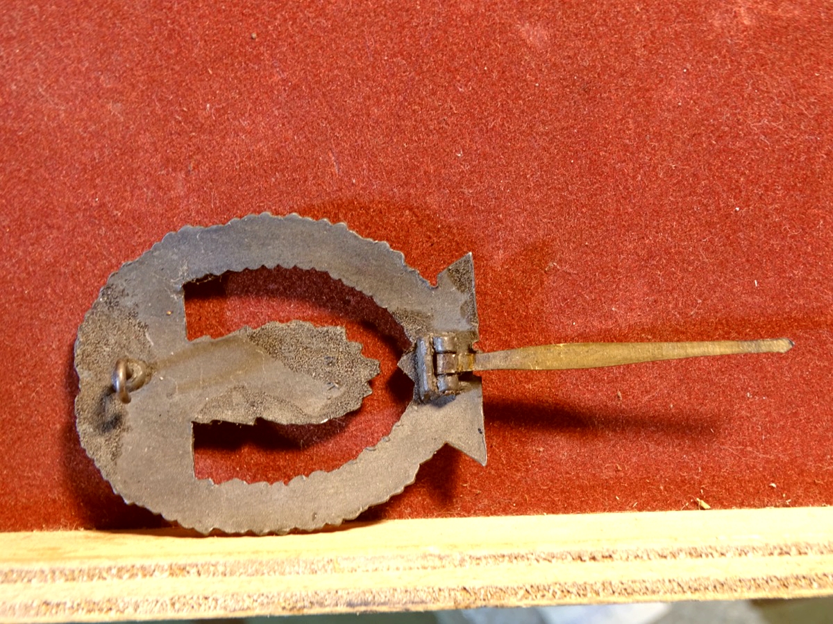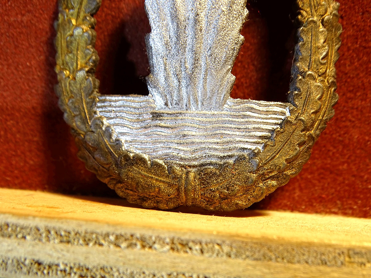 Minensucher-Kriegsabzeichen aus Feinzink, gute Erhaltung. Versilberung der Fotäne und Vergoldung des Randes noch schön erhalten. Schöne, breite Nadel. Getragen mit feiner gleichmässiger Patina.