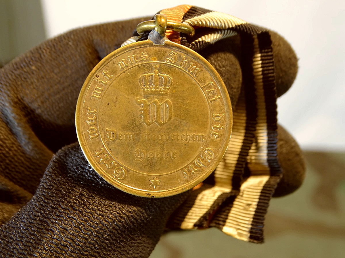 Kriegsdenkmünze für Kämpfer 1870-1871 für Kämpfer mit Randinschrift: "Aus erobertem Geschütz", am Band. (OEK 1941/1). Auszeichnung für alle Teilnehmer des Krieges 1870-1871, die an Gefechten teilnahmen oder in der Kriegszeit die Grenze zu Frankreich überschritten hatten. Am Ring etwas lot zu sehen. Wir können nicht sagen ob es eine etwas dickere Fabrikmäßige Lötung ist oder ein recht unauffällige, dünne, professionelle Nachlötung. Eine Reparatur der Öse würde meist dicker ausfallen, daher tendieren wir zu einer etwas größeren werkmäßigen Lötung. Zustand siehe Fotos.