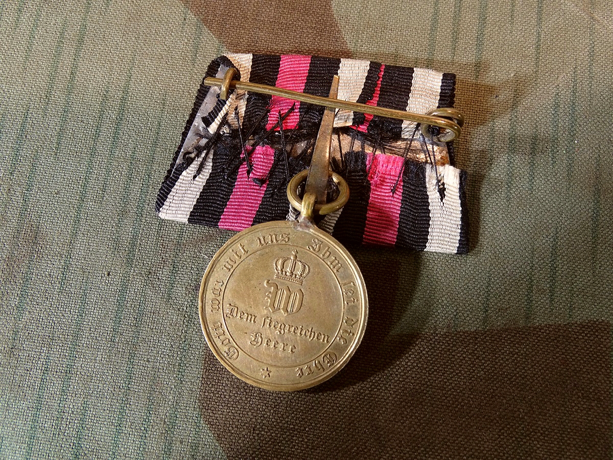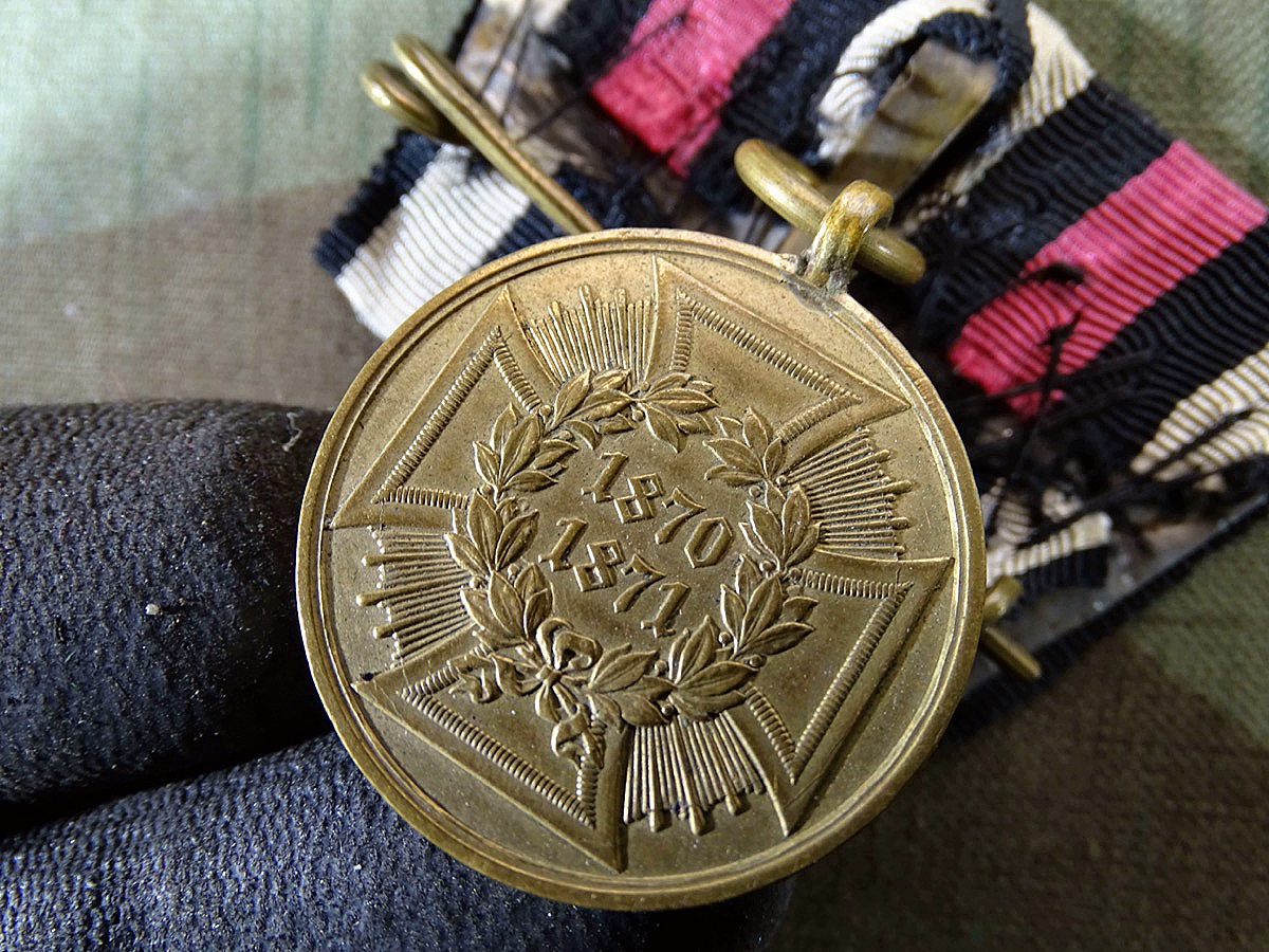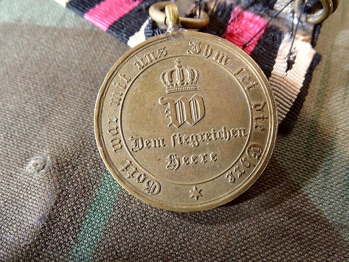Kriegsdenkmünze für Kämpfer 1870-1871 am Band. Mit umlaufender Randbeschriftung "aus erobertem Geschütz." Auszeichnung für alle Teilnehmer des Krieges 1870-1871, die an Gefechten teilnahmen oder in der Kriegszeit die Grenze zu Frankreich überschritten hatten. Zustand siehe Fotos.